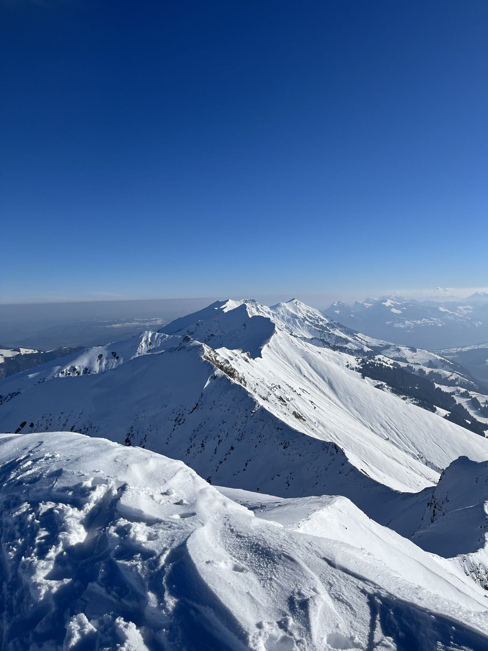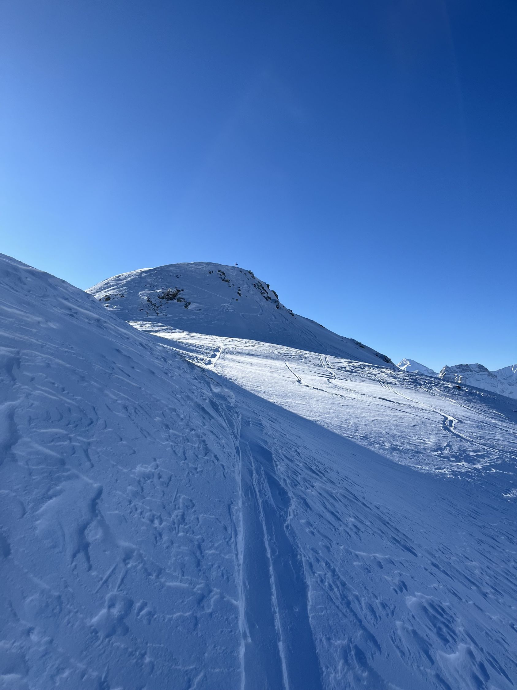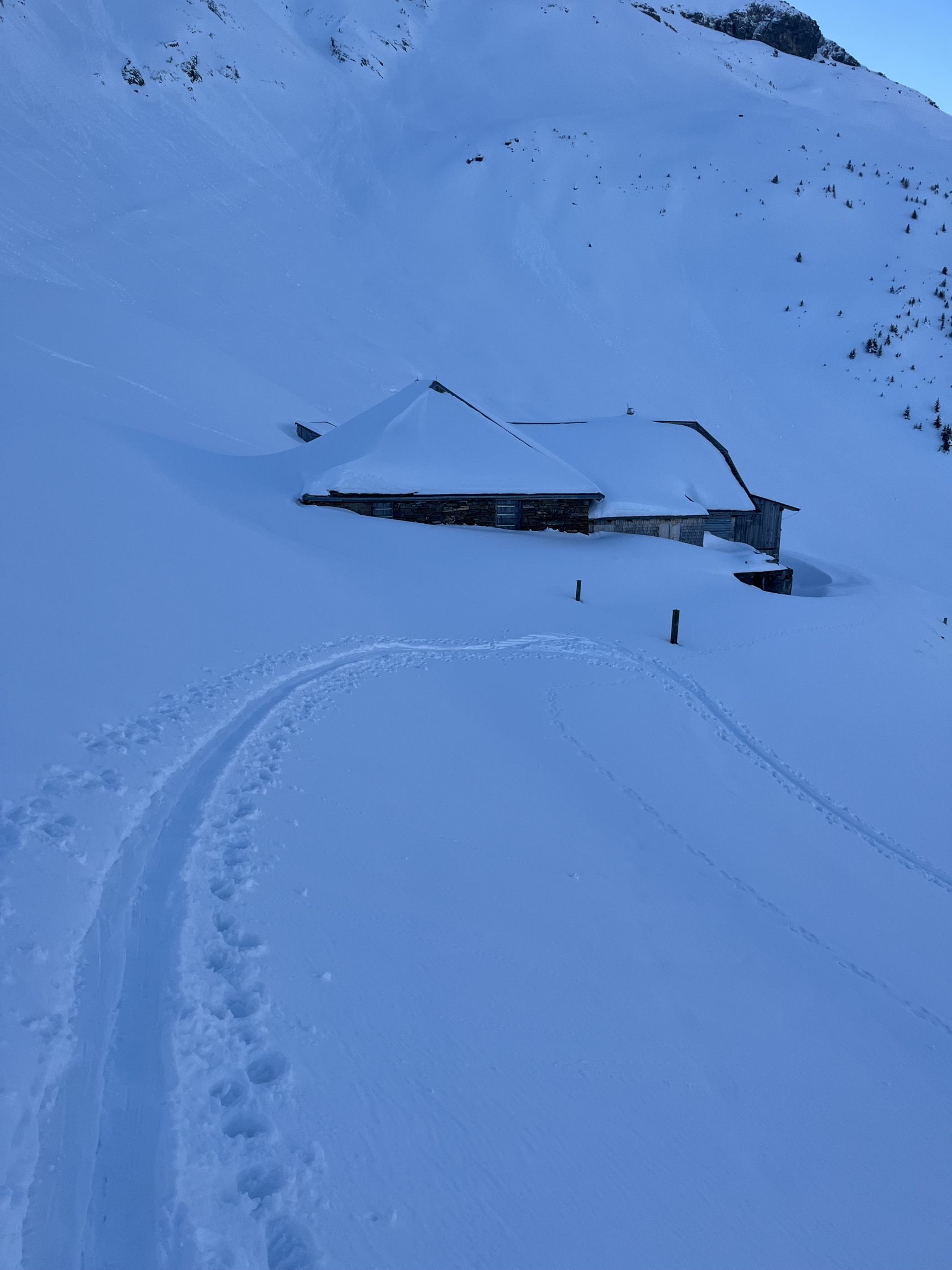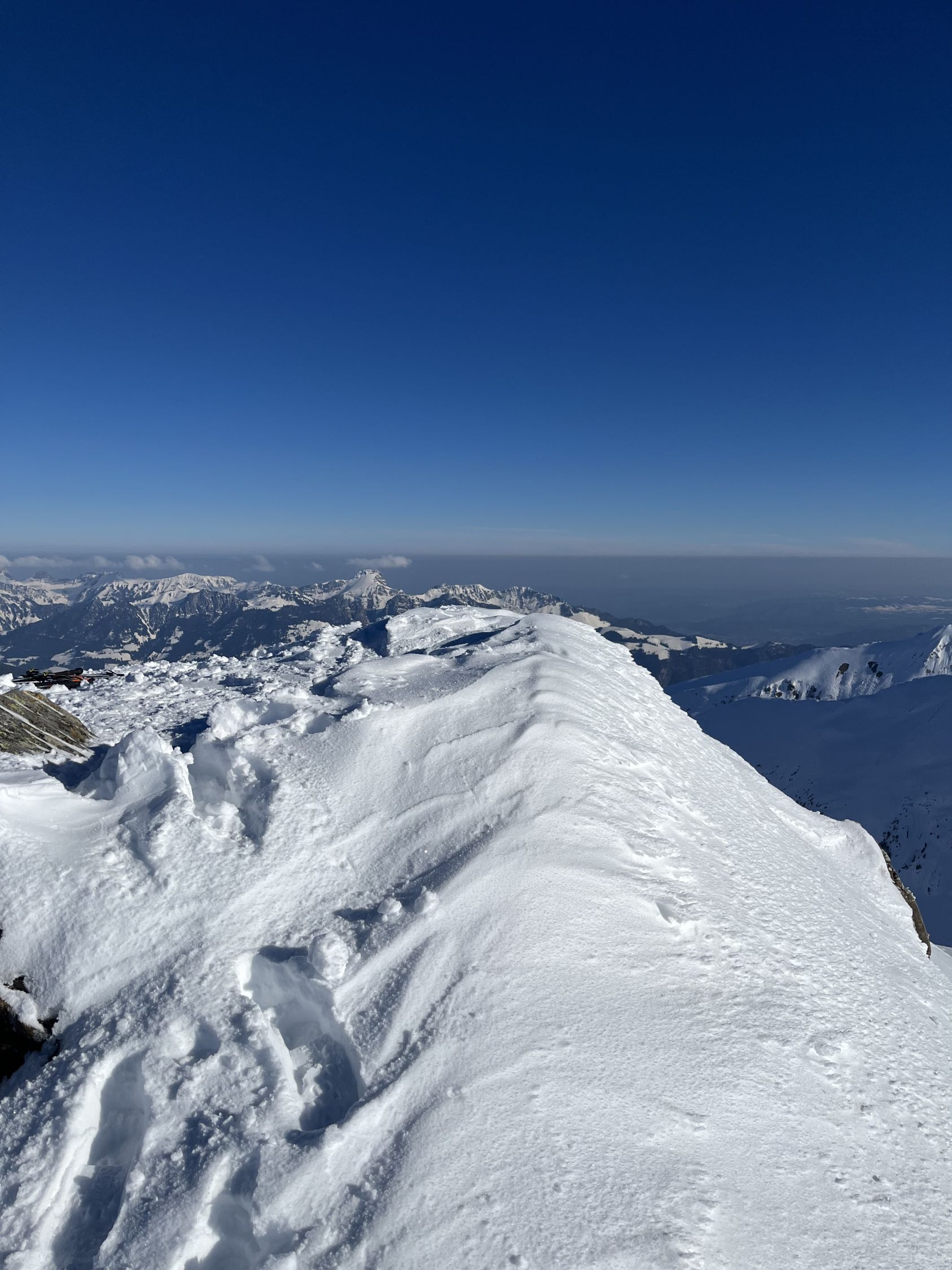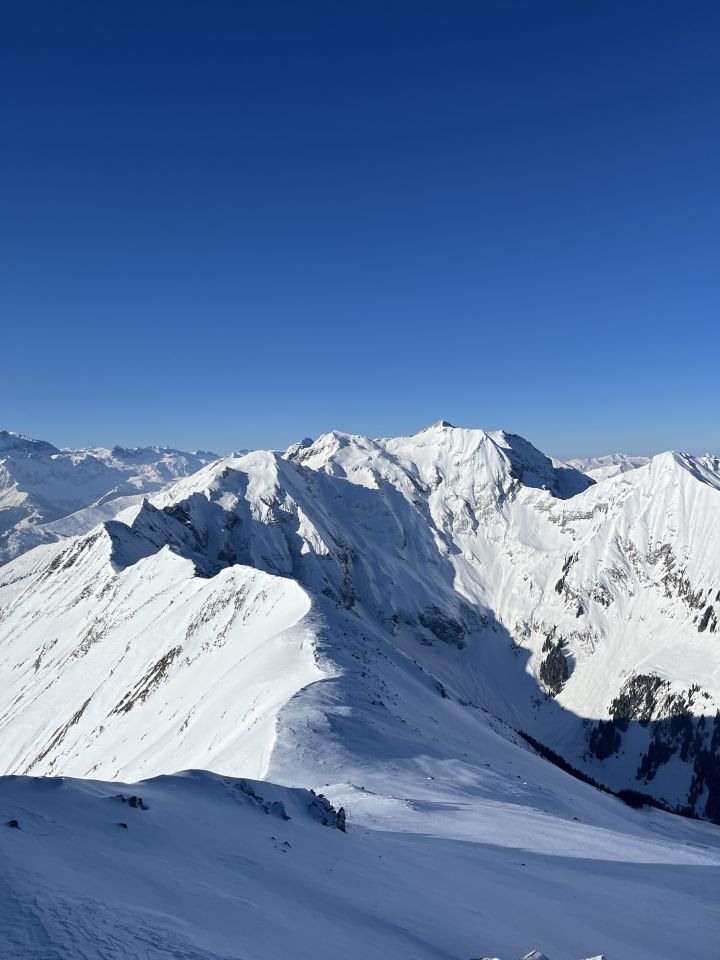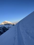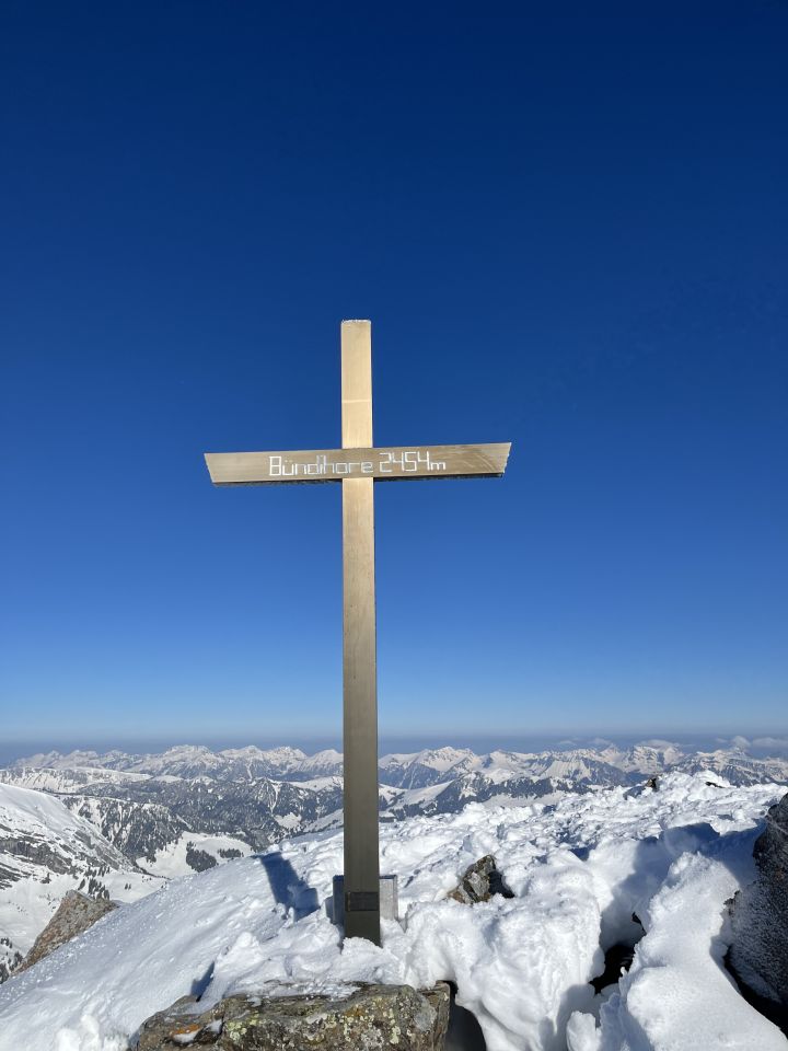 Bin um 6.30 Uhr bei -5 Grad im Chirel gestartet. Nach dem letzten ergiebigen Schneefall habe ich gedacht, dass ich nur bis Sagi fahren kann, deshalb ging ich so früh. Nun hat das Militär die Strasse geräumt bis Chirel. Auch der Parkplatz im Chirel ist gut geräumt. Es hat so viel Schnee wie kaum mal in diesem Winter. Deshalb wagte ich mich nicht alleine auf das Winterhorn. Als ich bei der Hohniesenhütte war, sah ich 5 Türeler Richtung Winterhorn aufsteigen. Das Couloir zum Winterhorn ist sehr gut eingeschneit. Die Aufstiegspur Richtung Bündihorn ist sehr gut gelegt. Habe erst auf dem Gipfel die Sonne gesehen (8.45 Uhr). Oben fast windstill und angenehm warm. Die Fernsicht war in der untersten Luftschicht etwas getrübt. Bei der Abfahrt, hat es oben noch etwas Pulverschnee, aber dann hatte es Bruchharsch. Wenn man in der Nähe des Waldes fährt findet man noch Pulverschnee bis unten. Es war eine traumhaft schöne Tour.