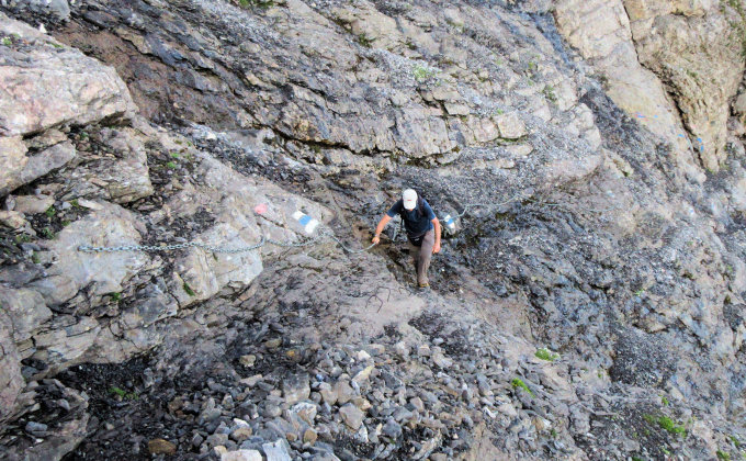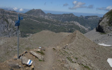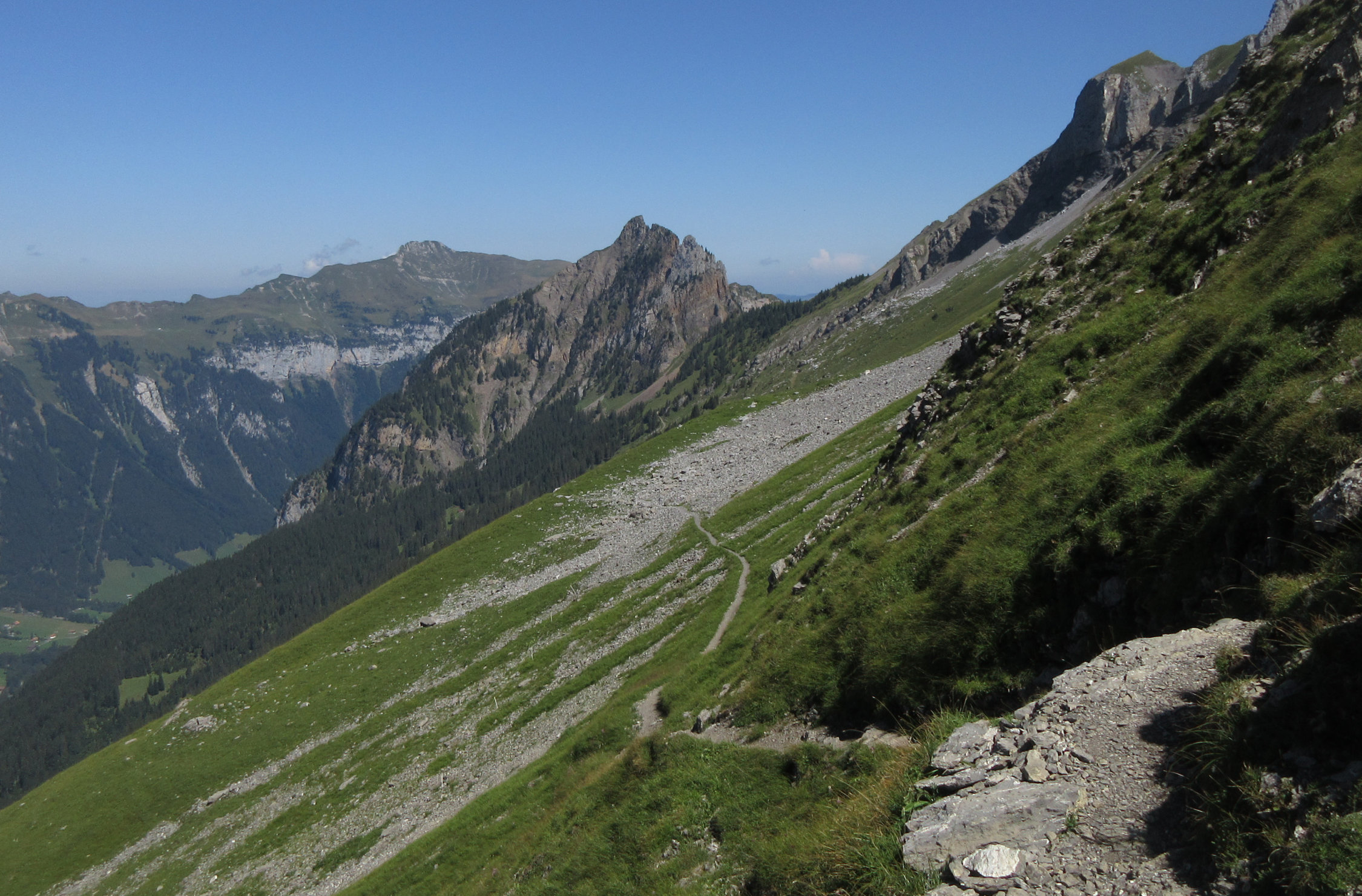 Wir nahmen die Querung auf den Wegspuren oberhalb der Biwaldalp auf ca 1850 m. Der Durchgang durch den Felsriegel enthält auf ca 3 m eine knackige, ausgesetzte Stelle.