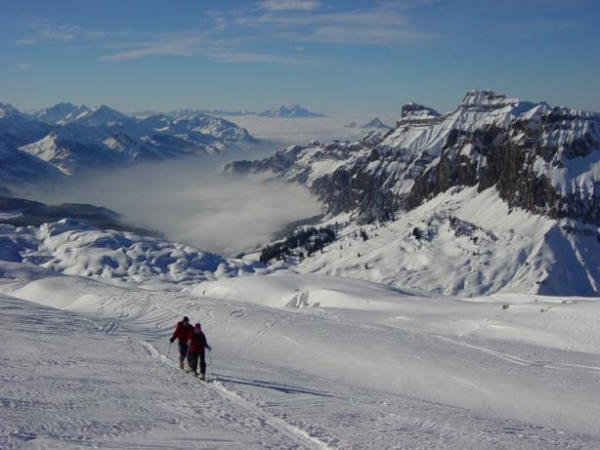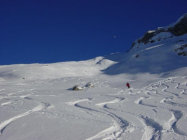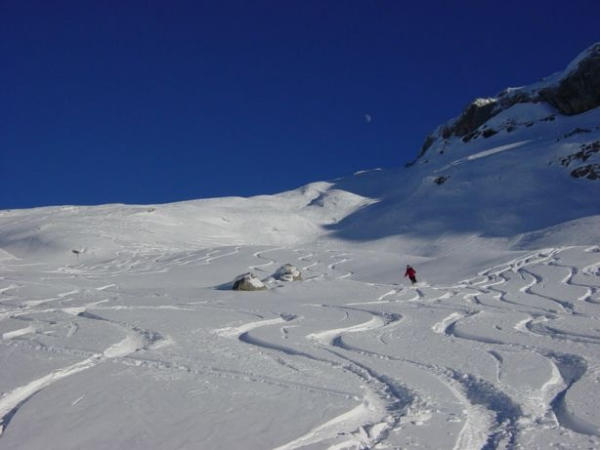 Vom Gipfel bis zum Pragelpass meist lockerer und sehr schön zu fahrender Pulverschnee, ganz selten Windharsch. Die Hänge sind schon ziemlich verspurt, es ist aber noch unverfahrener Schnee vorhanden.