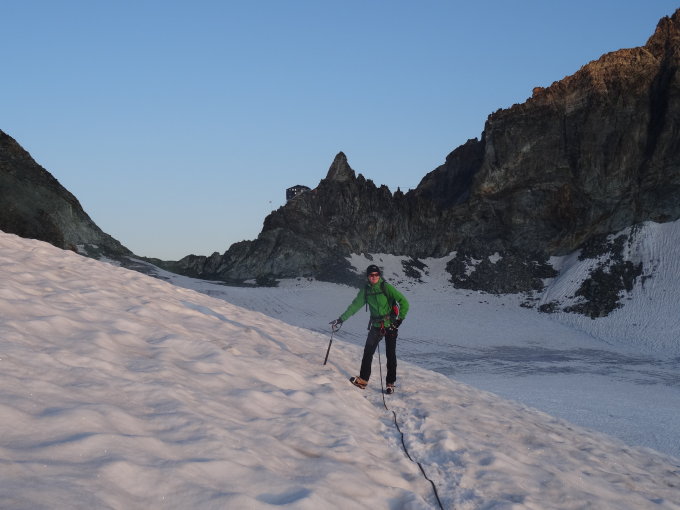 Zustieg Cab. Bertol akt. einige Firnfelder bis erster Felsriegel, der über Leitern und Stahlbügel sowie Drahtseil gesicher ist. Kurzes Firnfeld danach zunehmend bland. Dann erneut über Leitern zur exponierten Hütte. Sensational an der Berg gebaut.