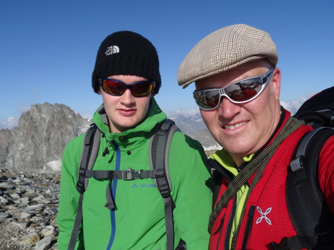 Start 6:15 bei Dämmerung auf Cab Bertol. Über Leitern und eine Querung mit Fixdrahtseil 40m hinab auf den Glacier du Mont Mine. Gletscher nach klarer Nacht gut durchgefroren. Einige Spalten bei Querung unter P. 3229 bis ca. tiefster Punkt ca 3190m. Anstieg ohne Probleme bis Gipfel 3Std (9:15). Abstieg gleiche Route, vorsichtiger bei Spalten. 2 Std. bis Cab.Bertol.