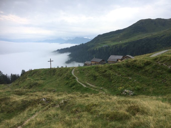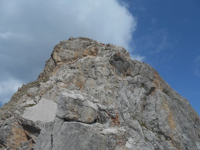 Die Nässe vom Gewitterregen am Vorabend störte nicht mehr. Zustiegswege und Kletterfels waren gut aufgetrocknet. Oberhalb vom Zimbajoch war es angenehm kühl und die Sonne strahlte von einem fast wolkenfreien Himmel. Wir sind gut und ohne nennenswerte Staus durch die Kletterabschnitte gekommen. Eine größere Gruppe wählte die Umgehung der Sohmplatte. Die konnten wir auf dem 'Verbindungsgrat' bereits hinter uns gelassen. Beim Abstieg vom Zimbajoch bildeten sich Quellwolken Richtung Arlberg hin. Wir hatten wegen einem möglichen Gewitter keine Sorge und kamen trocken beim Alpengasthaus Rellstal an.