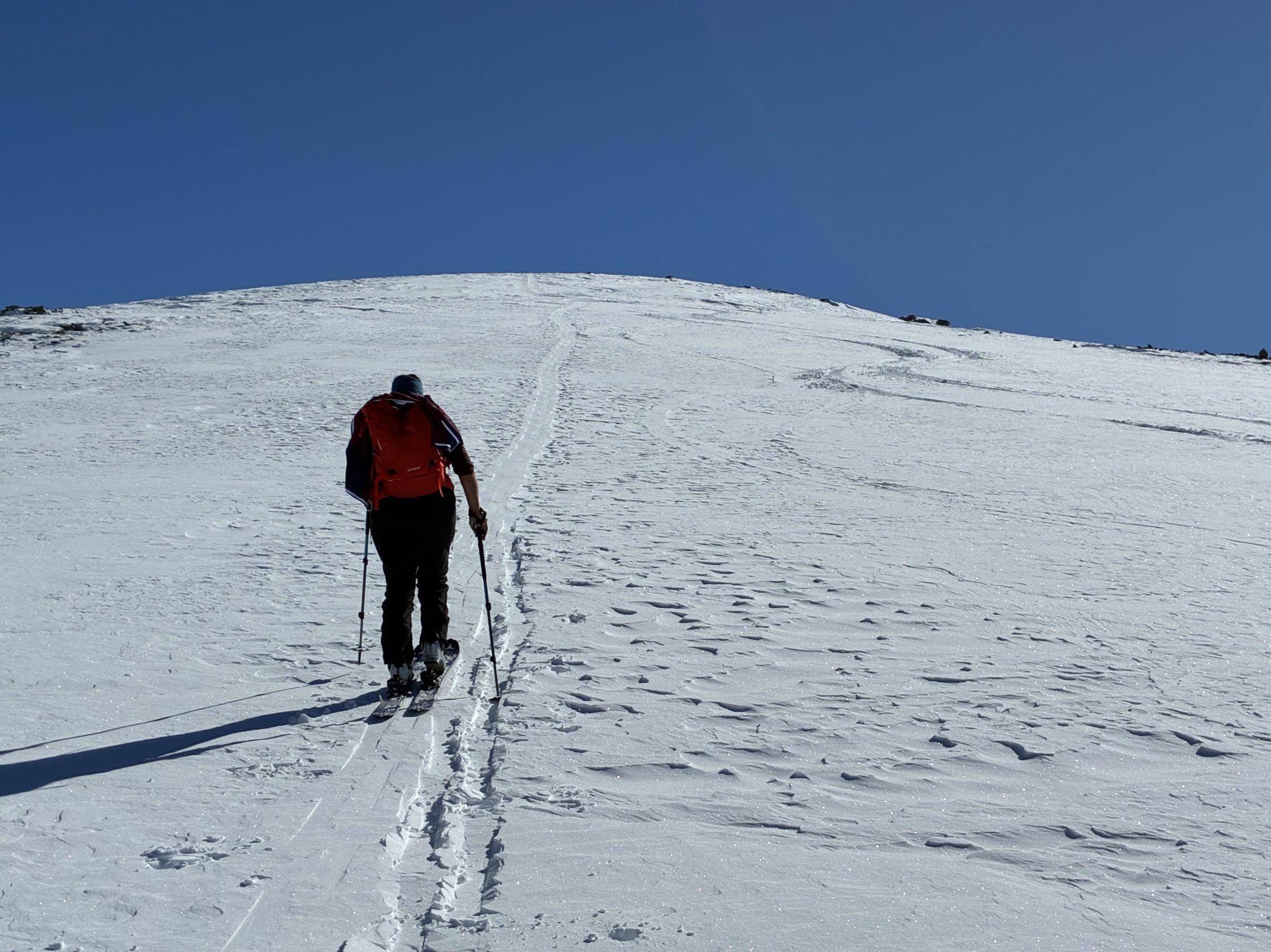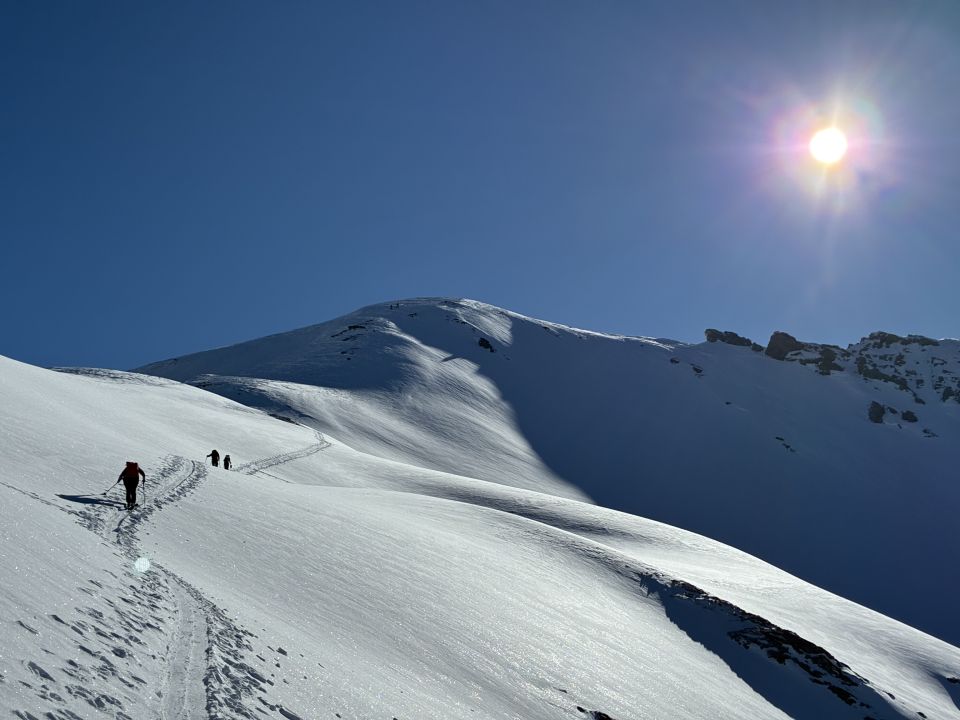 Die Aufstiegsspur ist etwas steil und im windverblasenen Schnee manchmal rutschig, ging aber gut ohne Harscheisen.