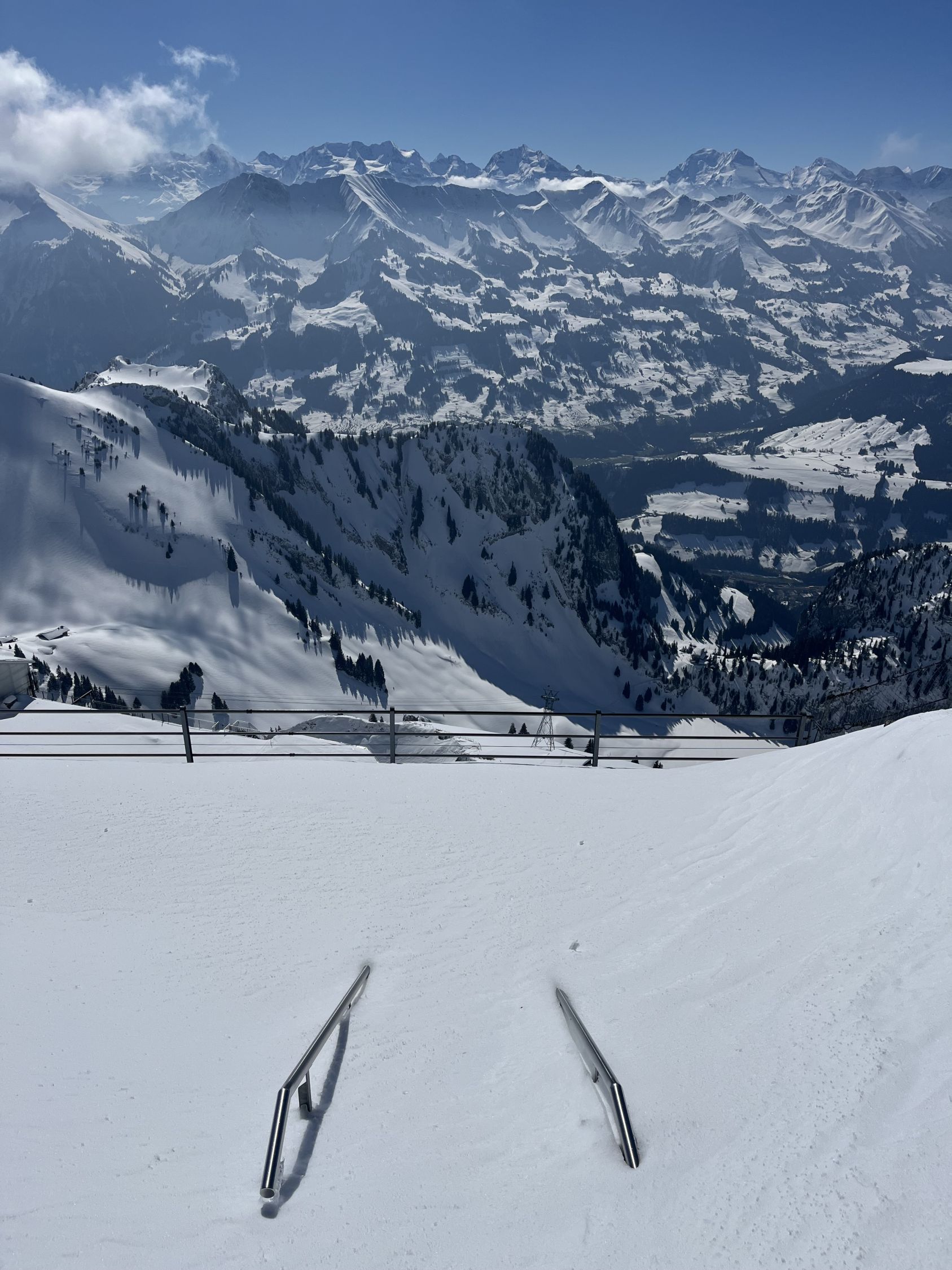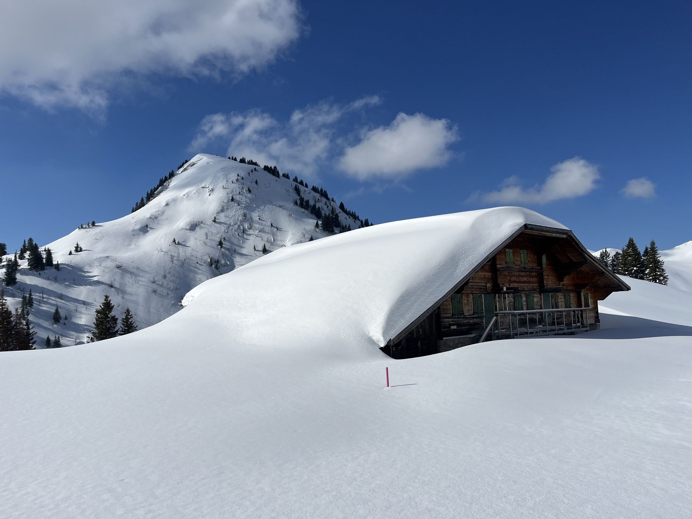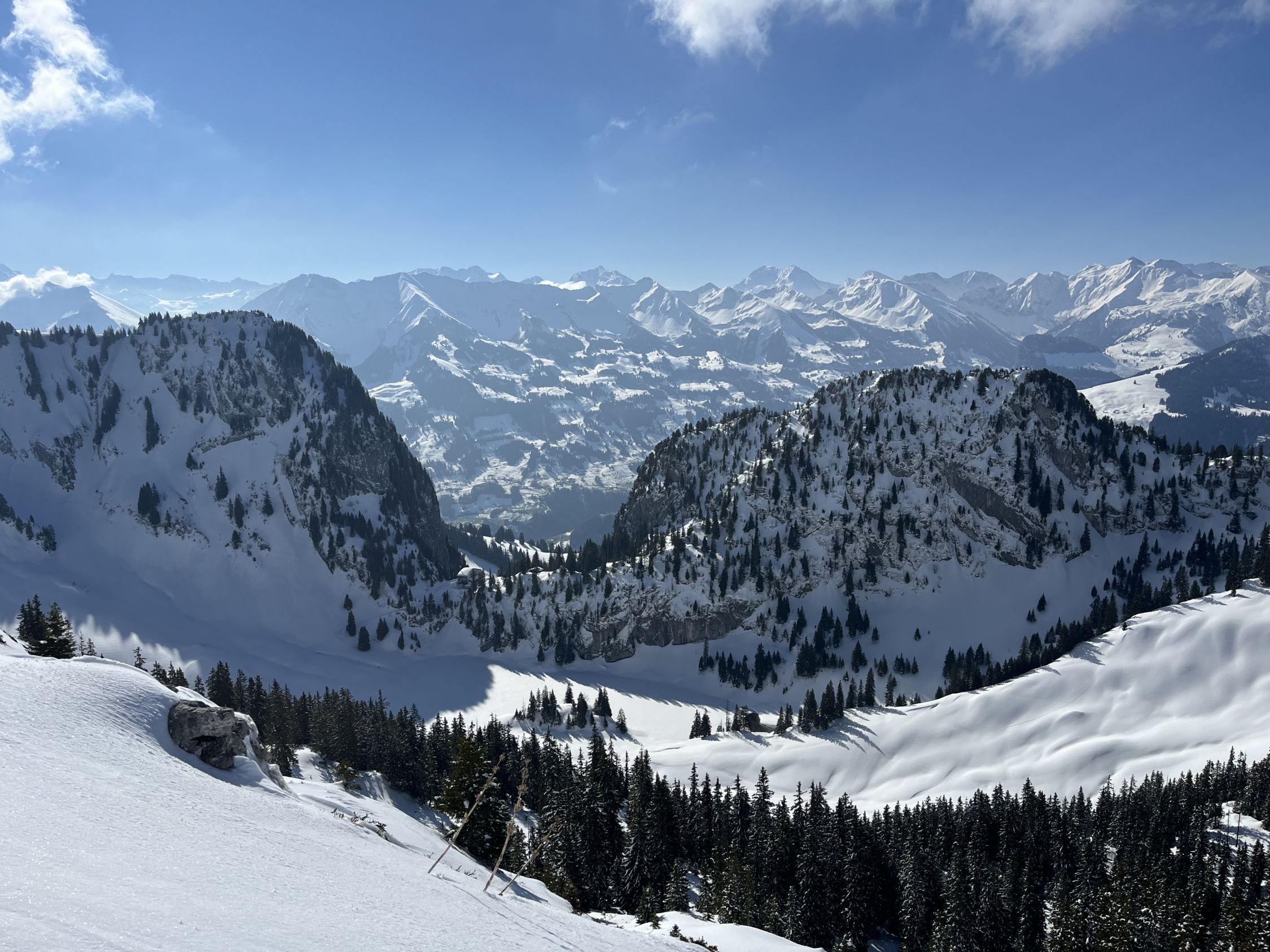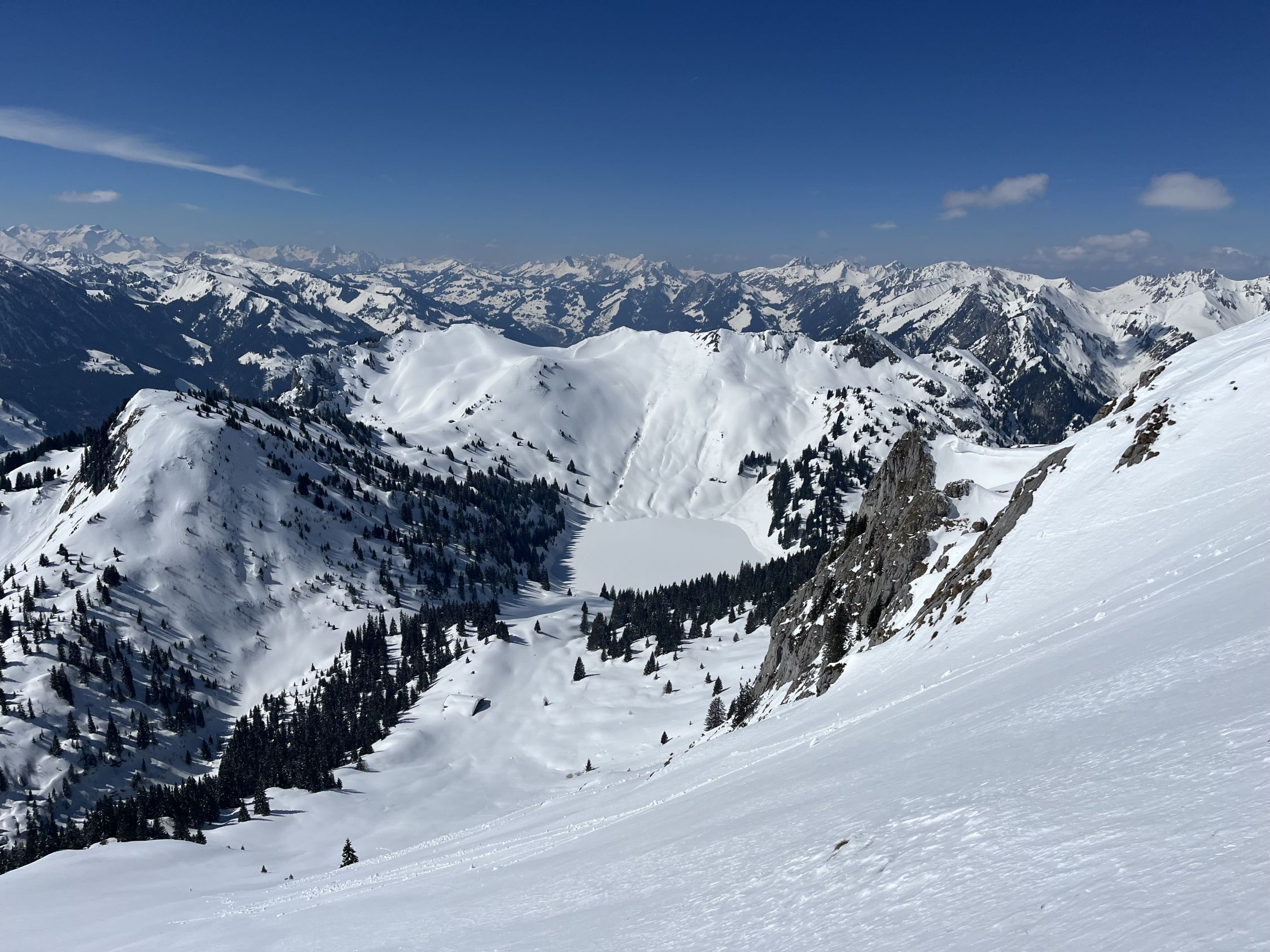 Meist tragender Deckel bis etwa 1700 m, dann zunehmend Bruchharsch an besonnten Hängen. Gute Verhältnisse für die Nordseite des Stockhorns (Steigeisen nicht nötig). Toller Pulverschnee im Chrümmelwägenhang. Unter 1400 m zunehmend feucht und knapp. Ende Schnee auf etwa 1200 m.
