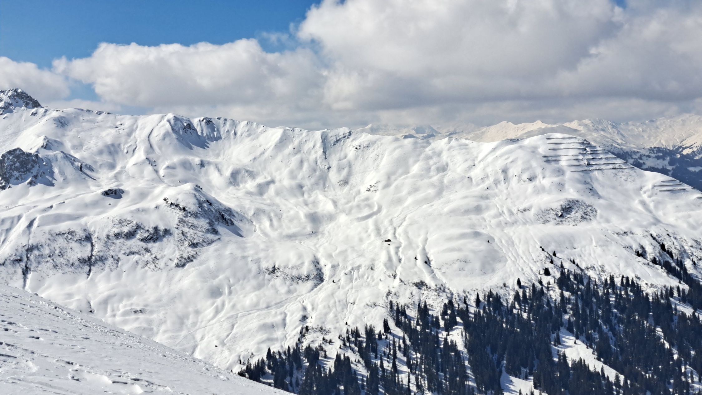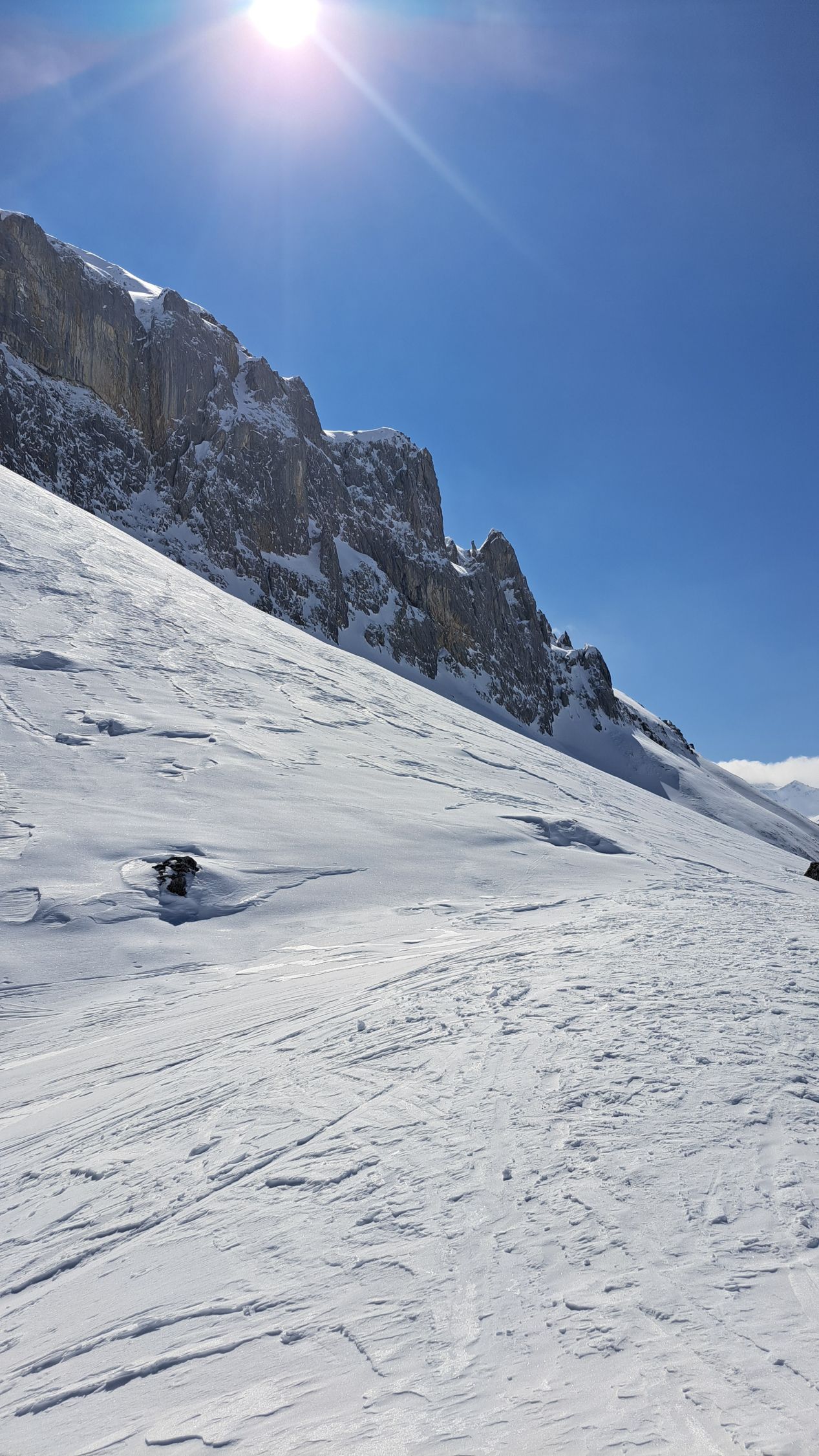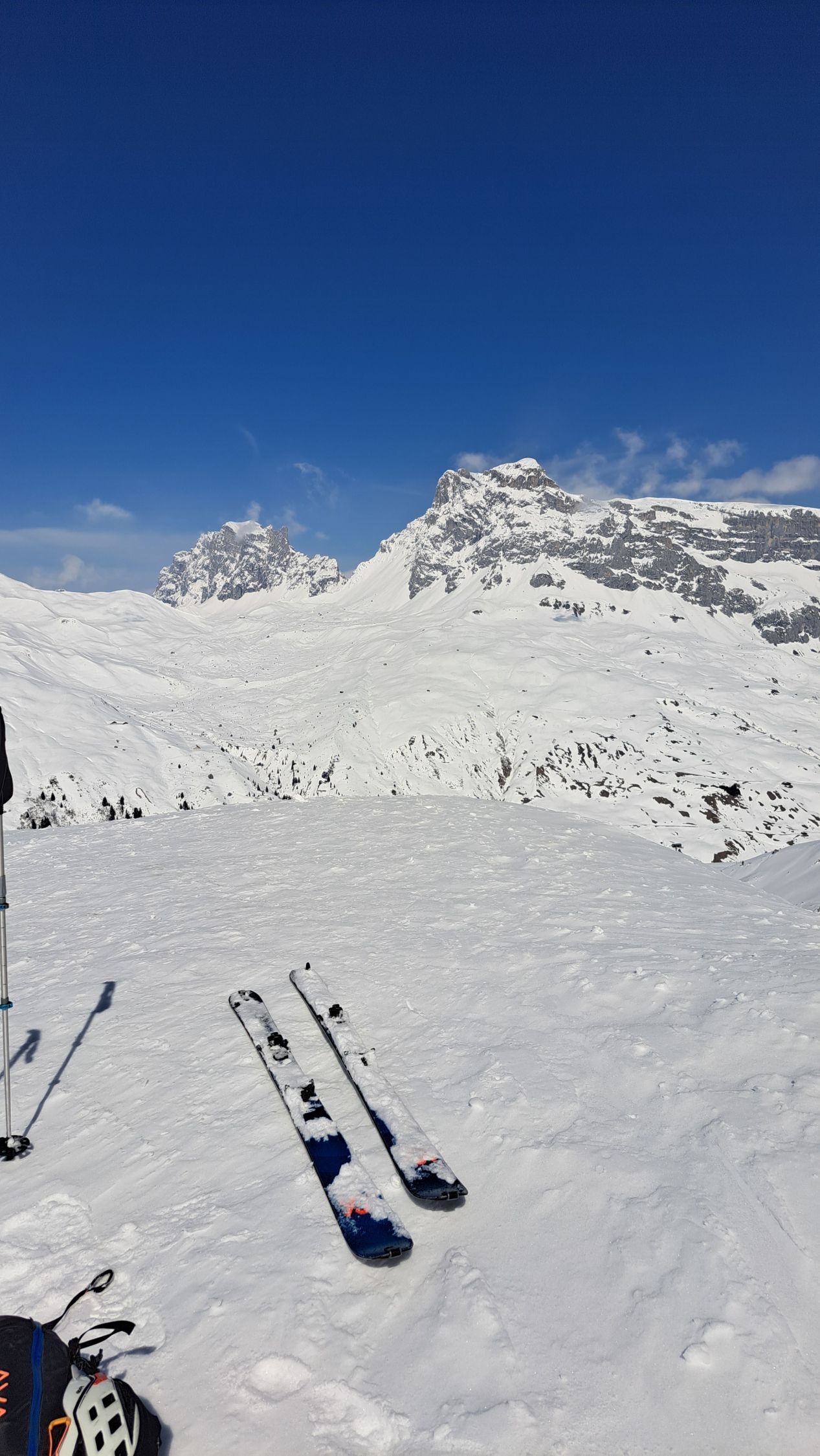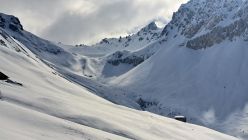 In der Abfahrt (nordseitig) ziemlich wechselnder Schnee. Pulver, mal gut, mal winbearbeitet und zwischendurch auch harte Stellen. Im ganzen Hang war wohl der Wind am Start.