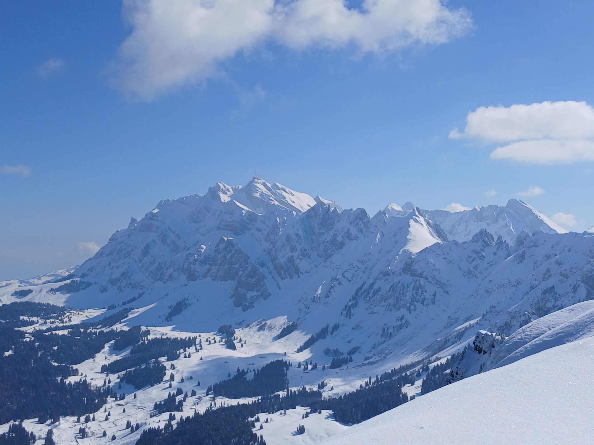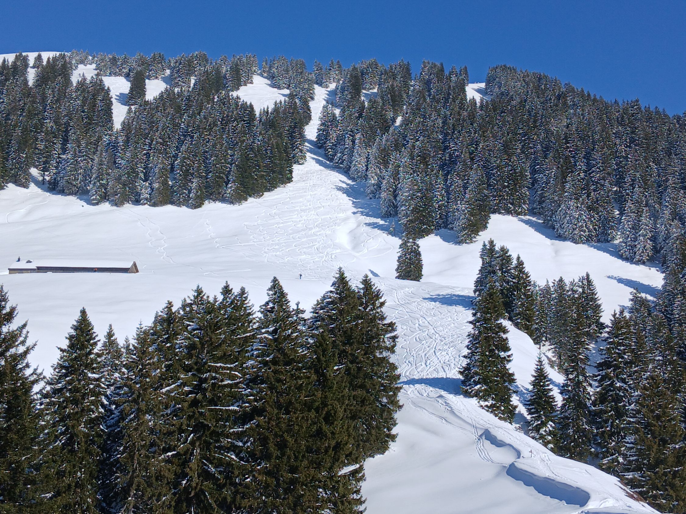 Start um 9 Uhr beim Schulhaus Stein und der Spur von yours truly vom Mittwoch entlang hoch bis Muggenboden, heute gedeckelt, dafür viel weniger mühsam. Lästig waren nur die Asi-Schneeschüehler, die partout die Spur mit ihren Löchern garnieren müssen. Ab Muggenboden dann neue Spur bis vor Unterchnü, dort die Vorspurer (merci!) überholt und selber gespurt bis zur Autobahn auf dem Risipassrücken. Gute Spur die Bergflanke hoch bis zum Grat, schöne Winterlandschaft (im April!), am Gipfel erwartungsgemäss viel Volk, windstill. Abfahrt um 11:45 in Begleitung eines netten Paares, welches sich fragte, wie man denn direkt nach Stein hinunter komme. Bergflanke hinunter zum Risipass oben noch mit Platz für eigene Schwüngen, unten dann arg zerwühlt, aber noch gut zu fahren. Ab Risipass links halten und über Ahorn nach Rueboden. Ab Rueboden dann steil genug für gute Schwünge in soviel Schnee, gegen das Dorf wird der Schnee schwer(er), aber man kann immer noch gut fahren (kein Deckel).