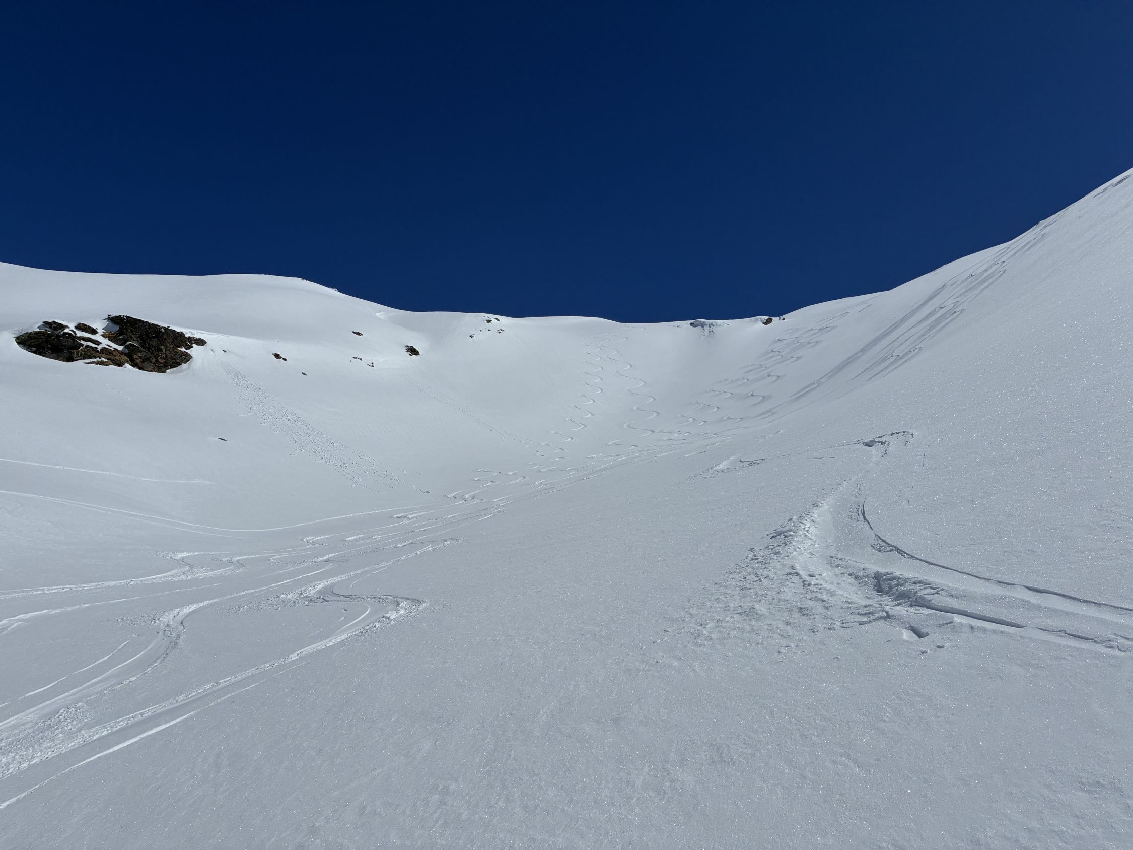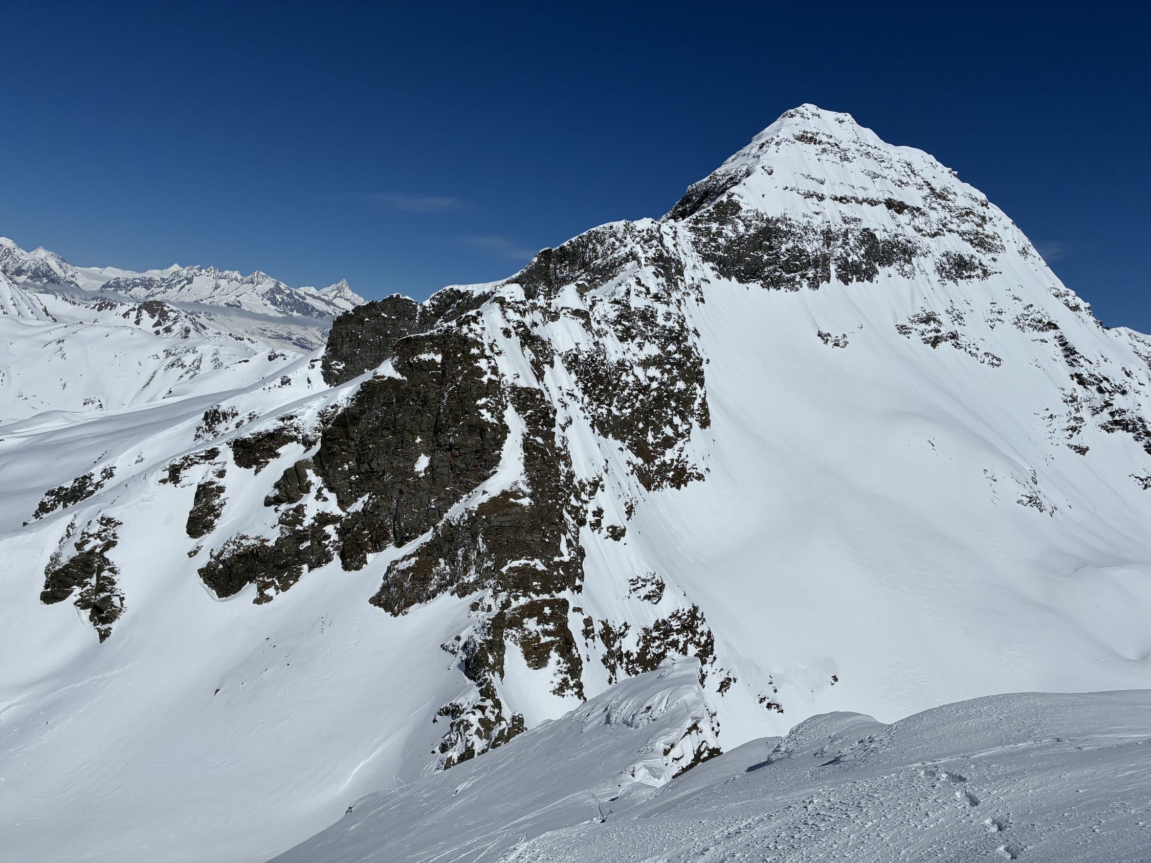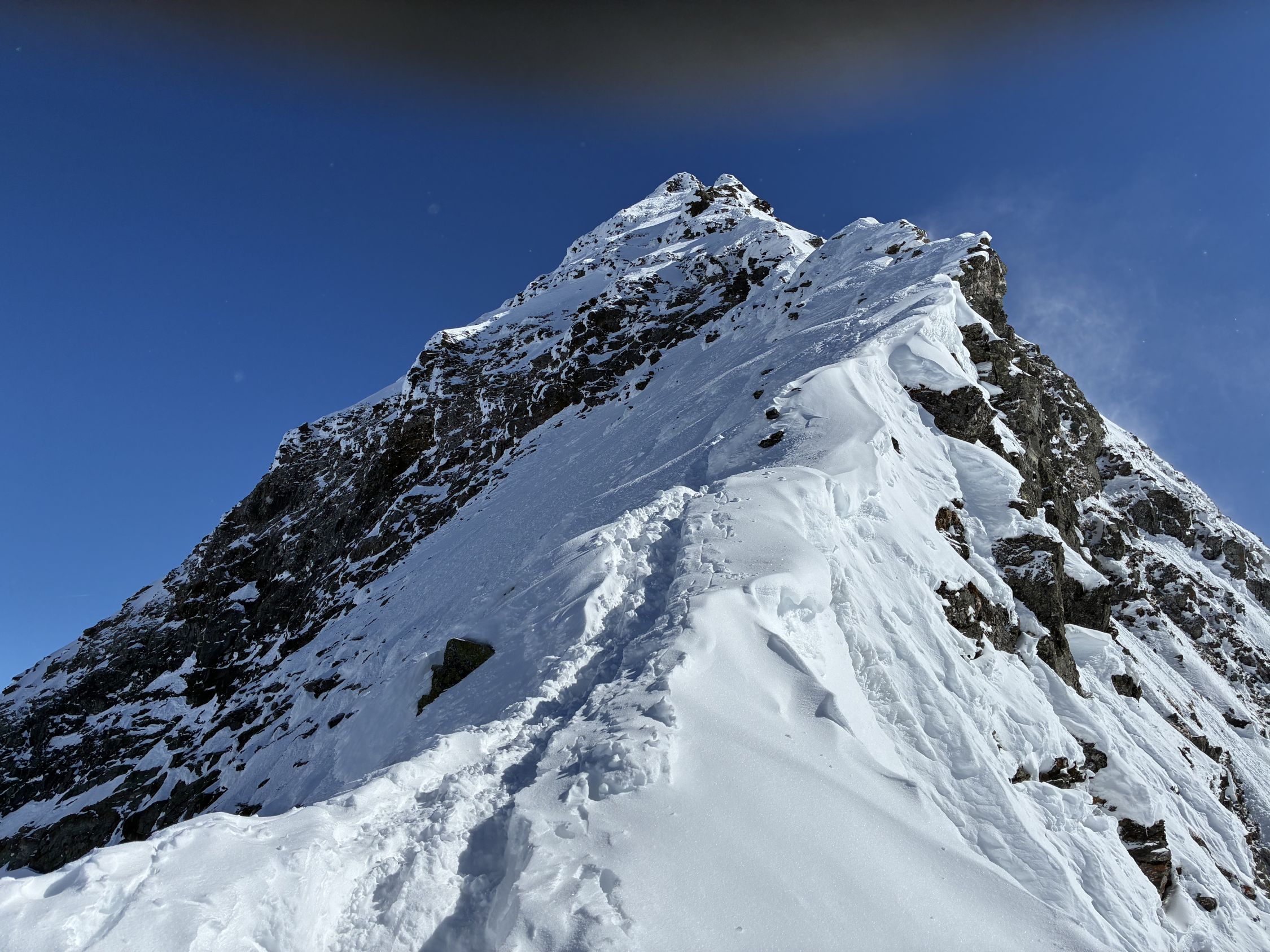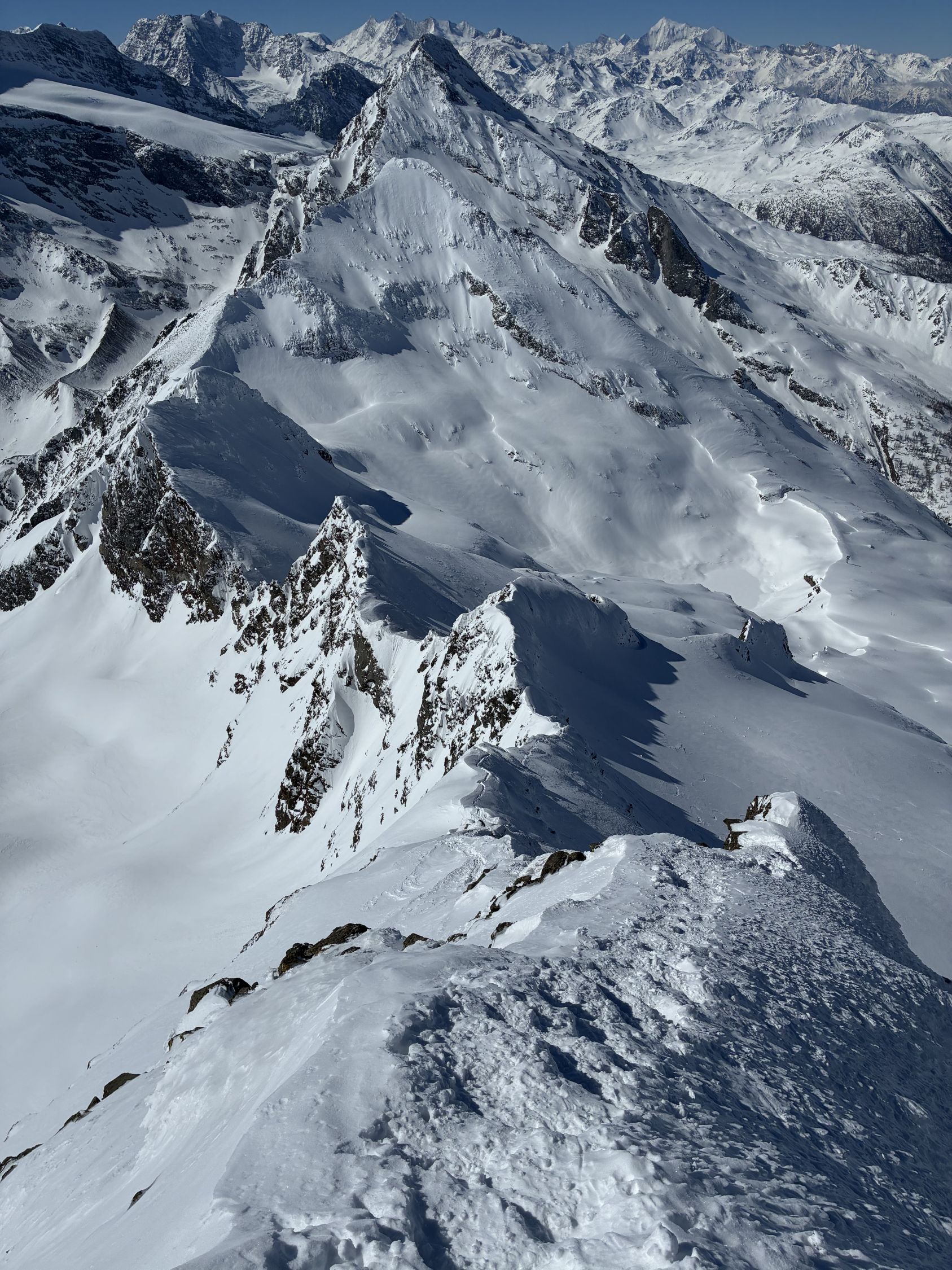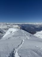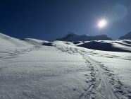 Start Berisal um 8 Uhr bei -3 Grad. Verhältnisse top, Schnee vom Parkplatz weg. Harte Spur im Couloir/Wald unterhalb Bortelhütten, hier durchaus Absturzgefahr. Ab 2300 m dann gleichmässige Spur im homogenen, 10 cm tiefen, windverfrachteten Pulverschnee. Fussaufstieg ab Skidepot auf guter, aber tiefer Spur. Aktuell sehr wenig Felskontakt. Gut machbar ohne Seil, Pickel & Steigeisen aber zwingend. Sehr kalter Wind am Gipfelgrat. Seidenweicher Pow in der Abfahrt bis Bortelsee, Wiederaufstieg gegen Bortellicka, dort in den Ostgrat des Ganterhorns. Diesen noch bis zum östlichen Gipfelaufbau gespurt, dieser ist etwa 10 m niedriger als der Hauptgipfel P2858m. Das aktuell zu spuren wäre aber recht verwegen…