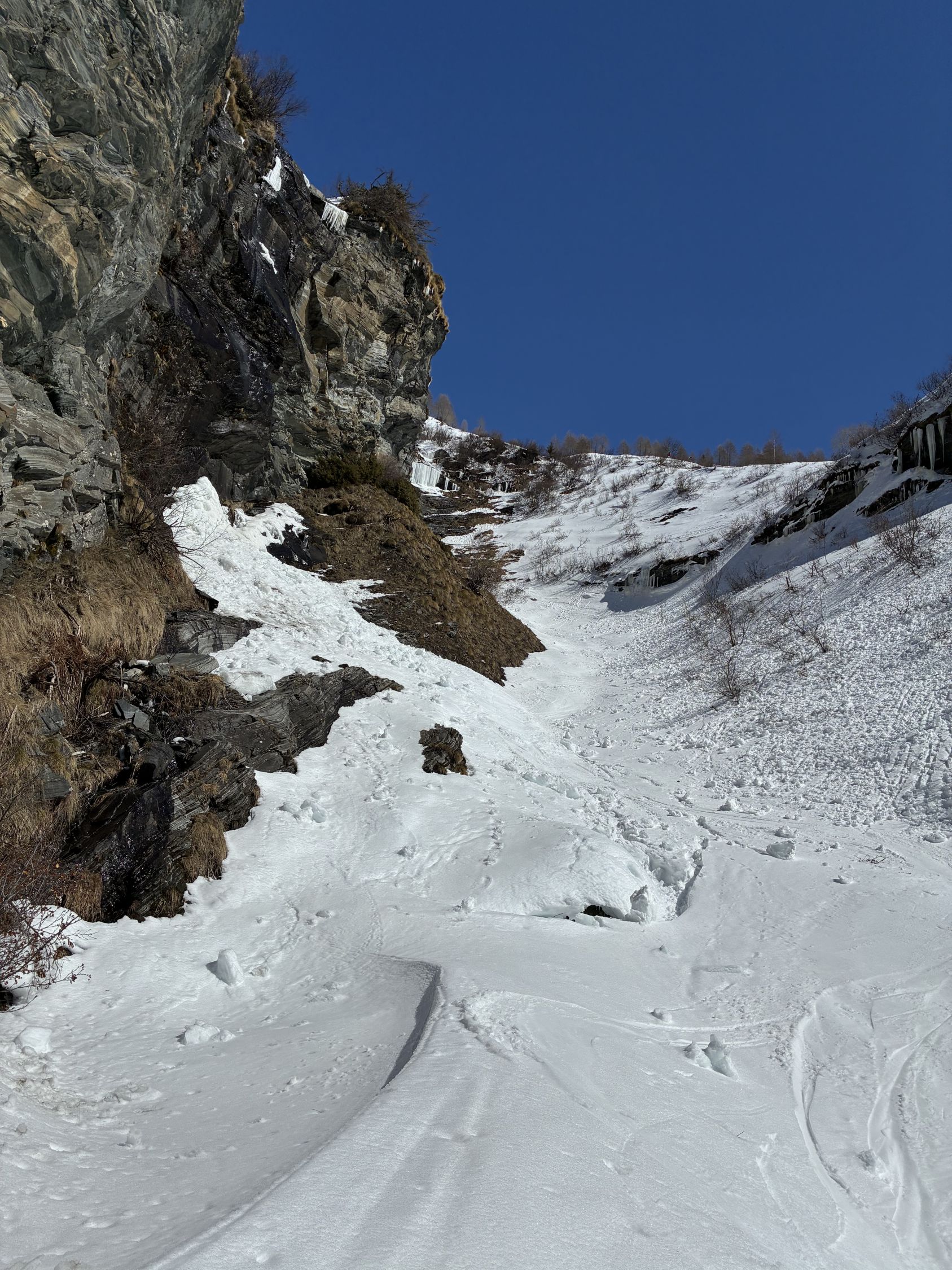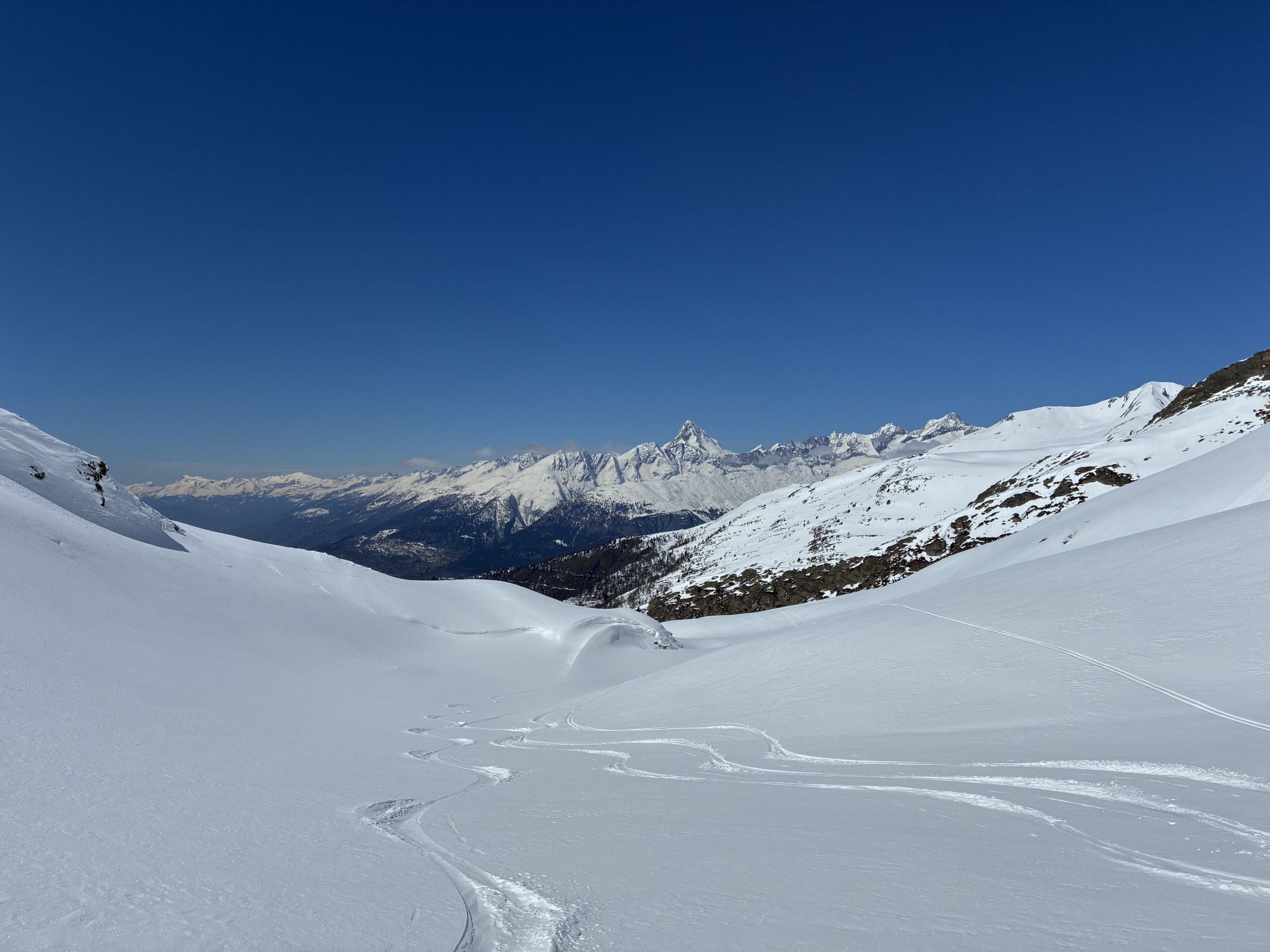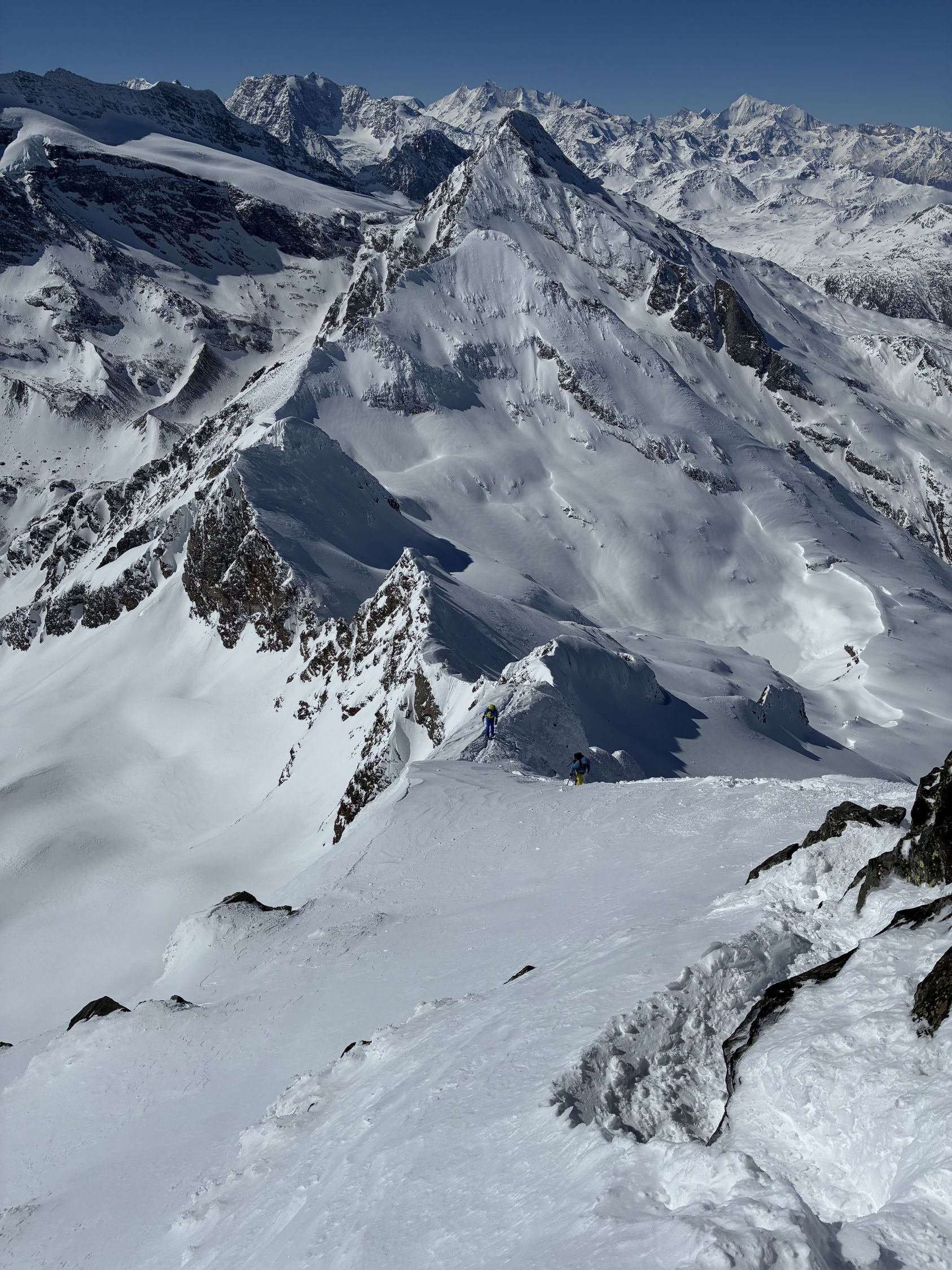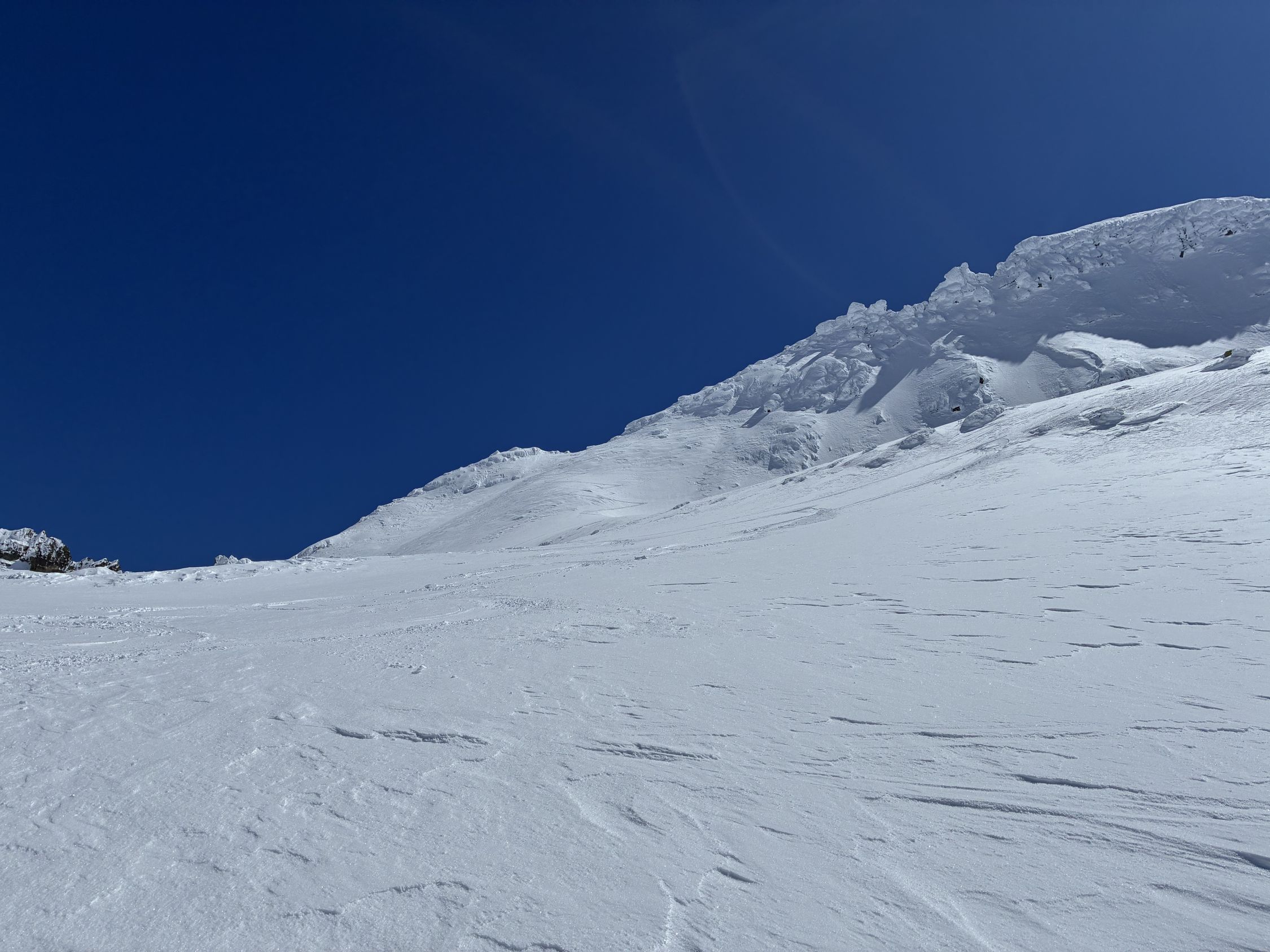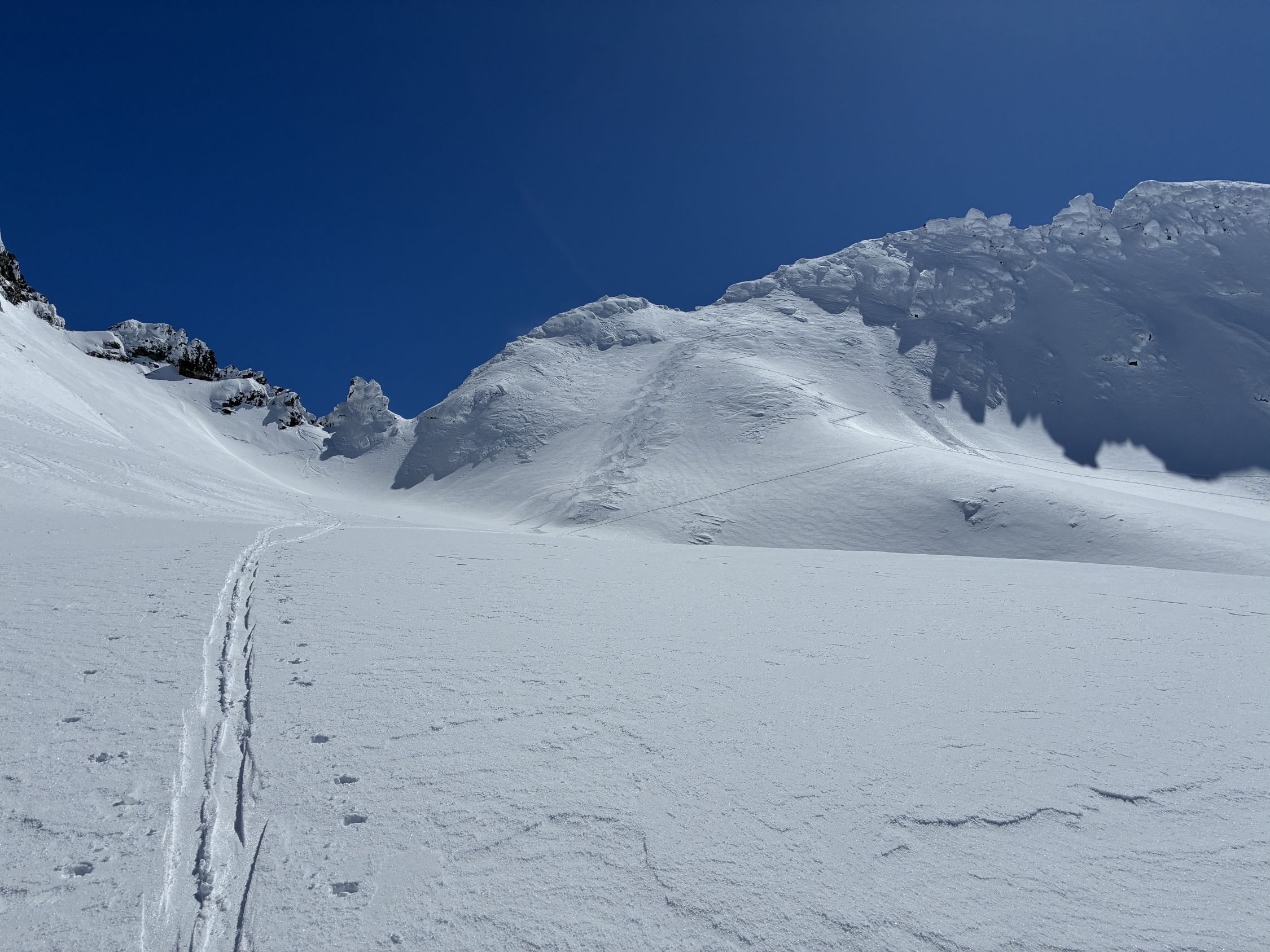 Start Berisal um 8 Uhr bei -3 Grad. Verhältnisse top, Schnee vom Parkplatz weg. Harte Spur im Couloir/Wald unterhalb Bortelhütten, hier durchaus Absturzgefahr. Ab 2300 m dann gleichmässige Spur im homogenen, 10 cm tiefen, windverfrachteten Pulverschnee. Fussaufstieg ab Skidepot auf guter, aber tiefer Spur. Aktuell sehr wenig Felskontakt. Gut machbar ohne Seil, Pickel & Steigeisen aber zwingend. Sehr kalter Wind am Gipfelgrat. Seidenweicher Pow in der Abfahrt bis Bortelsee, Wiederaufstieg gegen Bortellicka, dort in den Ostgrat des Ganterhorns. Diesen noch bis zum östlichen Gipfelaufbau gespurt, dieser ist etwa 10 m niedriger als der Hauptgipfel P2858m. Das aktuell zu spuren wäre aber recht verwegen…