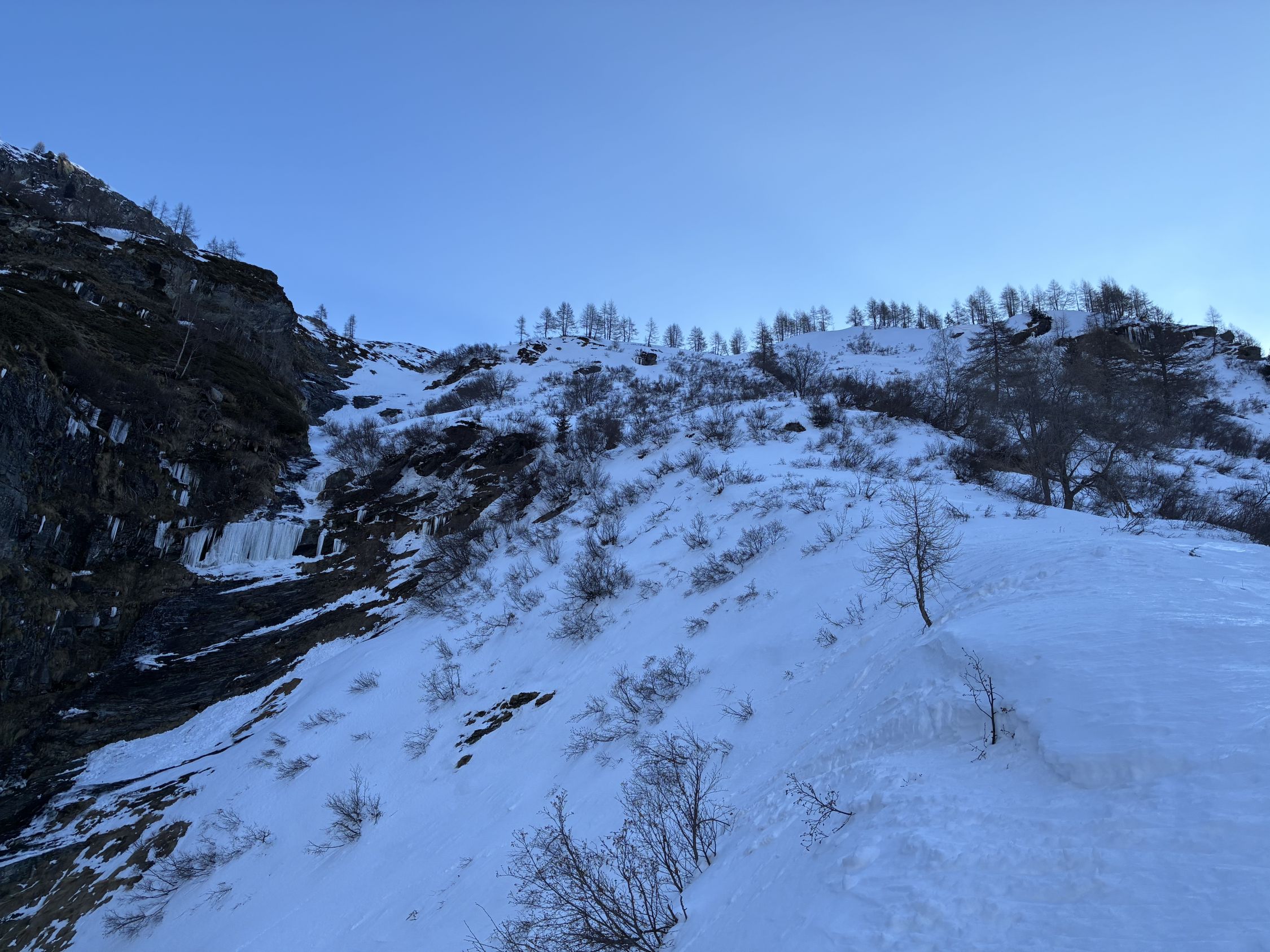 Zum ersten Mal mit wirklich leichter Ausrüstung unterwegs - Blizzard Zero G 95 + Selun A230G + La Sportiva Kilo. 700g weniger pro Fuss (=2410 g zzgl. Fell). Unglaublich, was das im Aufstieg bringt, beeindruckend, wie viel Performance das Setting auch in der Abfahrt bringt. Nix Geeiere. Beeindruckend auch die Kola Alpinist Felle - 100% Mohair, dennoch Grip in der gefrorenen, steilen Waldpassage. Harscheisen blieben im Rucksack.