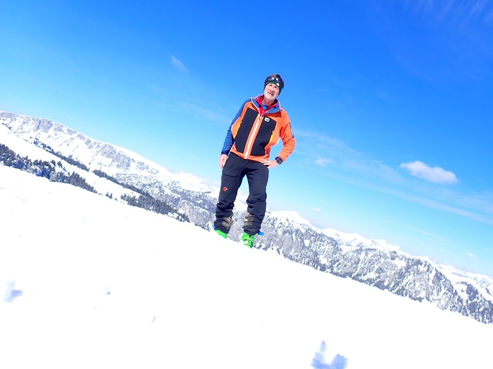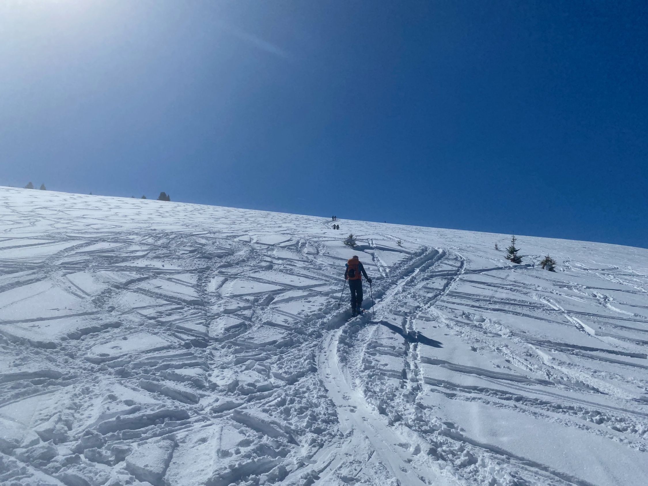 Start um 9:50, unten schon leicht aufgefirnt, Gipfelhang noch Pulver.