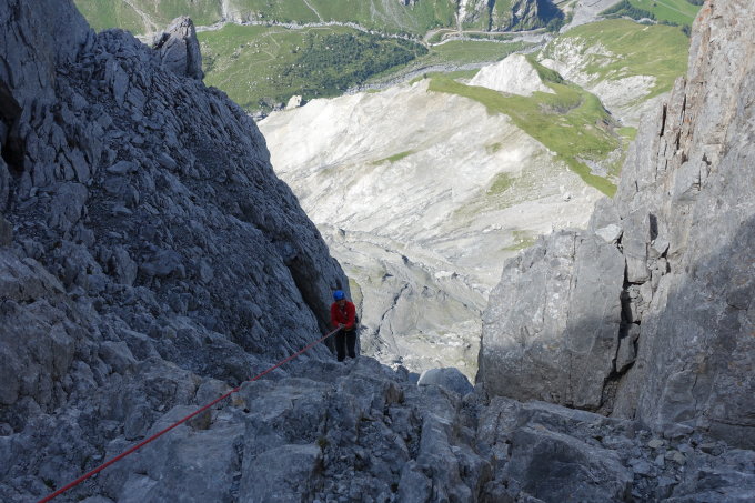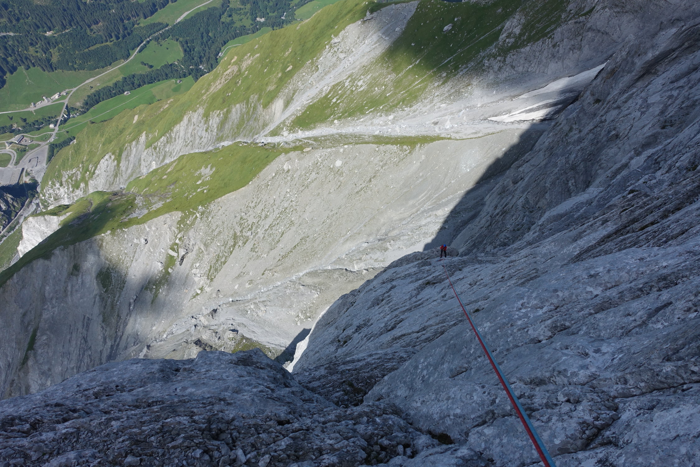 Wir unterschätzten unsere schweren Rücksäcke für den geplanten Weiterweg über den Gipfel. So liessen wir sie knapp in der Mitte der Route hängen und machten nur die Kletterei bis zum Klettergipfel Pt 2663. Aufgrund der negativen Empfehlungen übers Abseilen im Routenbeschrieb und anderen Einträgen hatten wir ein mulmiges Gefühl fürs Abseilen. Dies ging erstaunlich gut. Natürlich braucht es etwas Erfahrung in Seillegung und beim Abziehen. Die Stände sind aber so gelegt, dass Verklemmer-Stellen und Steinschlag sehr gut ausgewichen wird. Der Abstieg über die Leidrus ist dann aber eher mühsam.