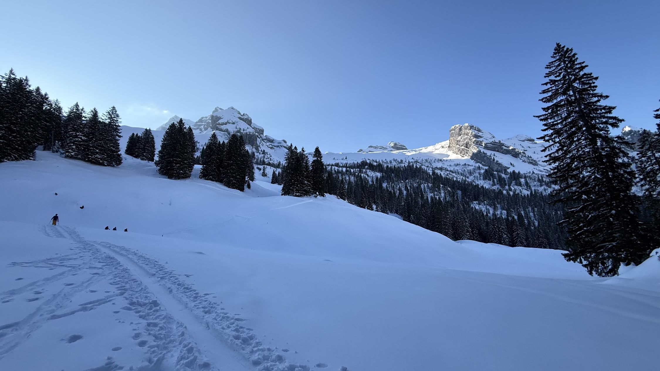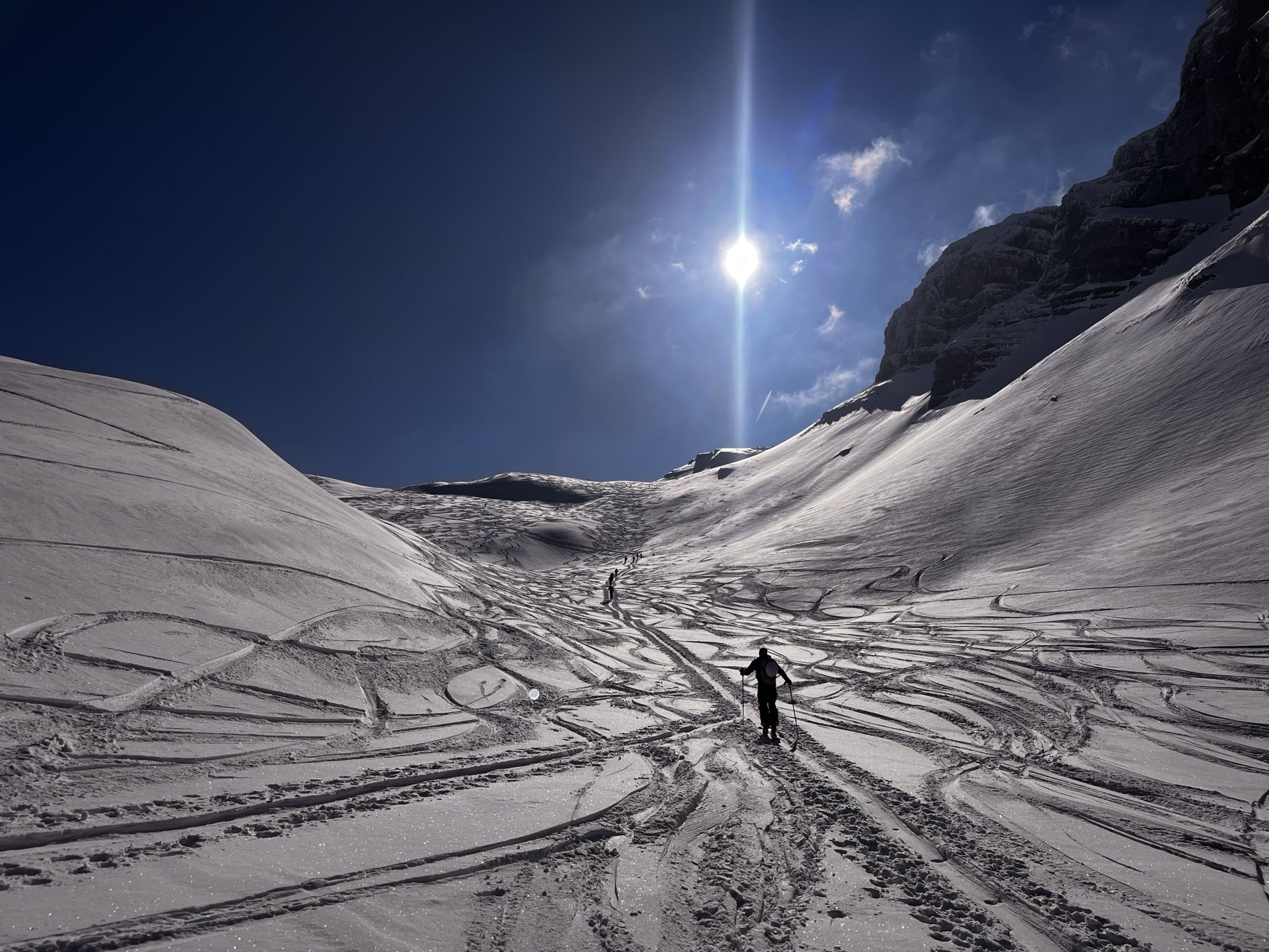 Traumhaft, oben genialer Pulverschnee. Ab Verzweigung Mutteristock wurde der Schnee immer schwerer.