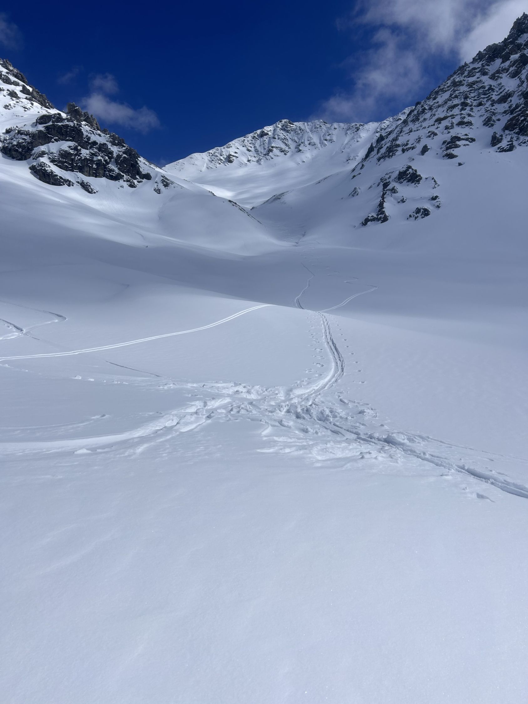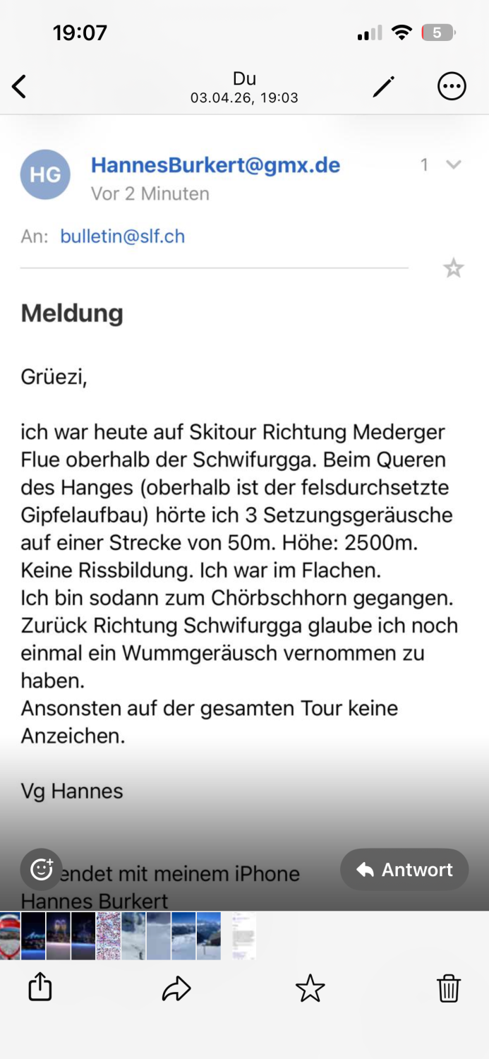 Ich war mit Skiern unterwegs mit dem Ziel Mederger Flue. Aufgrund der nicht harmlosen Lawinenlage bin ich spontan zum Chörbschhorn. Schneeverhältnisse gut oberhalb der Waldgrenze. Die Abfahrt vom Chörbschhorn in den Talkesseln war schön und die von der Schwifurgga bis auf ca. 2000m auch.