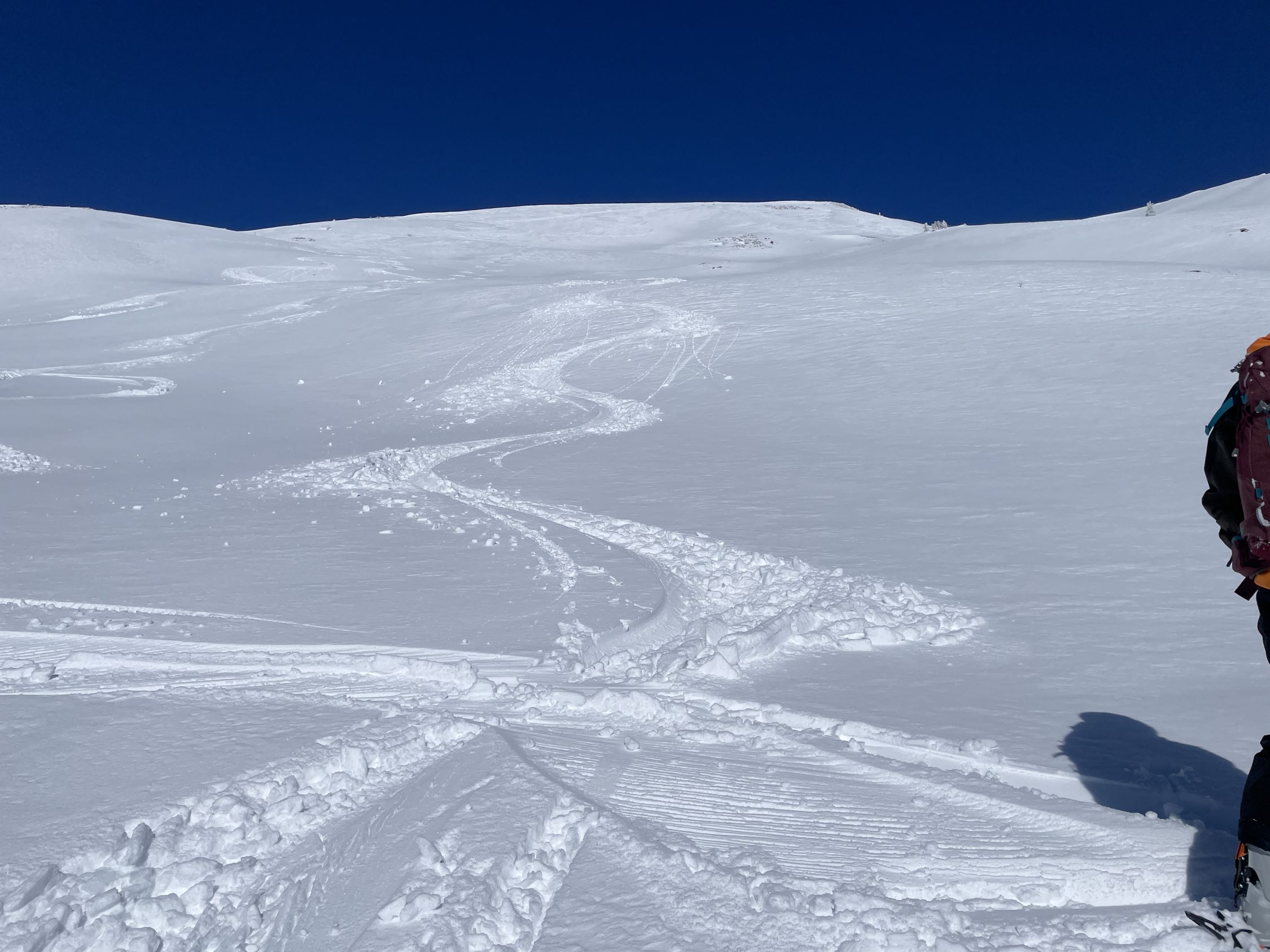 Genug Schnee, Pulver leicht bis kompakt, gute Ausfstiegspur, viele kaum befahrene Hänge