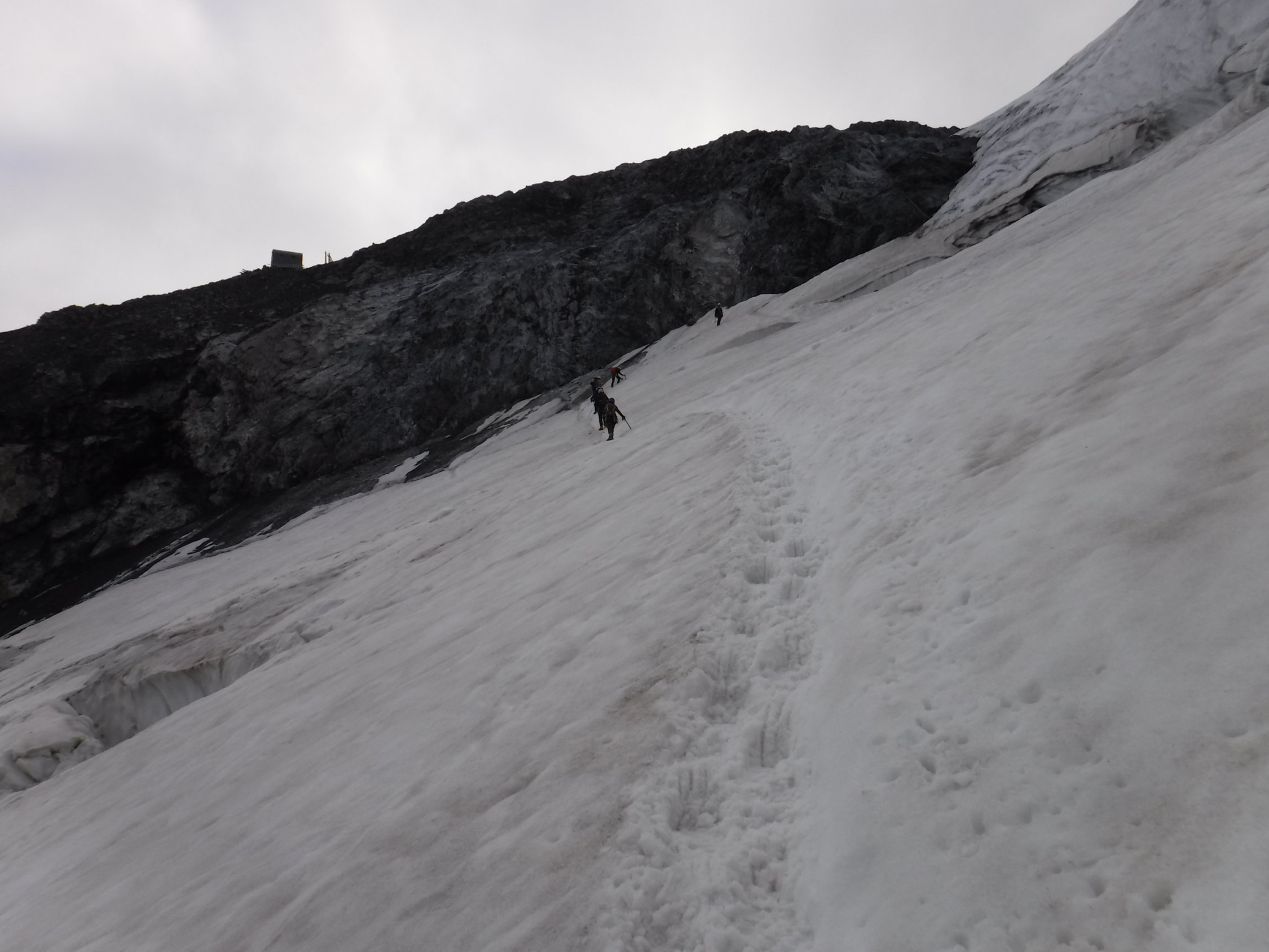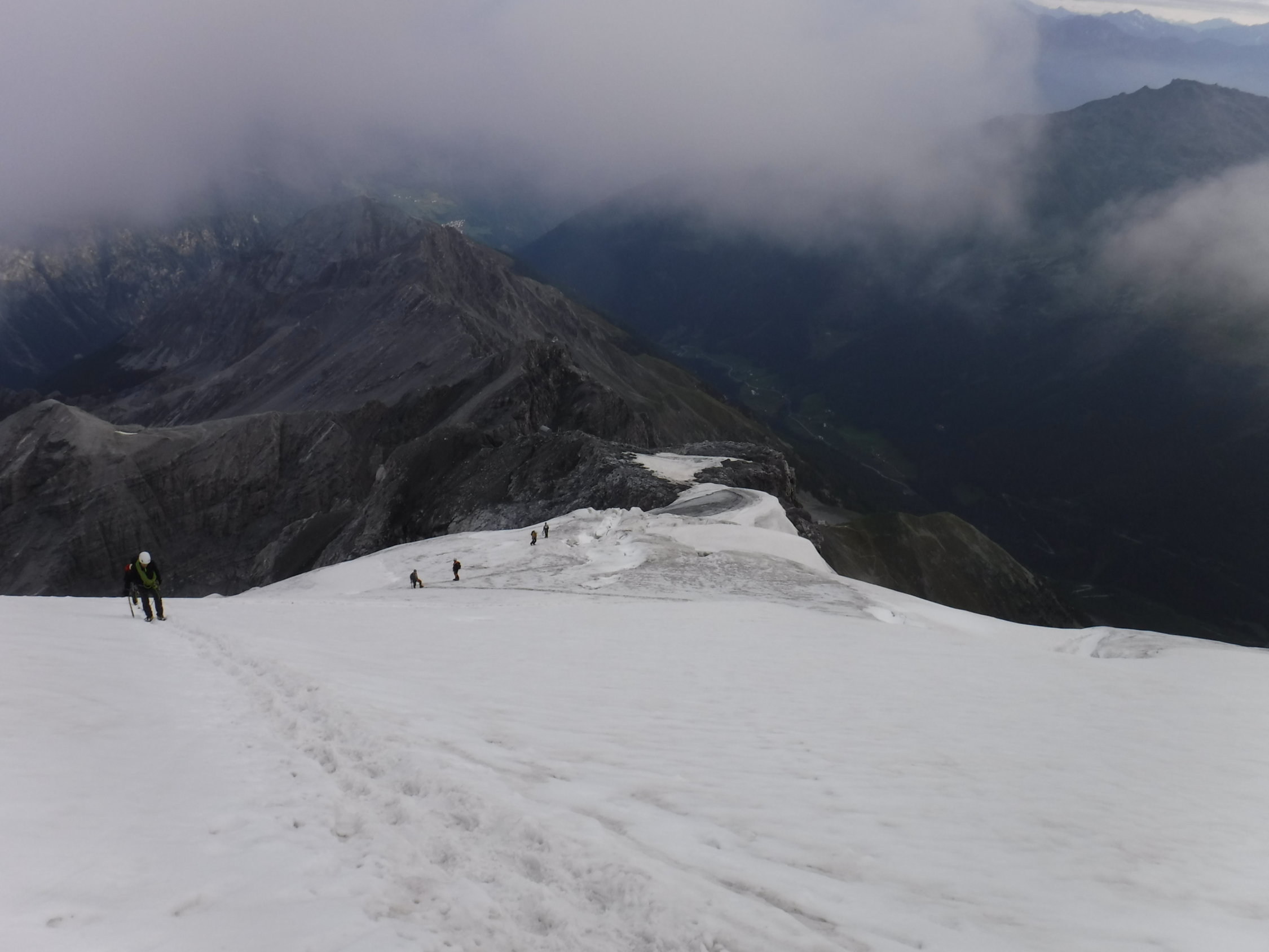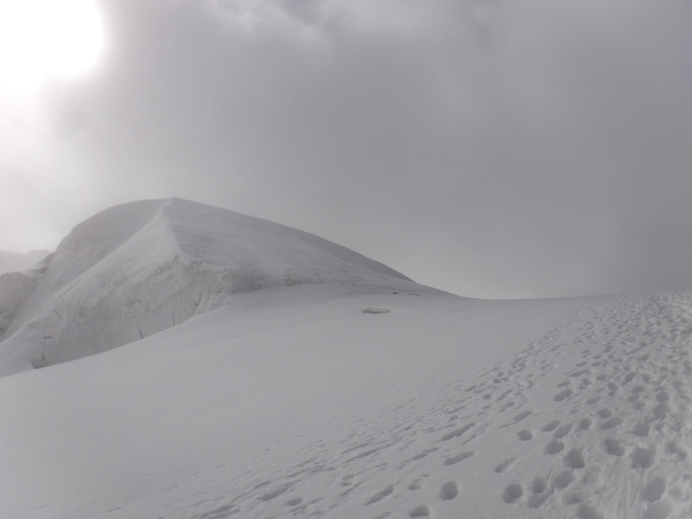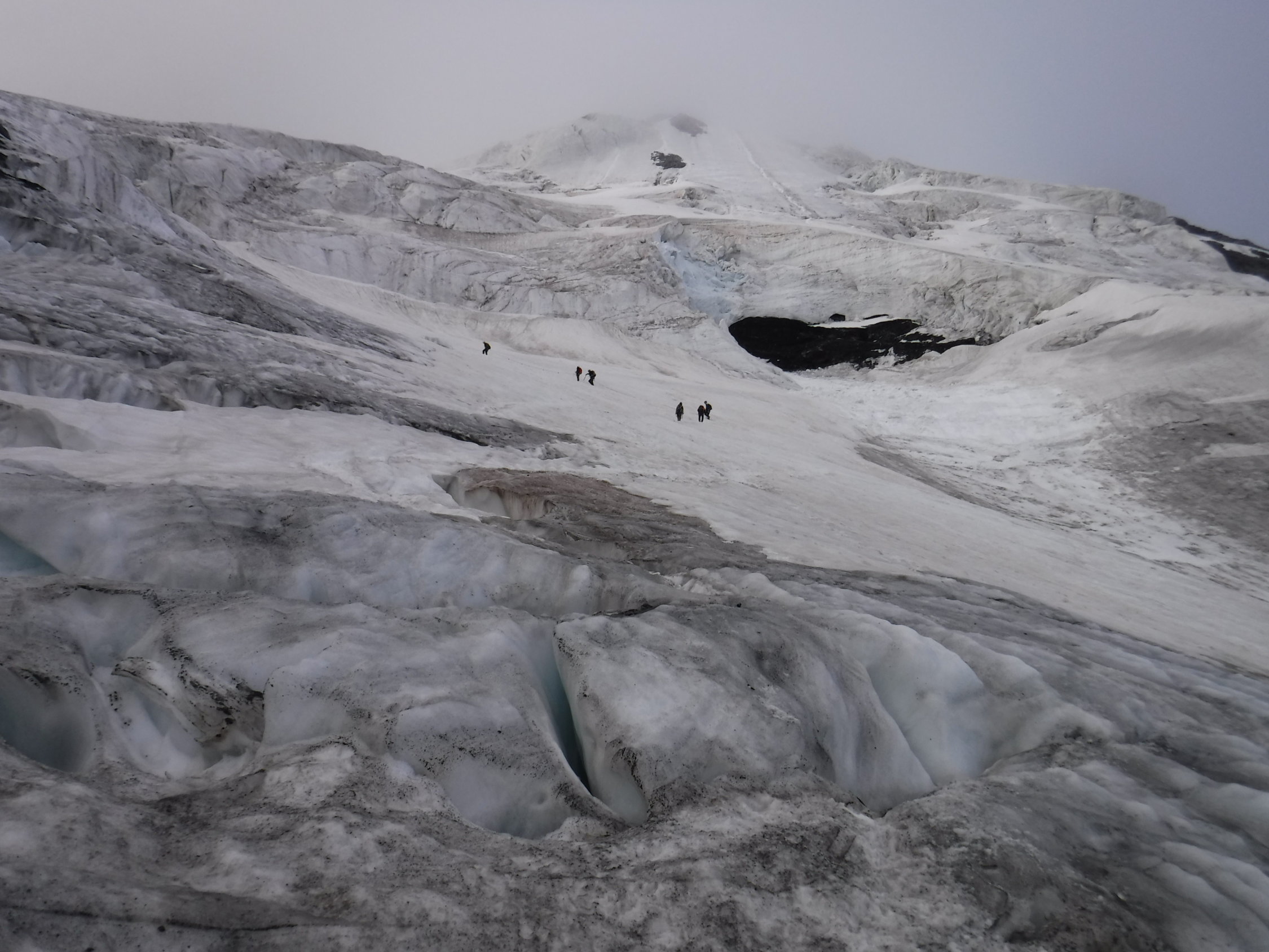 Tourenbeginn bei 9°C um 01:35 Uhr unter anfangs klarem Sternen-Himmel. Auf dem Gletscher dann keine Sicht mehr im Hochnebel.