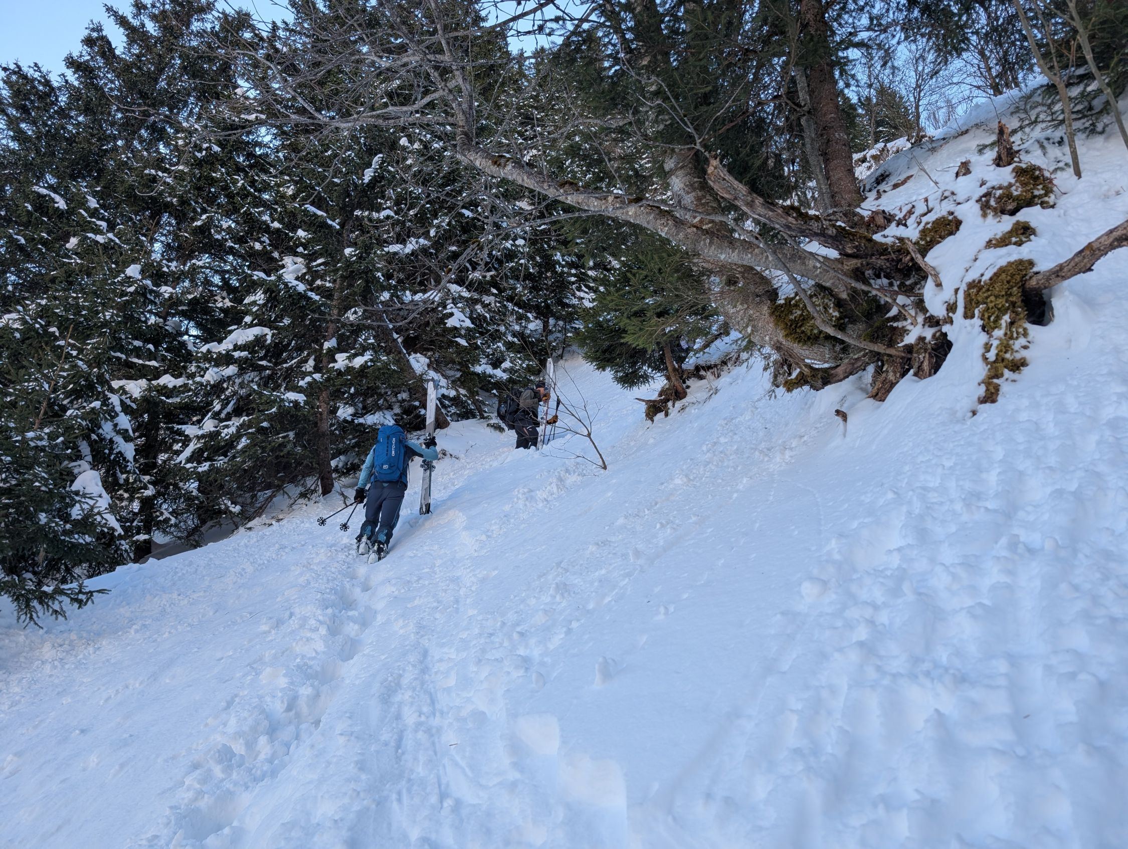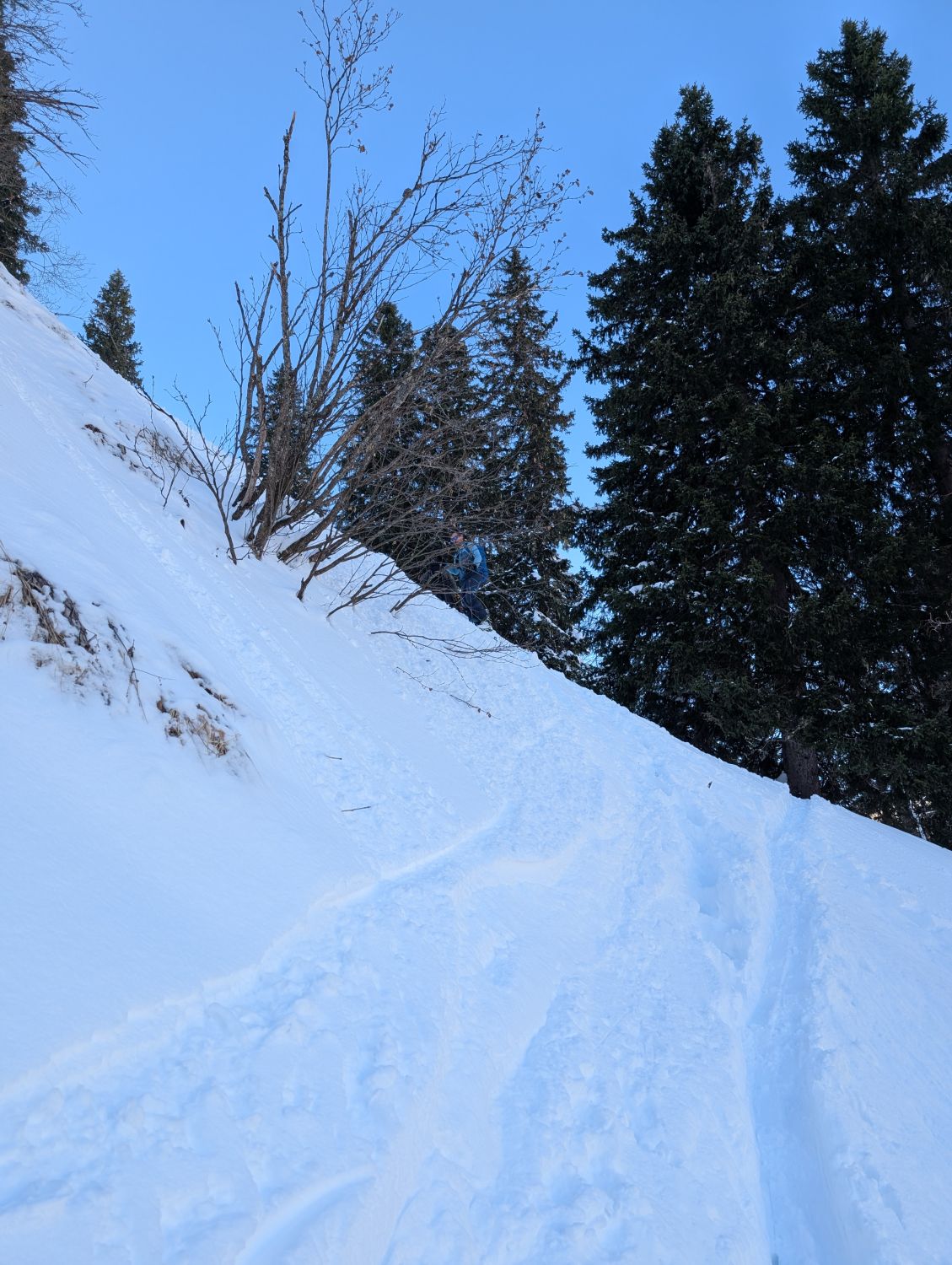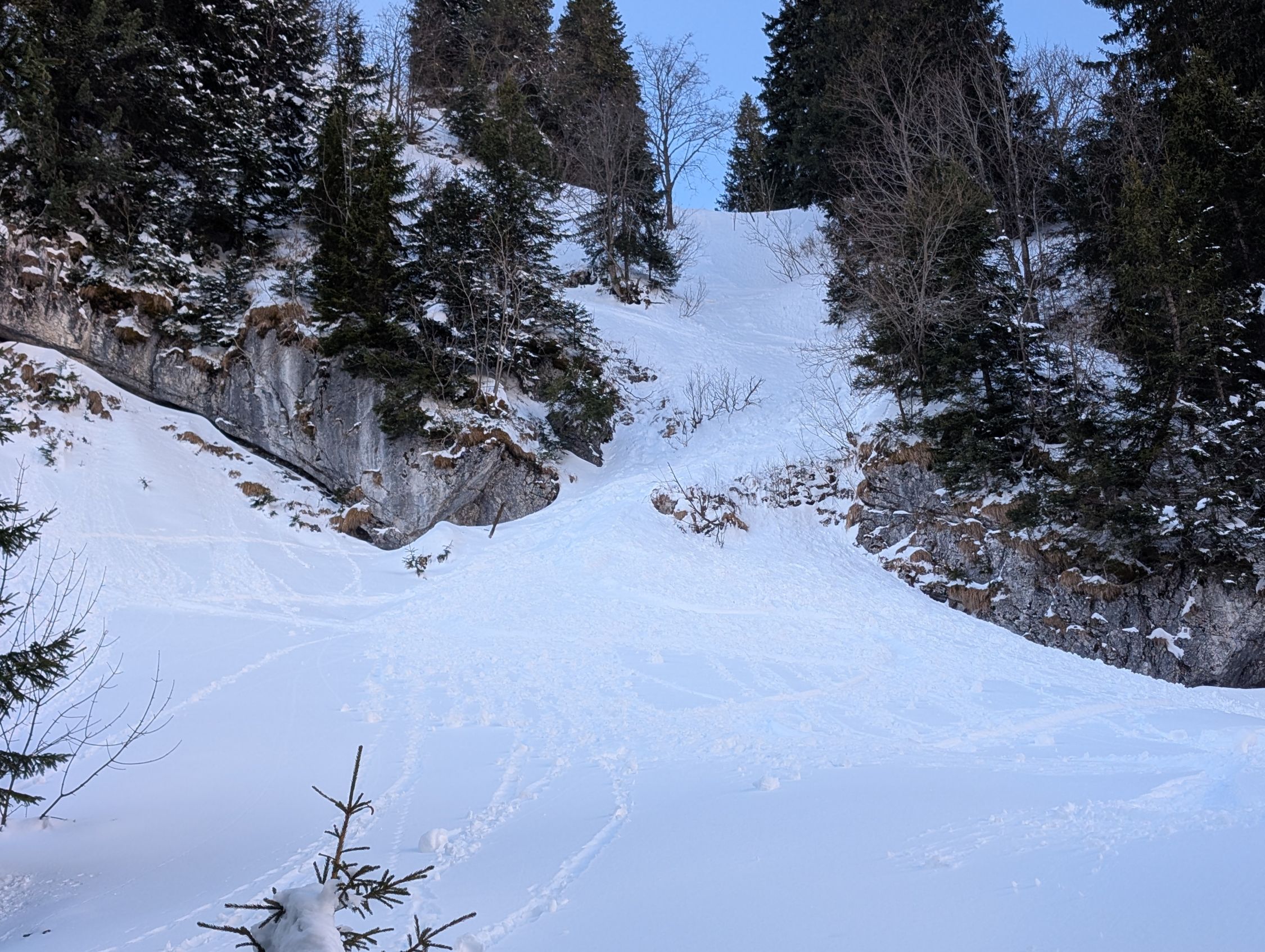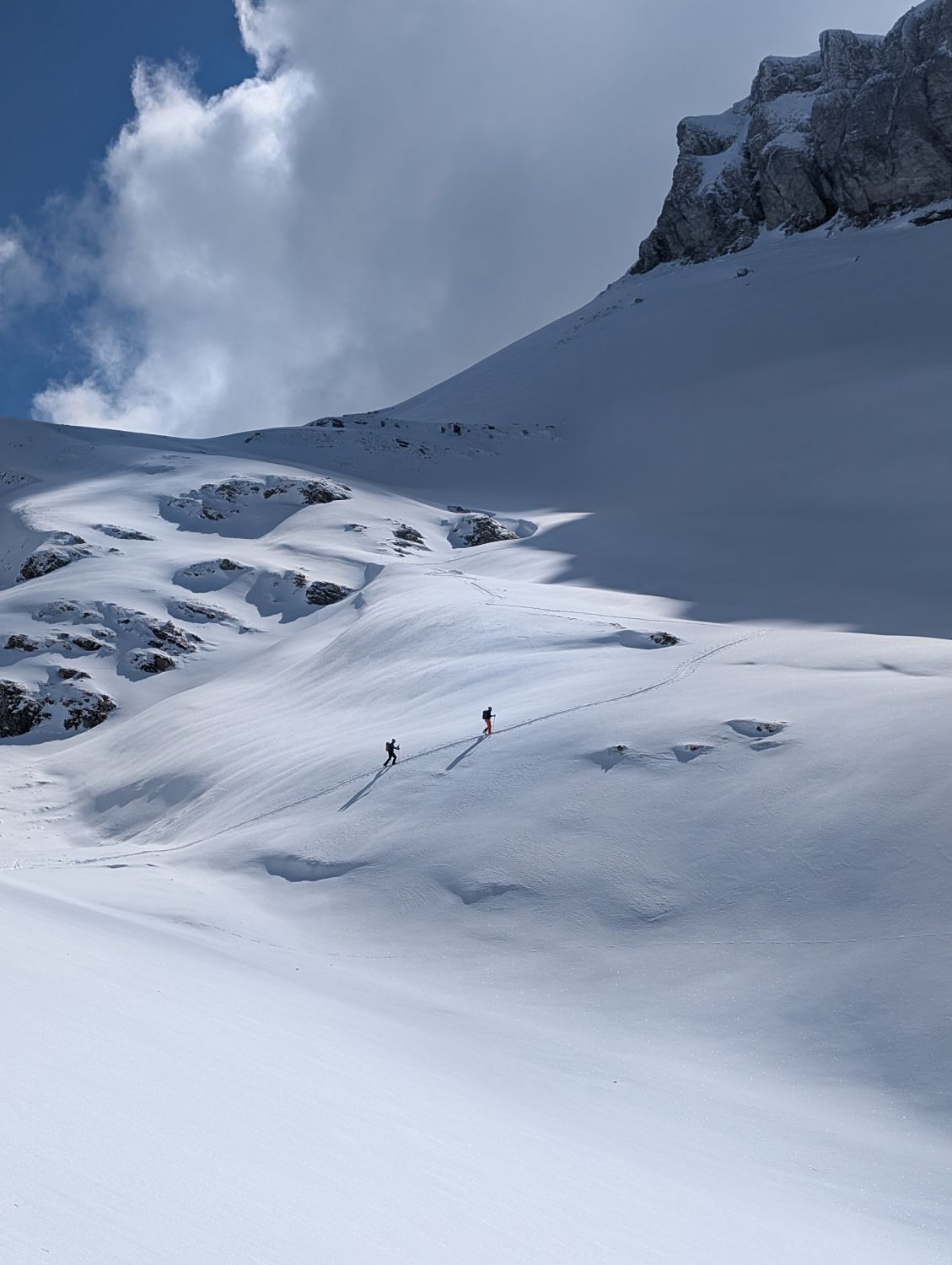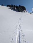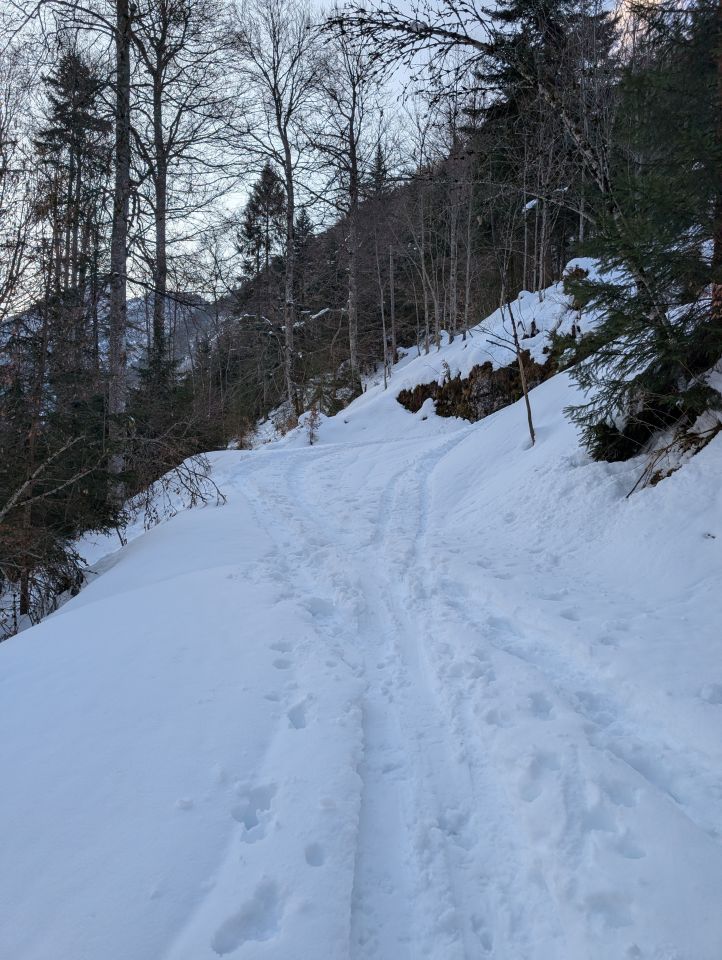 Mehr als genügend Schnee ab Obersee. Tritt morgens noch gut zu Fuss zu gehen, aber nach dem heutigen Tag und den Abfahrern komplett abgefahren (bzw gerutscht). Vermutlich trotzdem machbar zu Fuss.