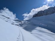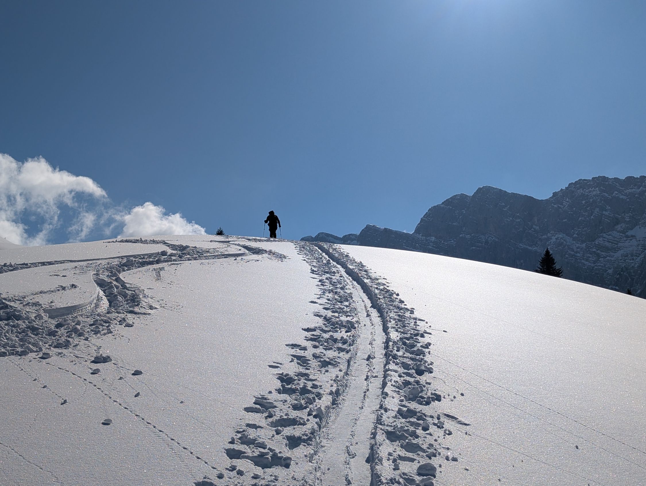 Schnee um Altstaffel bis Beginn des Gipfelhangs extrem schnell aufgewärmt, bereits am späten Morgen. Gipfelhang feinster Pulver.