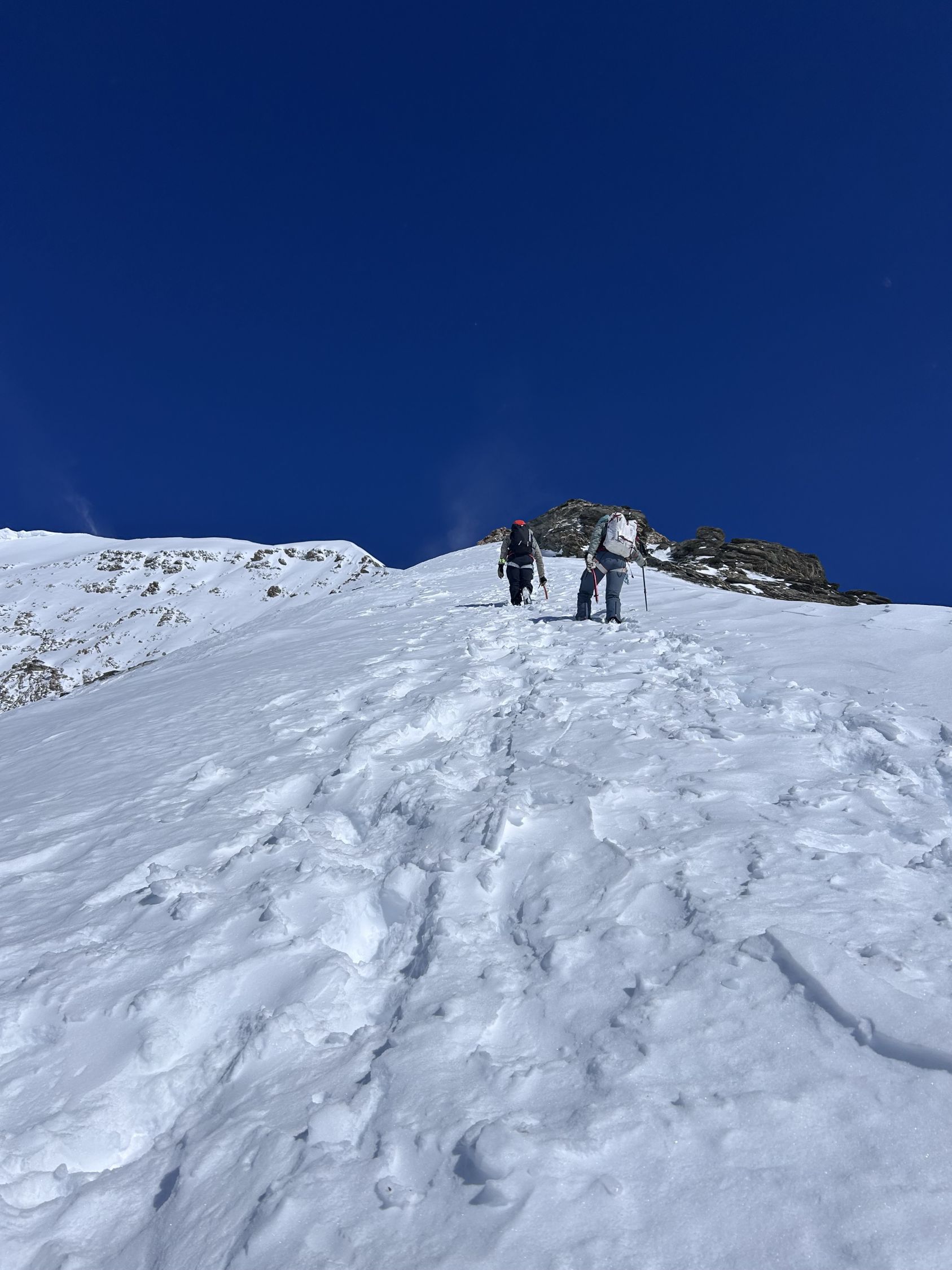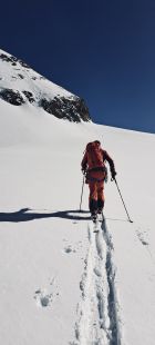 Beim Einstieg kann der Wintereinstieg etwas links vom Sommereinstieg genutzt werden. Danach ziemlich in gerader Linie und schönem Trittschnee hoch bis zum Regenmesser. Von dort über die normale Route immer in schöner Kletterei bis zum Firnhang unterhalb des Vorgipfels. Dieser ist aktuell sehr mühsam da der Schnee sich noch nicht gesetzt hat. Anschliessend immer leicht links entlang des Grates in einer schönen Spur hoch zum Gipfel.
