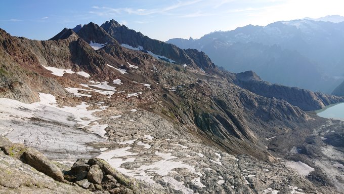 Das Abstiegscouli ist, fast komplett ausgeapert, ein regelrechter Schutthaufen. Im untersten Teil lag auf der steilen Firnzunge etwas Sulz.
