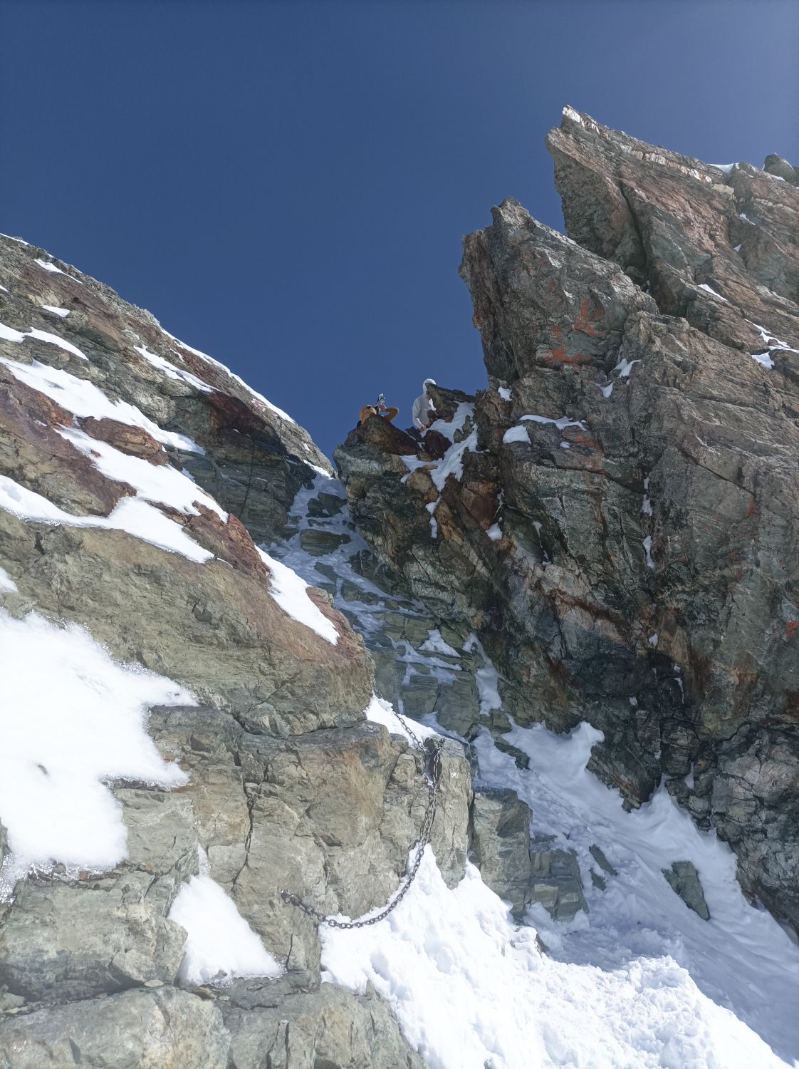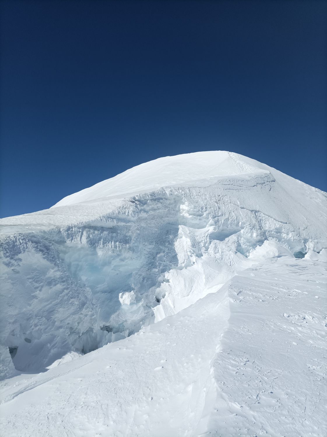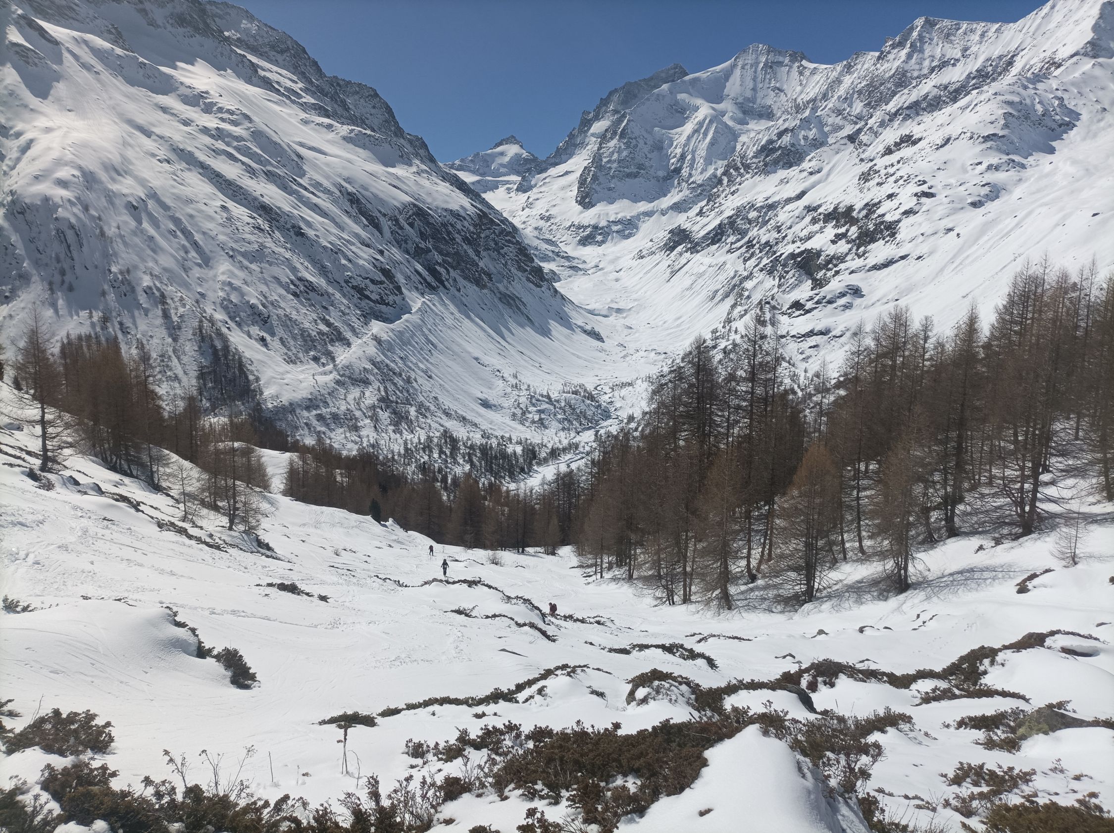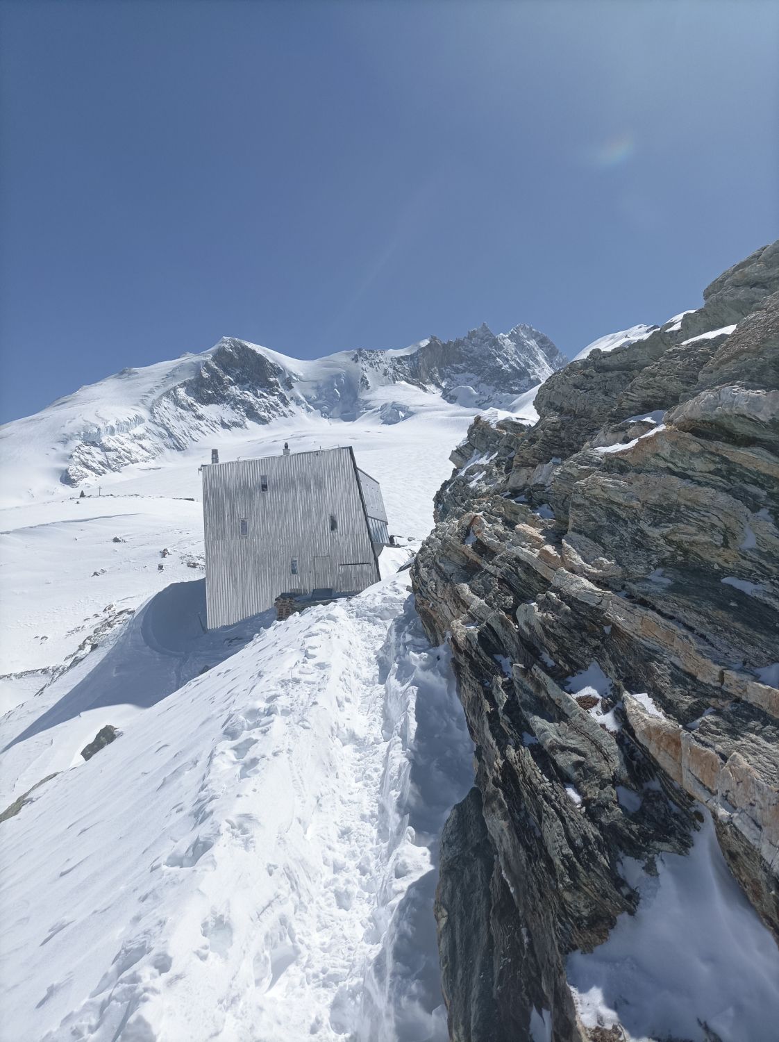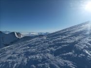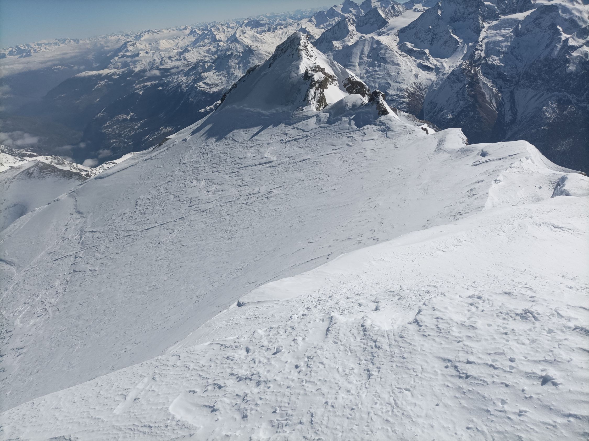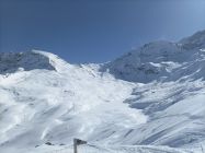 Aufatieg: Von Zinal aus durchwegs mit Skier zu gehen. Im unteren Bereich der Südwesthänge gibt es erste schneefreie Stellen. Das Val de Roch hat noch super viel Schnee. Der untere Bereich des Gletschers hat viel Schnee. Eine offene Spalte an der Aufstiegsspur erkennbar. Im mittleren und oberen Teil ist der Schnee abgeblasen, windverpresst, oder als festes Brett vorhanden. Mit Harscheisen aber gut zu gehen Überraschend viele Spalten im oberen Bereich.