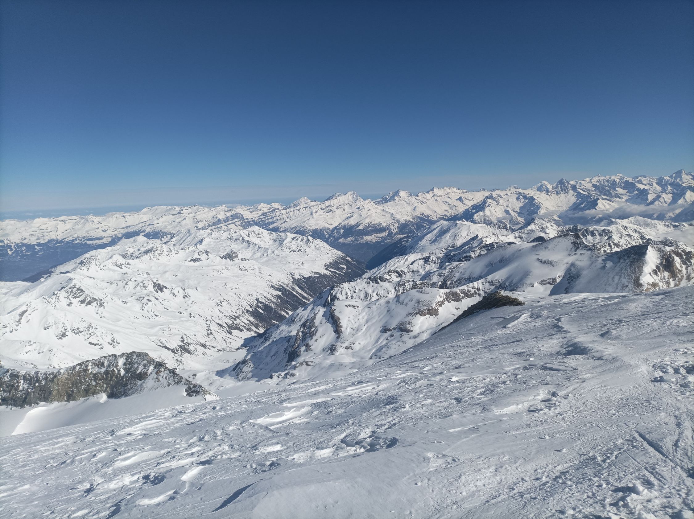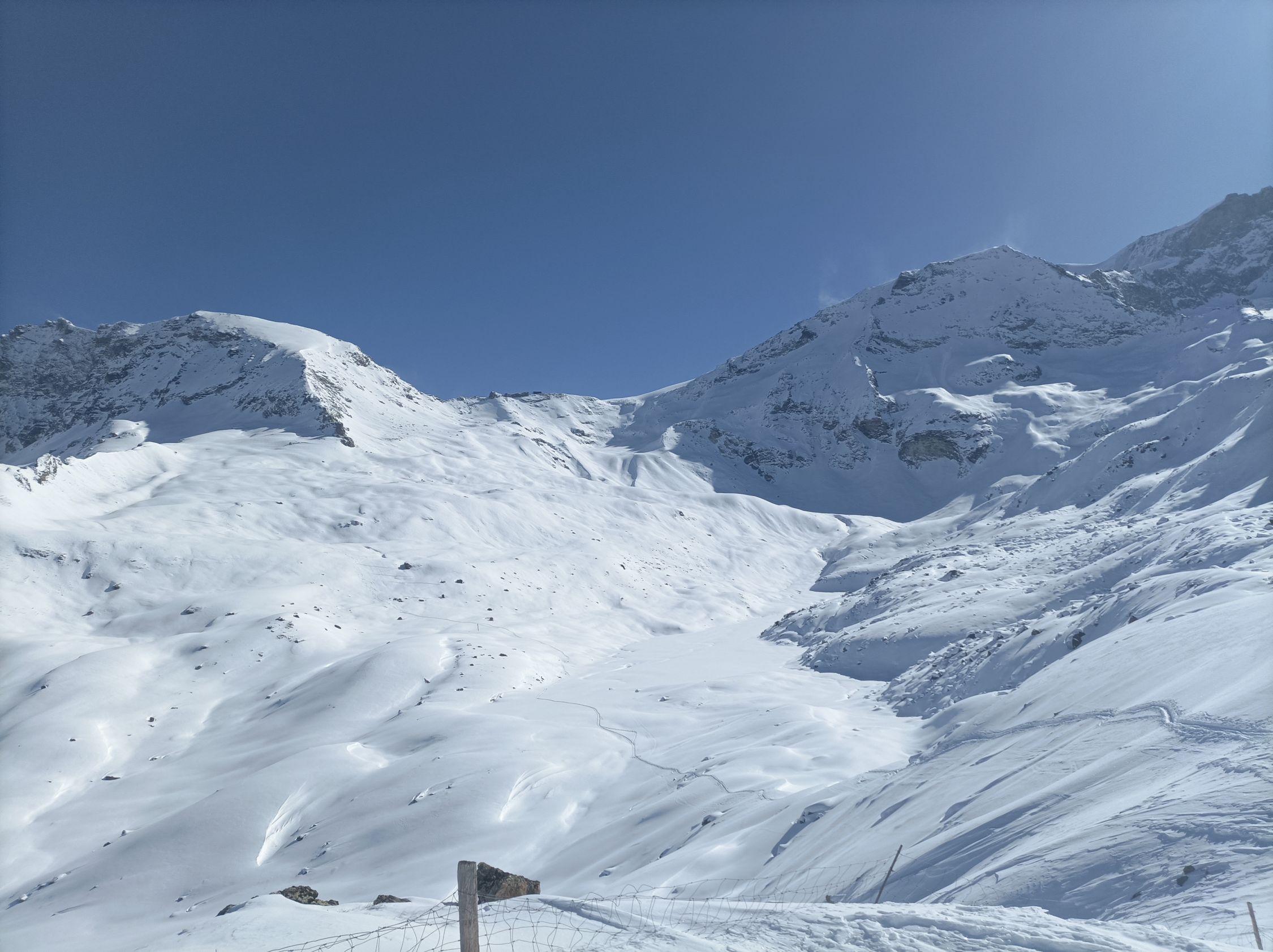 Abfahrt: Gute Kanten der Ski auf dem Gletscher von Vorteil. Abfahrtsgenuss ist anders. Im unteren Bereich einige passable Schwünge. Mit dem Ansturm von heute wird das jedoch zerfahren sein. Für den Bereich unter der Tracuit-Hütte war ich heute zu früh. Je nach Exposition schwerer Schnee, Bruchharsch oder fester Deckel. Unten Stein- bzw. Sträucherslalom.