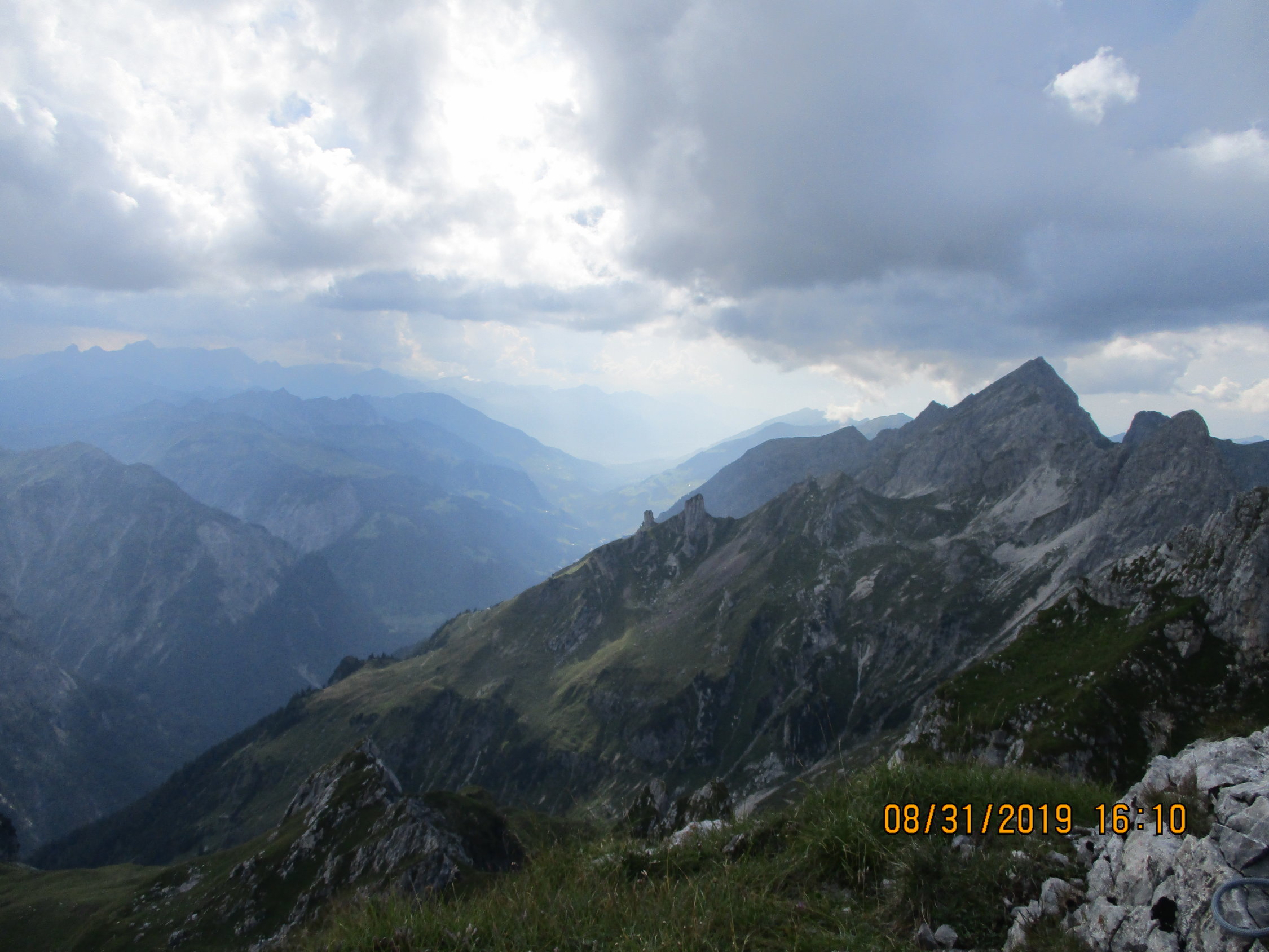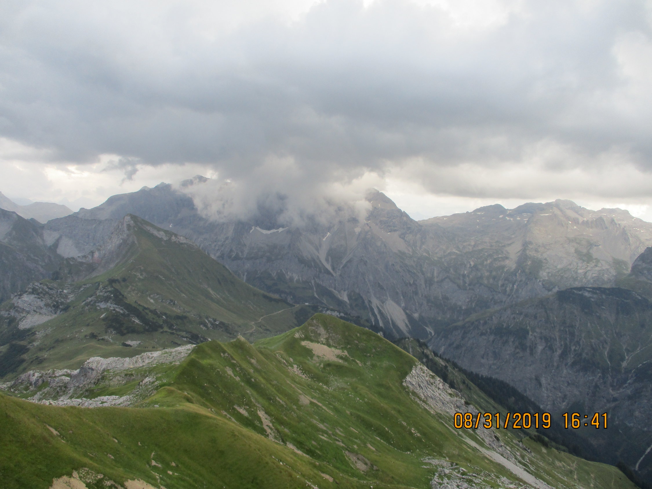 Mit Sonne sehr warm. Ein angenehmer Wind, sowie die dynamische Zunahme der Bewölkung sorgten für Linderung. Im Abstieg streifte uns ein Gewitter. In einem bis anderthalb km Luftlinie zu uns bekamen Gipfel, wie etwa die Braunarlspitze, eine dezente Weisstünchung ab, verursacht durch einen ergiebigen Hagelschauer.