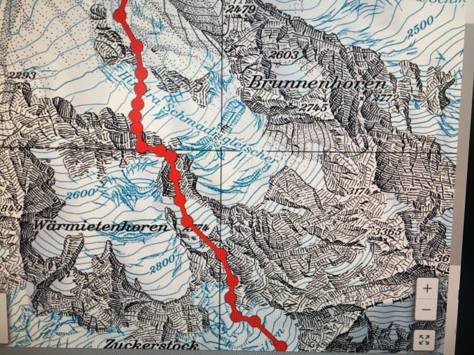 Die im SAC Führer beschriebene originale Route existiert aufgrund des Gletscherschwundes nicht mehr.