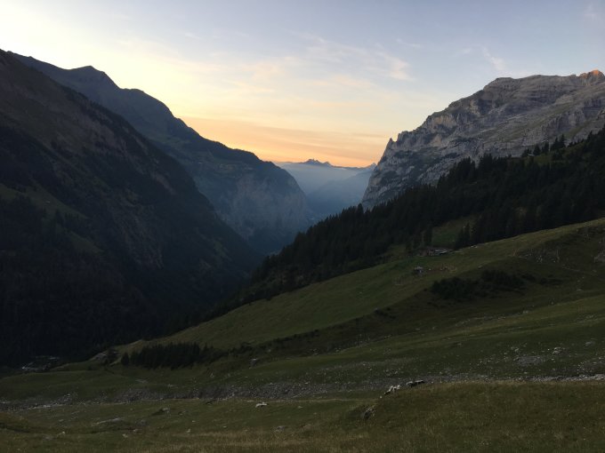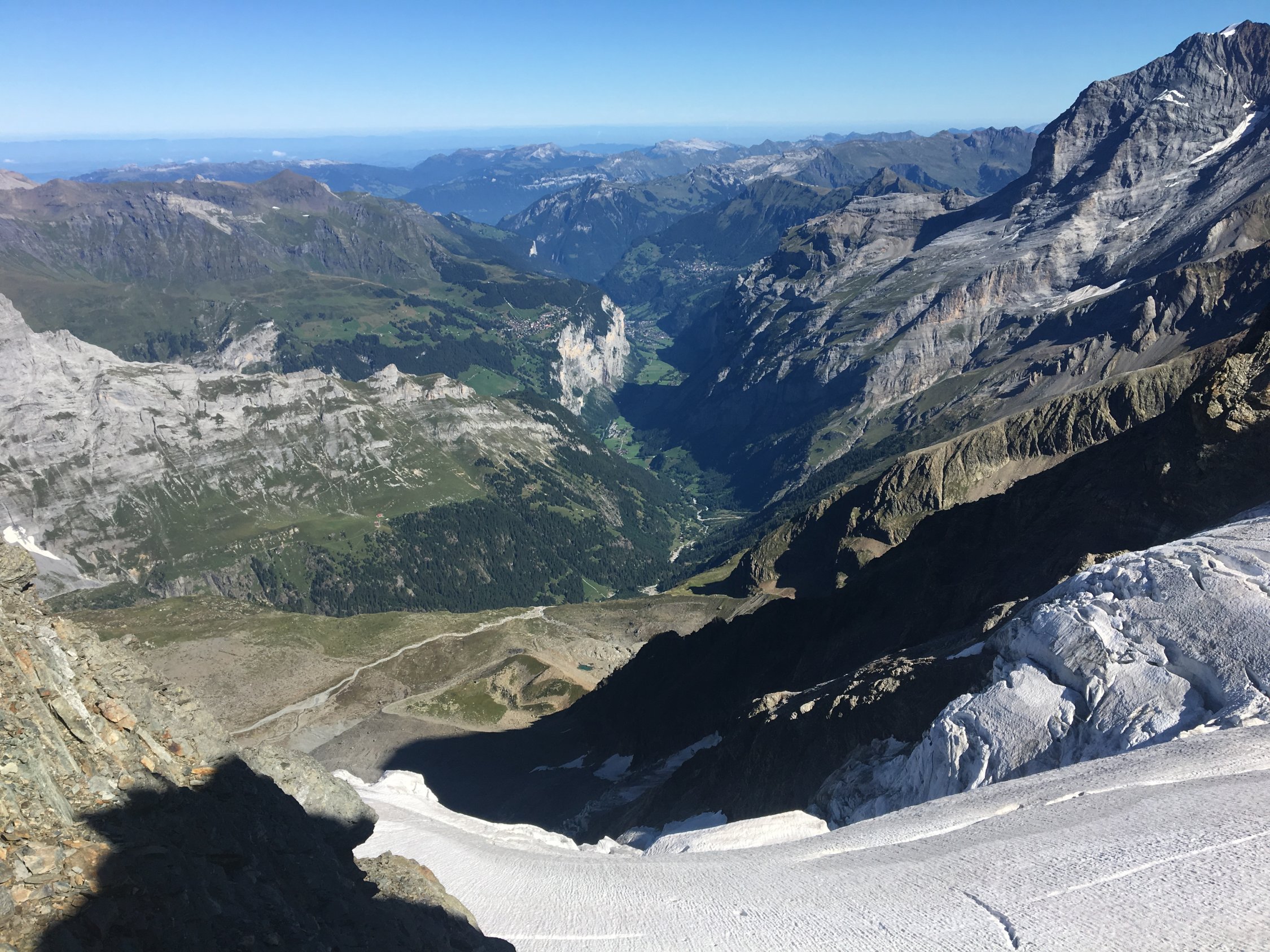 Wir sind erst um 18:30 in Stechelberg gestartet, entsprechend erreichten wir die Schmadrihütte erst kurz vor 21 Uhr. Ein Rekognoszieren des unteren Routenabschnitts war in der Dunkelheit nicht möglich und kann - im Tageslicht - auch nur vom oberen Rand der Moräne gemacht werden. Dies können wir jeder Seilschaft empfehlen.