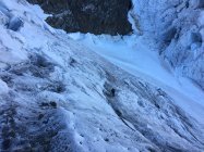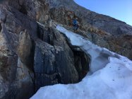 Bis gegen 2880 m klettert man hier im Bereich eines markanten Seracs - hier sicherlich objektive Eisschlaggefahr. Gegen 3000 m kann dann der Fels leicht querend nach rechts auf den Schmadrifirn verlassen werden. Die markante Spaltenzone wird leicht östlich haltend überwunden, hier haben wir streckenweise mit Schrauben gesichert. Weiterweg bis zum Schmadrijoch dann problemlos.
