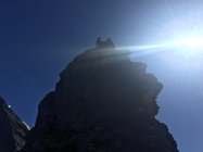 Meist dem Gratverlauf folgend. Das abkletterbare „Wändchen“ wird besser abgeseilt. Die dortige Abseilsstelle verstärkten wir mit einer weiteren Reepschnur. Die auch in der Führerliteratur beschriebene südseitige Umgehung des grossen Felsaufschwungs fanden wir nicht und landeten direkt auf dem Gipfel. Irgendwie auch logisch, da wir mit dem Ende des Aufschwungs auf dem Gipfel standen.