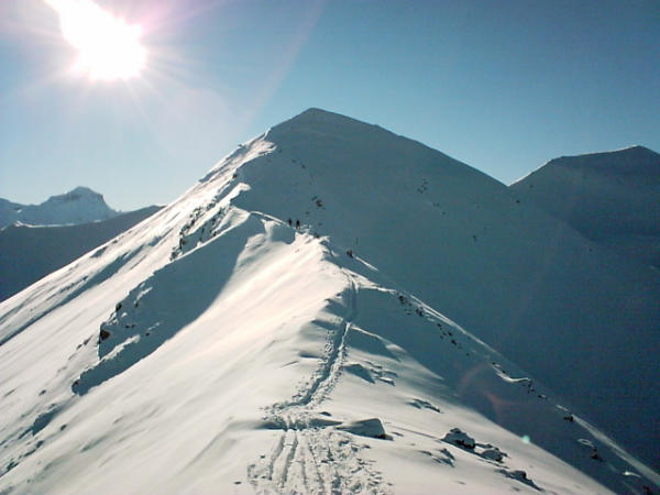 Lang, weit, kalt und schattig ist der Weg vom Berghaus Schönhalde auf den Gipfel des Madkopf. Tief verschneit präsentiert sich die Landschaft, wie aus einem Heidifilm. Anstrengend ist das Spuren ab Cholschlag Mittelsäss in die teils steilen Pulverschneehänge hinein. Am Hühnerkopf beobachten wir regen Betrieb. Sie alle sind von Vermol aufgestiegen, was rückblickend wohl vernünftiger gewesen wäre. Einiges machte uns bei dieser Tour zu schaffen. Felle die nicht mehr klebten. Viele versteckte Steine, die unseren Ski recht zusetzten und teilweise Nebel, der das Gelände in diffuses Licht tauchte. So erreichte unser Mondscheinquartett noch ganz kurz vor Einbruch der Dunkelheit Schönhalde und die Bergstation der Seilbahn.