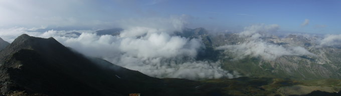 Rundblick über die Lischanagruppe und Sesvennagruppe im Westen, über die Rojenberge und Ötztaler Alpen im Norden und zu den Ortlerbergen im Südosten.