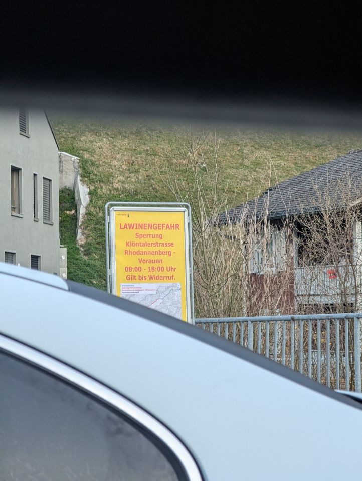 Strasse am Klöntalersee war wegen Lawinengefahr gesperrt, siehe Bild.