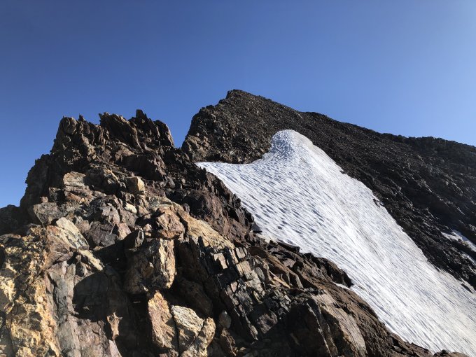 Die Firnfelder sind an vielen Stellen ausgeapert. In der SW-Flanke liegt kein Schnee mehr, ist gut begehbar.