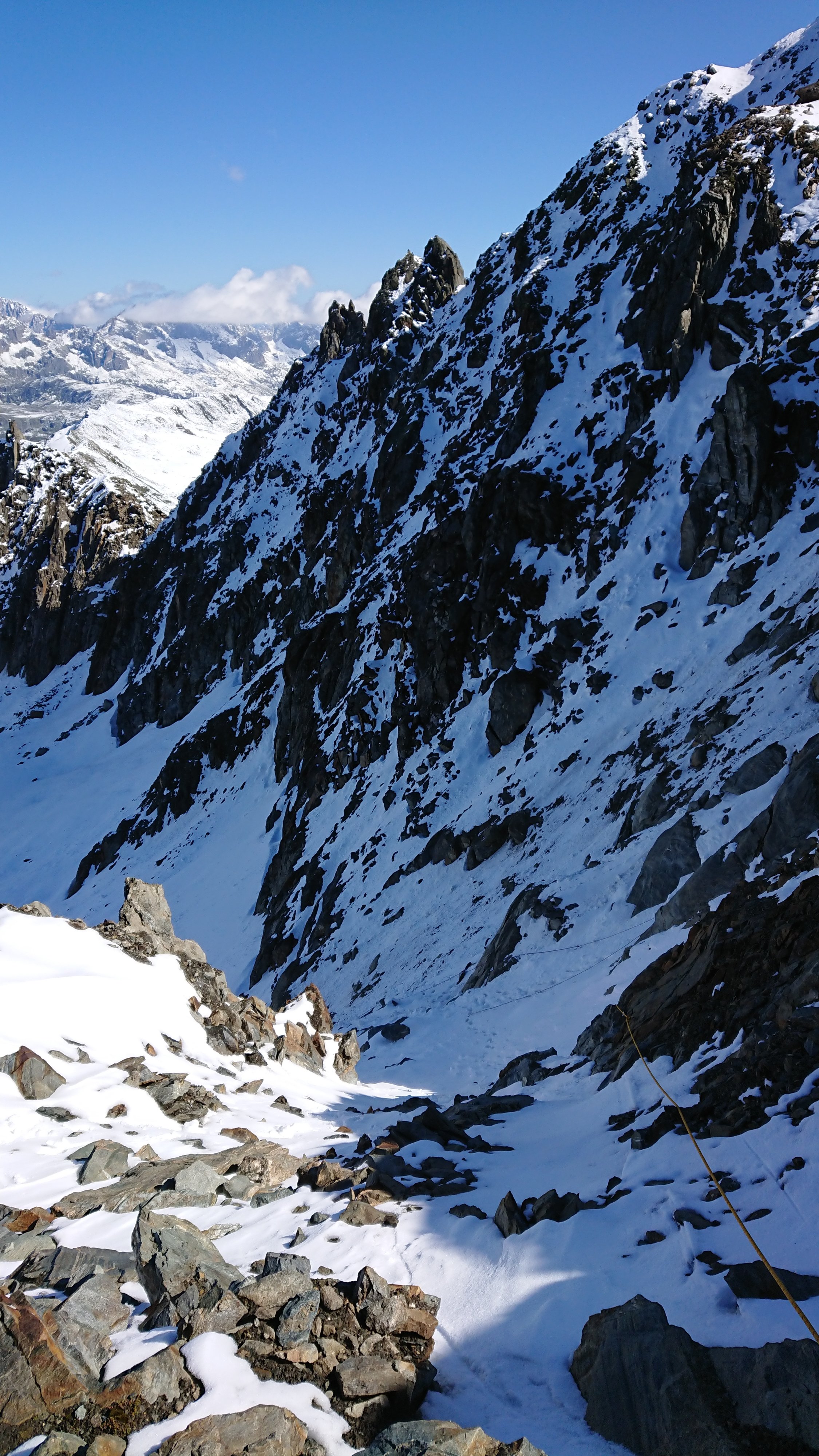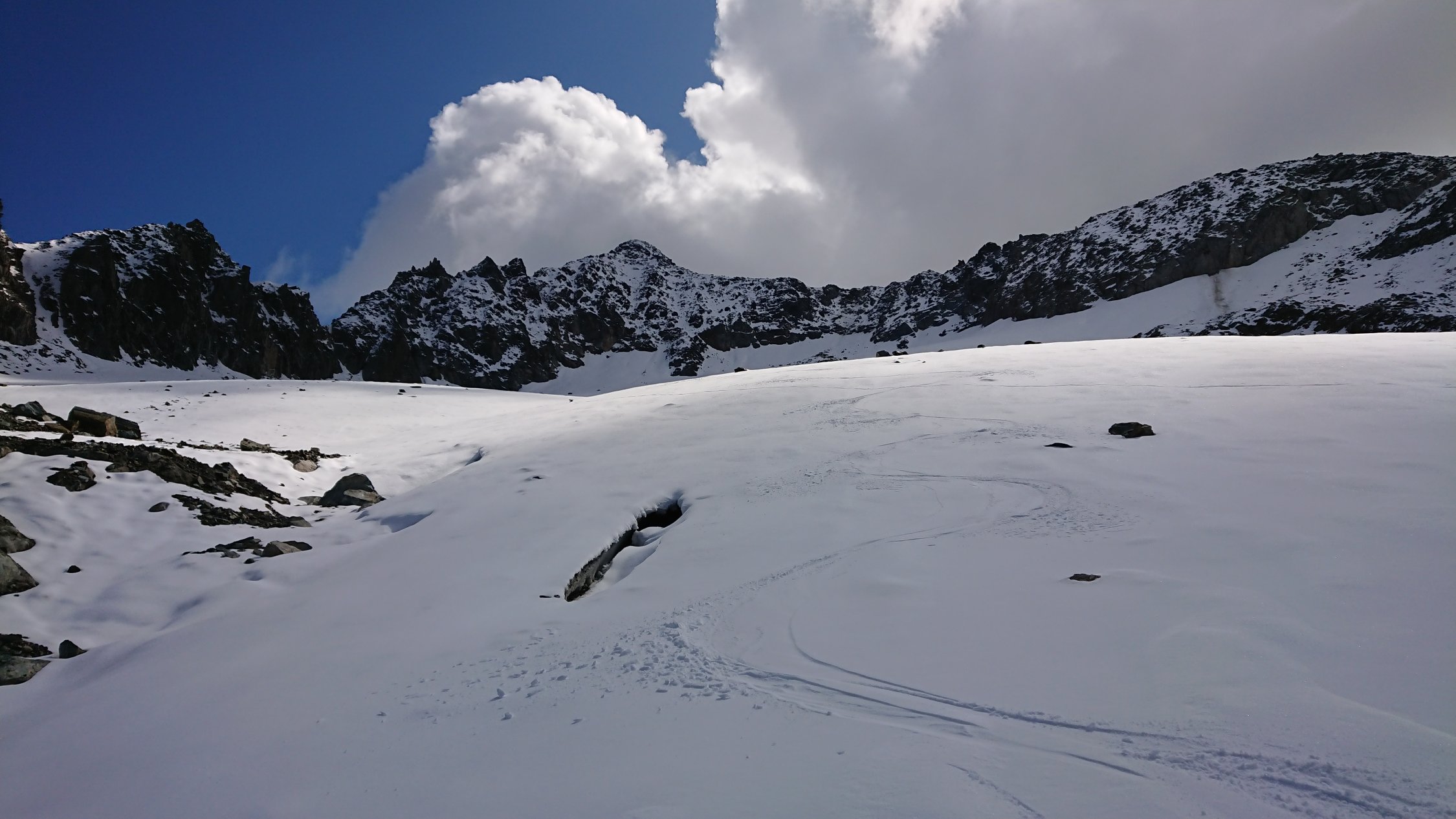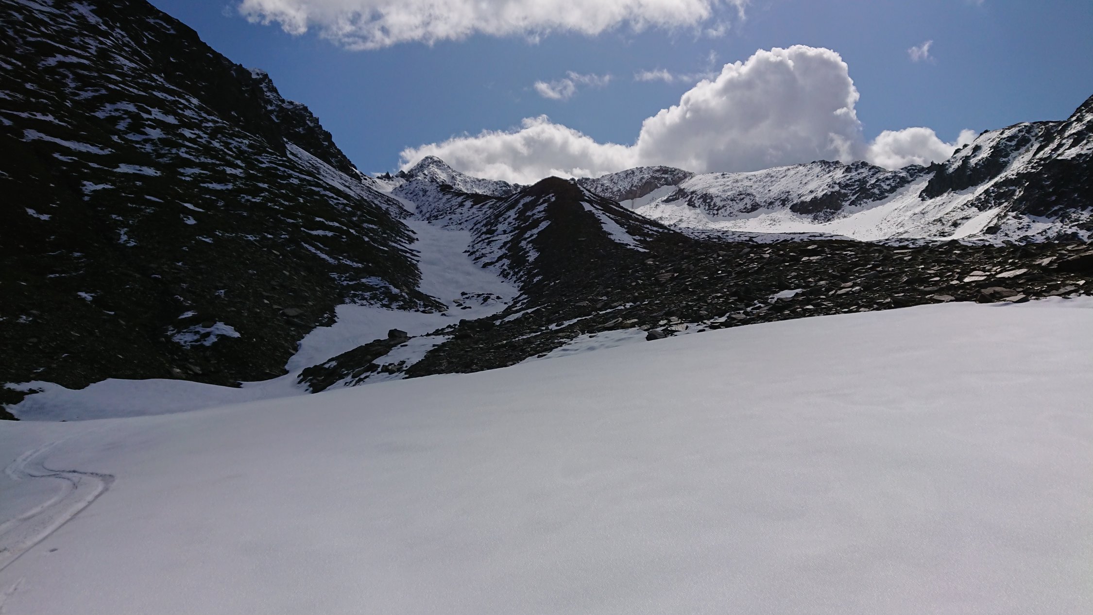 Für Anfang September gute Schneeverhaeltnisse. Vom Skidepot mit wenigen kurzen Tragstellen war heute die Abfahrt bis zum Auto mit Ski möglich. Übergang Gletscher zum Fels momentan mühsam, aber ein noch gutes Fixseil vorhanden.