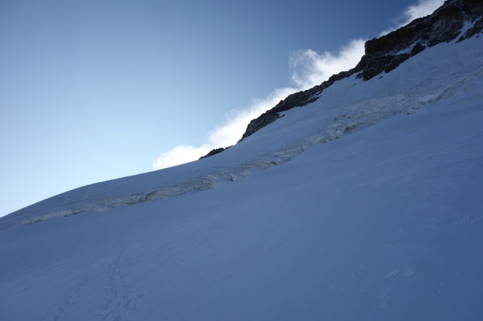Die Nordflanke ist derzeit recht eisig. Es hat zwar Stufen, die sind glatt und teils mit Pulverschnee zugeweht. Wir sind deshalb mit 2 Eisgeräten gegangen. Andere Seilschaften hatten mit nur einem einfachen Pickel oft Mühe, vor allem dann auch im Abstieg.
