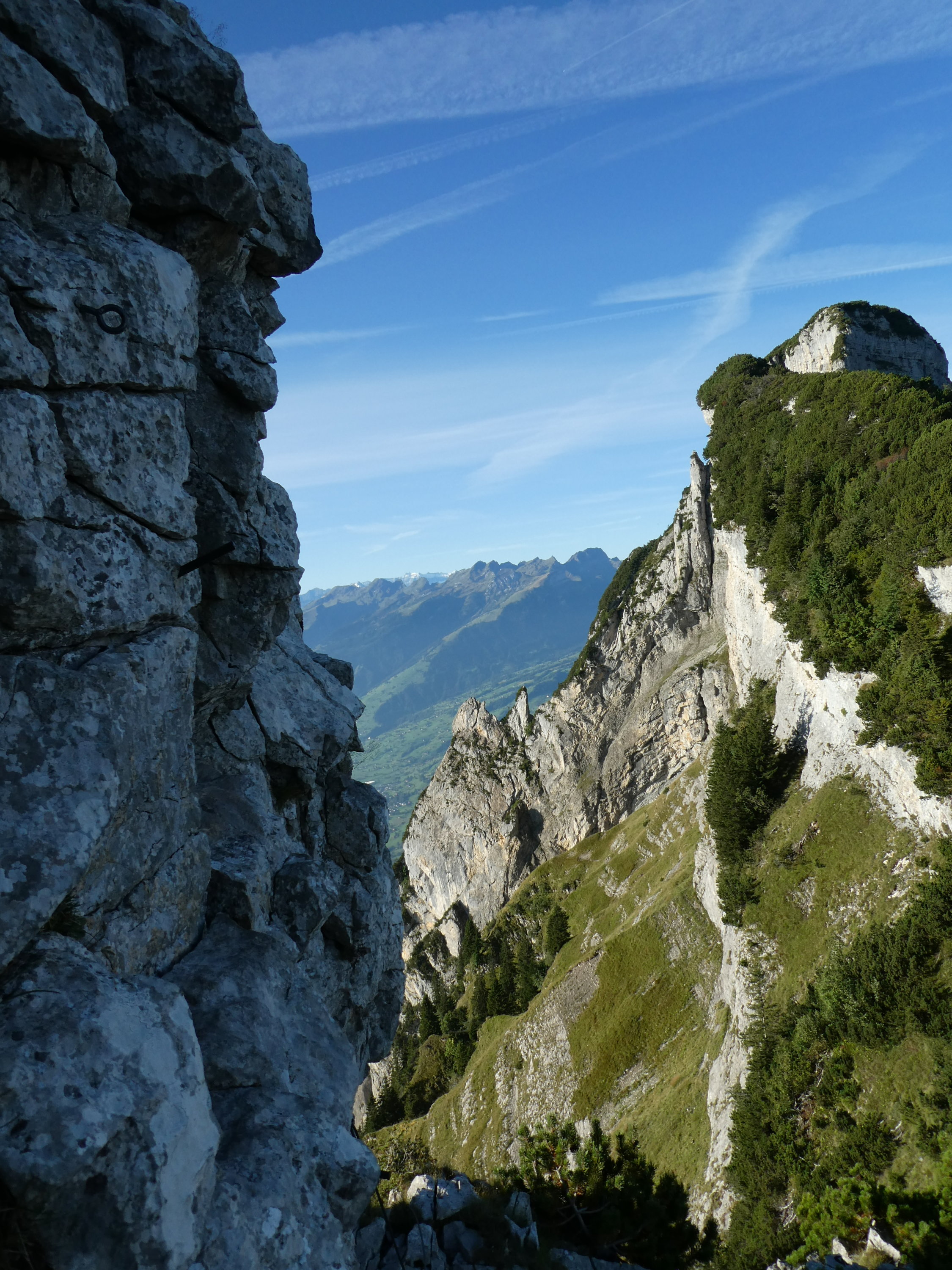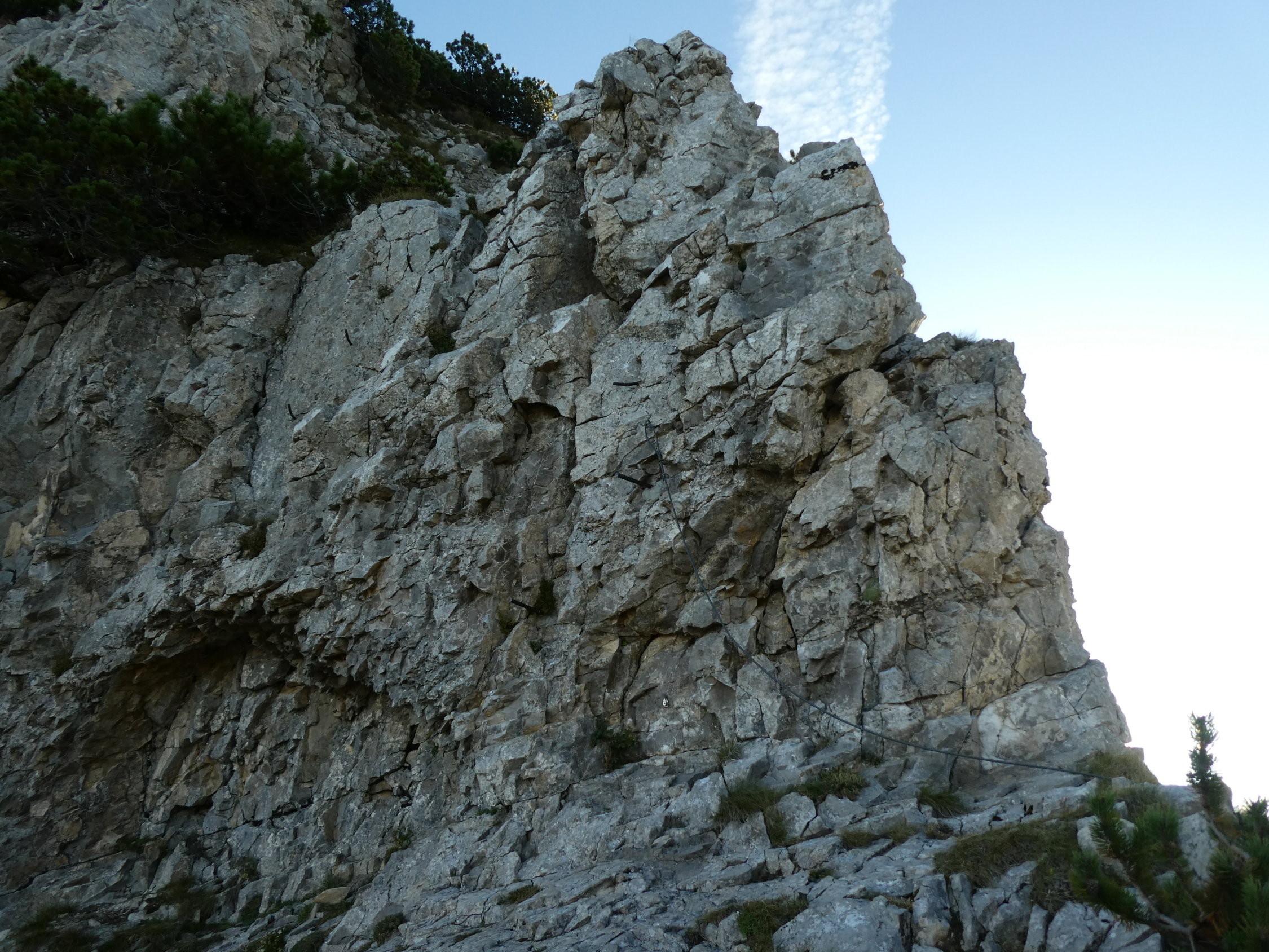 Am "Wändchen" ist, wie im Tourenbeschrieb von summit erwähnt, weiterhin nur das untere Seil montiert. Weiter oben geben nur noch Eisenstifte und ein Ring Halt.