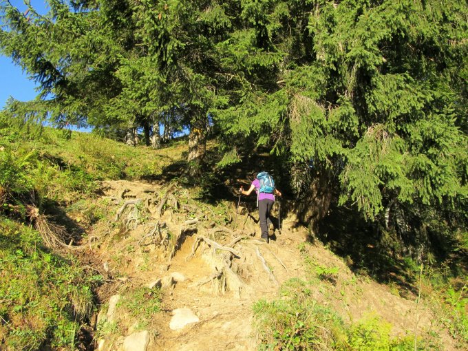 Der Aufstieg auf den Chüemettler durch die mit Nagelfluhbändern durchsetzte, steile Westflanke war unerwartet nass und schmierig. Einige Nagelfuhpassagen sind mit Ketten, Haltegriffen oder Eisenstiften versehen, was angesichts der Verhältnisse kein "Luxus" war.