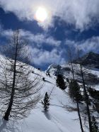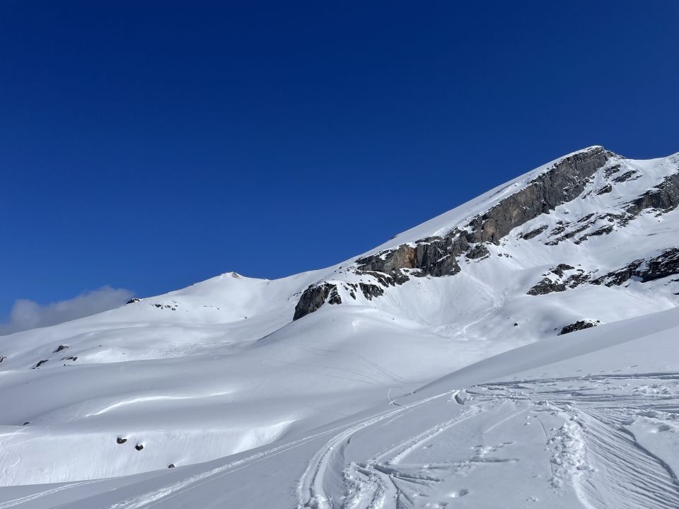 Morgens bewölkt und warmer Start um 09:20 Bergstation Sunnbüel. Immer noch viel Neuschnee. Schneedecke nass bis ca 2500müM (!), zt mit leichtem Deckel. Couloirs der Region mit viel Neuschnee gefüllt. Ganztägig eindrücklicher lärmiger Abgang derselben va südseitig. Gute Aufstiegsspur; Spur an einer Stelle von einem paar Tage alten grossen Schneebrett überspült (von felsiger NW Flanke des oberen Tatelishorn, ca 100m breiter Anriss). Ab unterem Tatelishorn gegen oberes T. Horn in Presspulver, grosse Wechten gegen das Gasteretal. Ab 2600m instabile Schneedecke; kuchenblechgrosse, 15cm dicke Rutsche auslösbar. Ausweichung auf Felspassage. Auf 2650m jedoch bis zu den Knien im Puder, daher Umkehr. Bislang keine Spur bis Gipfel oberes Tatelishorn. Insgesamt tückische Verhältnisse meines Erachtens. Abfahrt in feuchtem Pulver mehrheitlich super osterwürdig! Spittelmatte mit Sommerschnee. Etliche Tourengänger in der Altelsflanke, Abfahrt sah super aus.