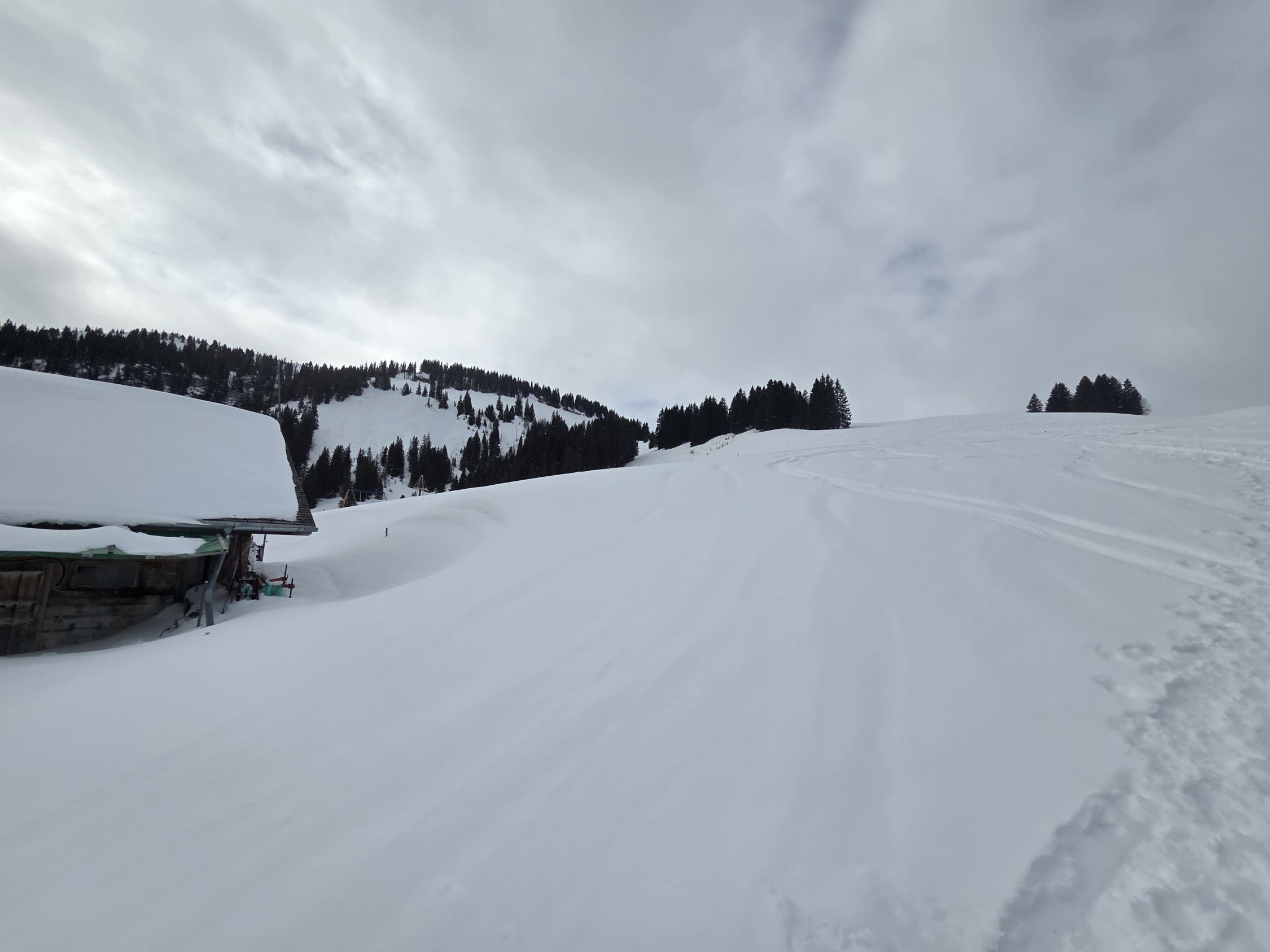 Ab dem Parkplatz dann genug Schnee bis oben.