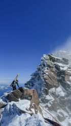 Dennoch möchte ich auch kurz betonen, dass es auf dem W-Grat Stellen gibt, wo ich mir kürzere Ski am Rucksack gewünscht habe. V.a. durch einen Spalt zerkratzt man die Ski ausnahmsweise mal auf die oberen Seiten. Kurz vor dem Gipfel musste ein Felsaufbau nördlich abschüssig umgangen werden; hier bin ich wegen den Ski noch ein paar Meter auf einem Schneeband gekrochen. Aber wo ein Wille ist, ist immer auch ein Weg. Ich möchte diesen Übergang deswegen sicher nicht missen. Denn es sind genau solche unvorhergesehene Situationen, die eine Tour zu einem unvergesslichen Erlebnis machen!