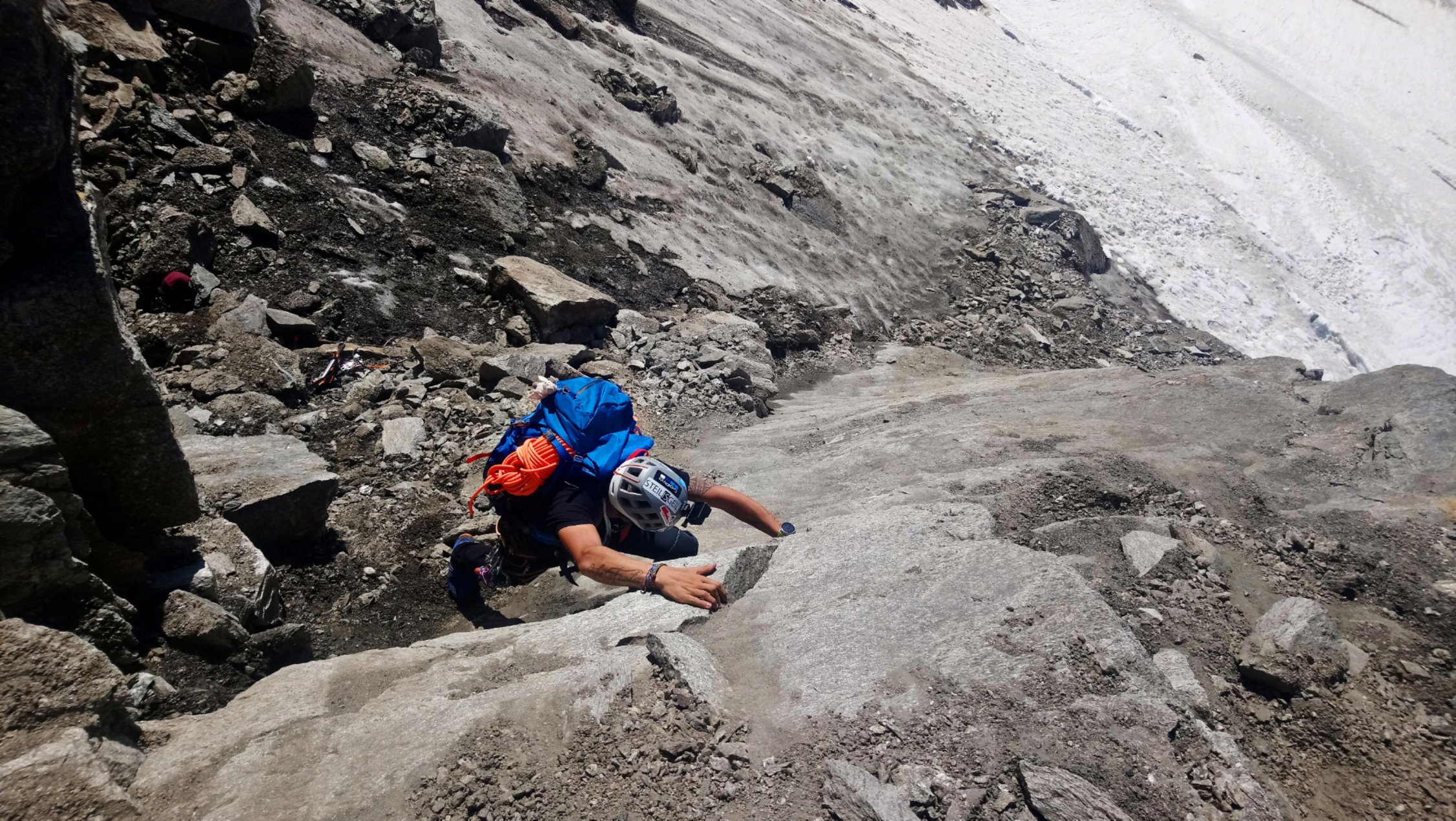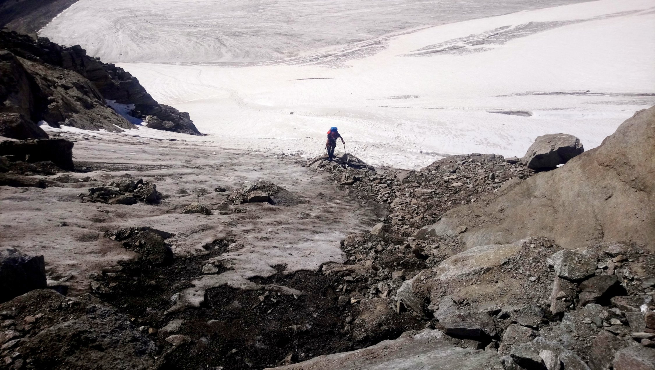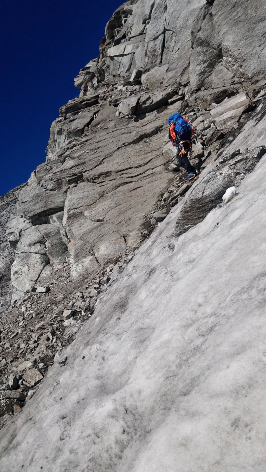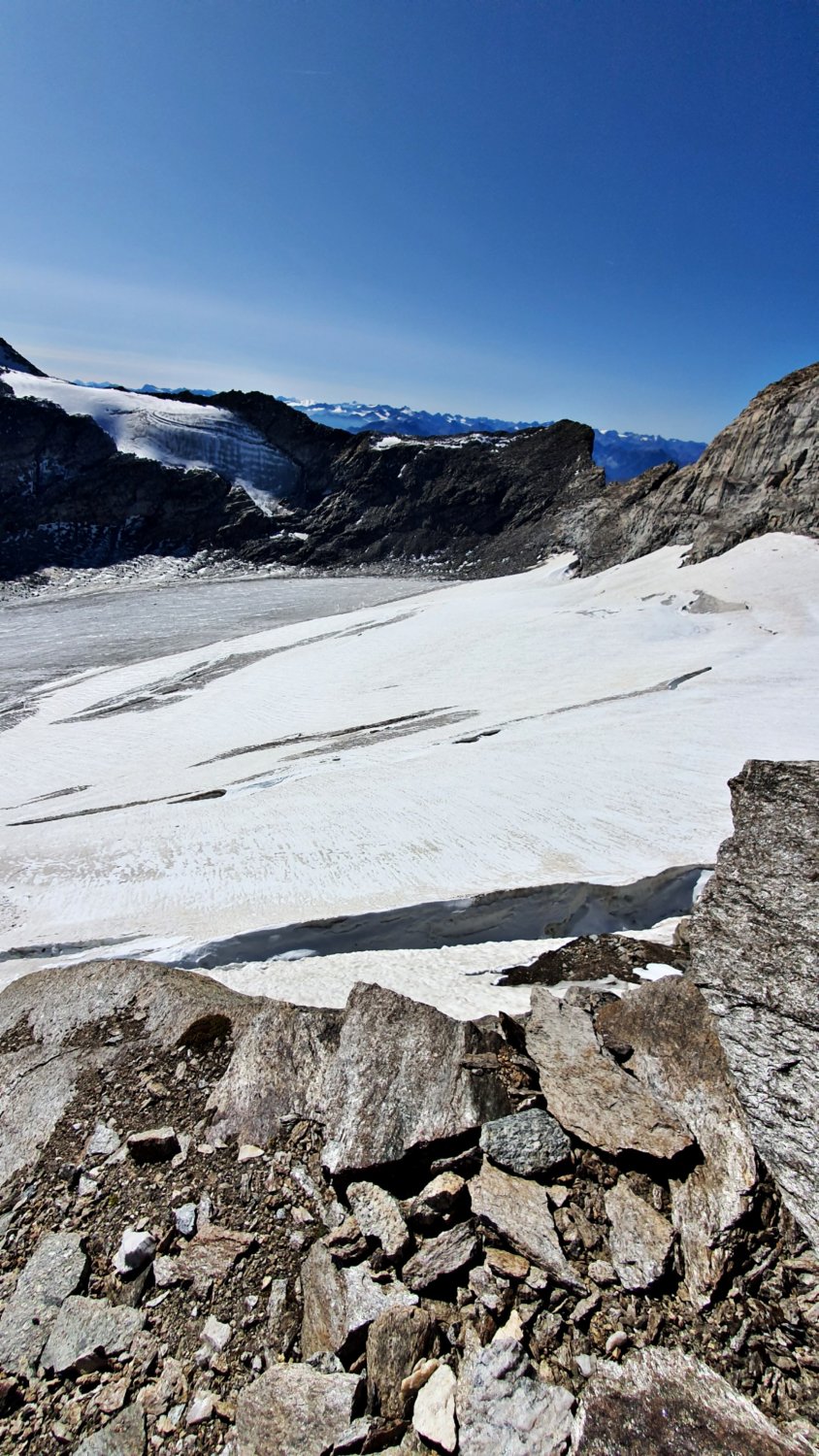 Am Stampflkees sind ein paar Schnee Brücken zum Überwinden. Diese wirken aber zum Teil noch recht stabil. Der Übergang vom Gletscher zum Südgrat gestaltet sich als schwierig da hier ein Felssturz war und nun eine ziemlich glatte und zum Teil Griff arme Fels Platte zum Überwinden ist. Der Südgrat selbst ist aktuell Schneefrei .