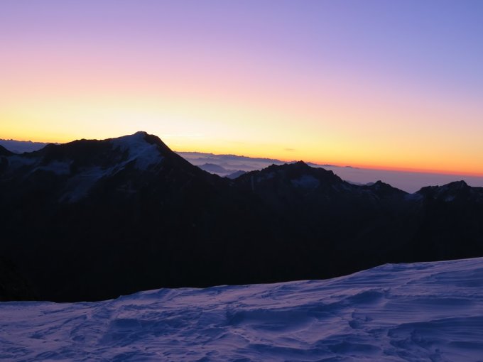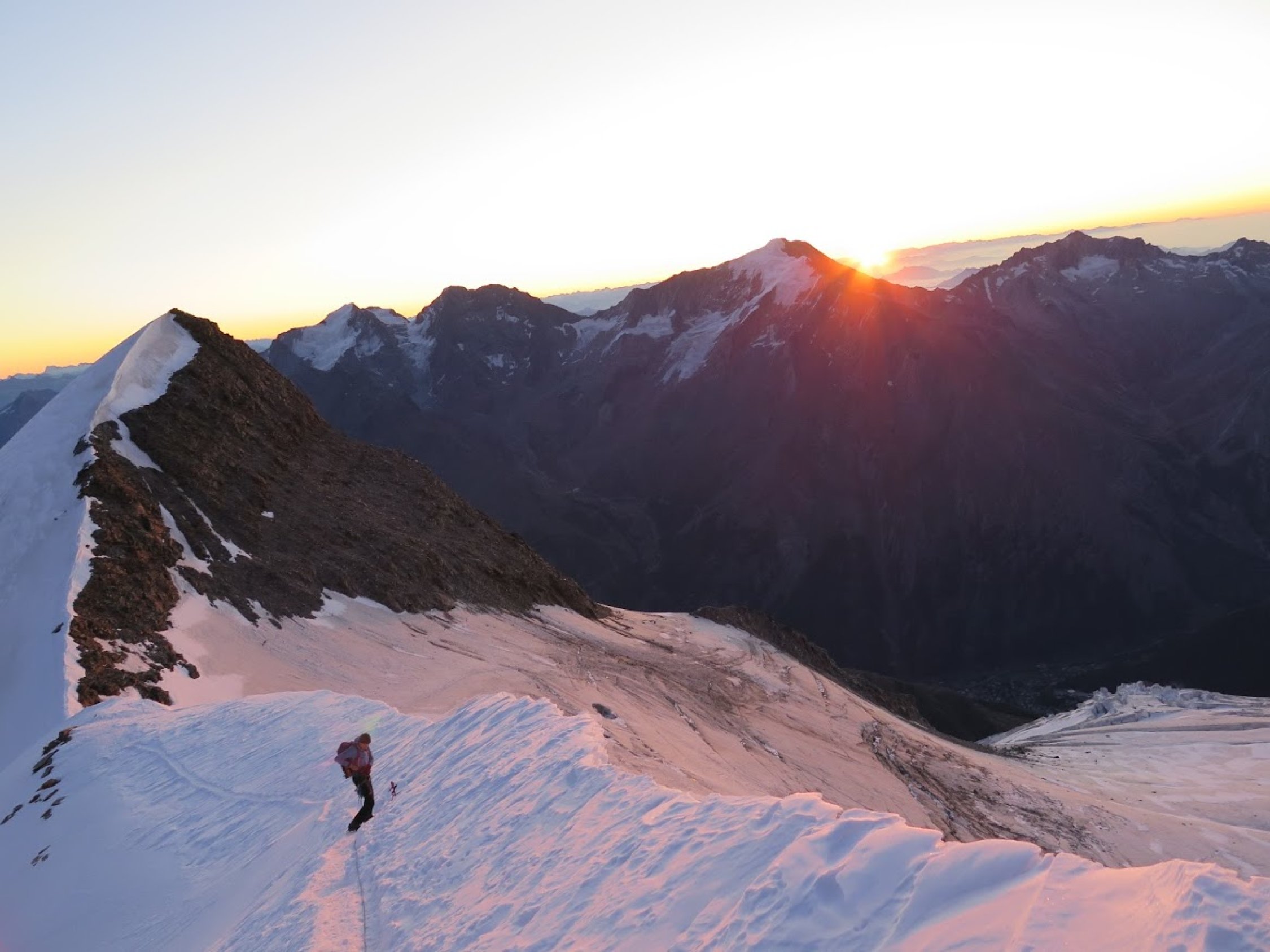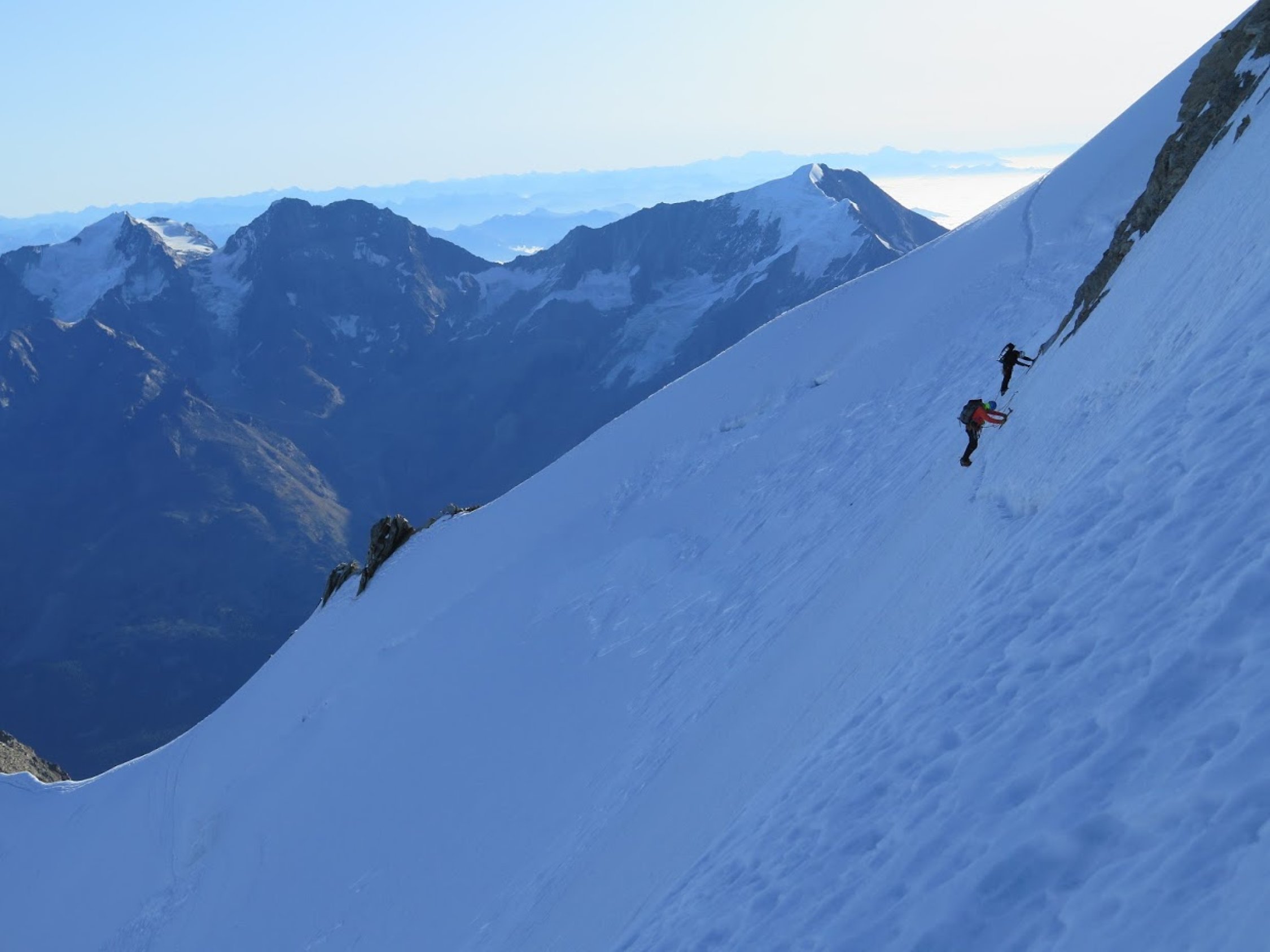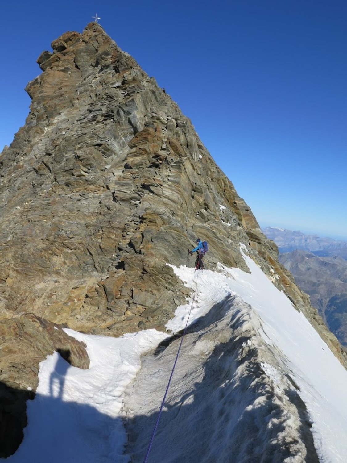 Die Traverse durch die steile N-Flanke des Nadelhorn zum gegenüberliegenden Stecknadeljoch ist aktuell die Schlüsselstelle wegen Blankeis oder z.T. wenig Firnauflage. Vom Stecknadeljoch über den schönen, fast schon wie ein flacher Biancograt geschwungenen Schneegrat zum felsigen Gipfelkopf, den man unschwierig in wenigen Minuten erreicht.