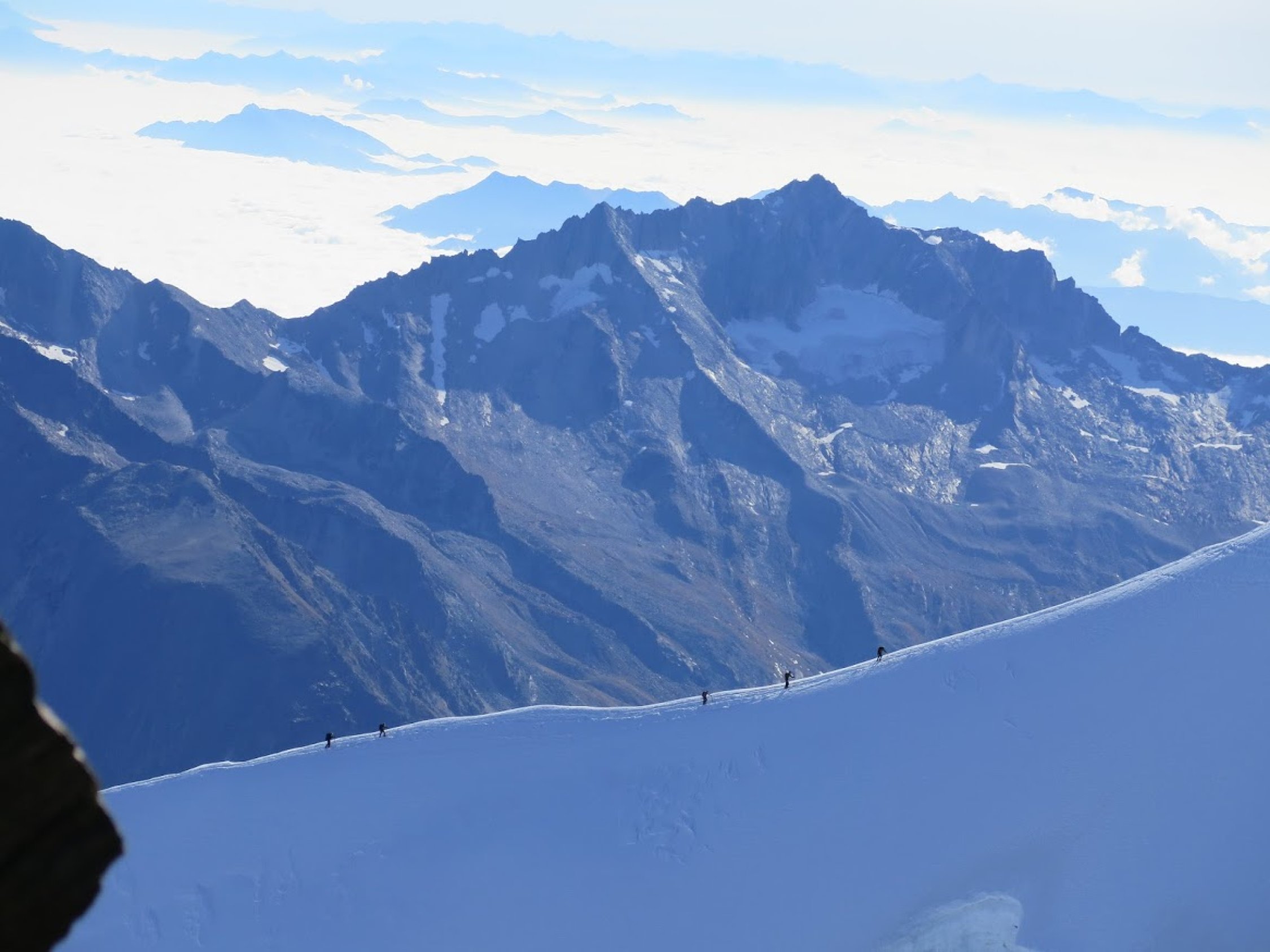 Bis auf den aperen, v.a. morgens etwas unangenehm harten Hang zum Windjoch hoch und zwei kurze Stellen (jeweils 2 Meter) mit Blankeis auf dem Grat Richtung Nadelhorn gute Verhältnisse.
