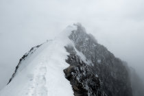 Der erste Felsaufschwung nach der Scharte sollte besser überklettert werden, die östliche Umgehung auf dem Felsband endet an einer steilen Blankeisrampe, die dann zum Grat führen würde. Die Haifischflosse dagegen konnte entgegen der Aussage der Hüttenwirtin noch gut im Firn umgangen werden, die Spur ist allerdings schon eisig.