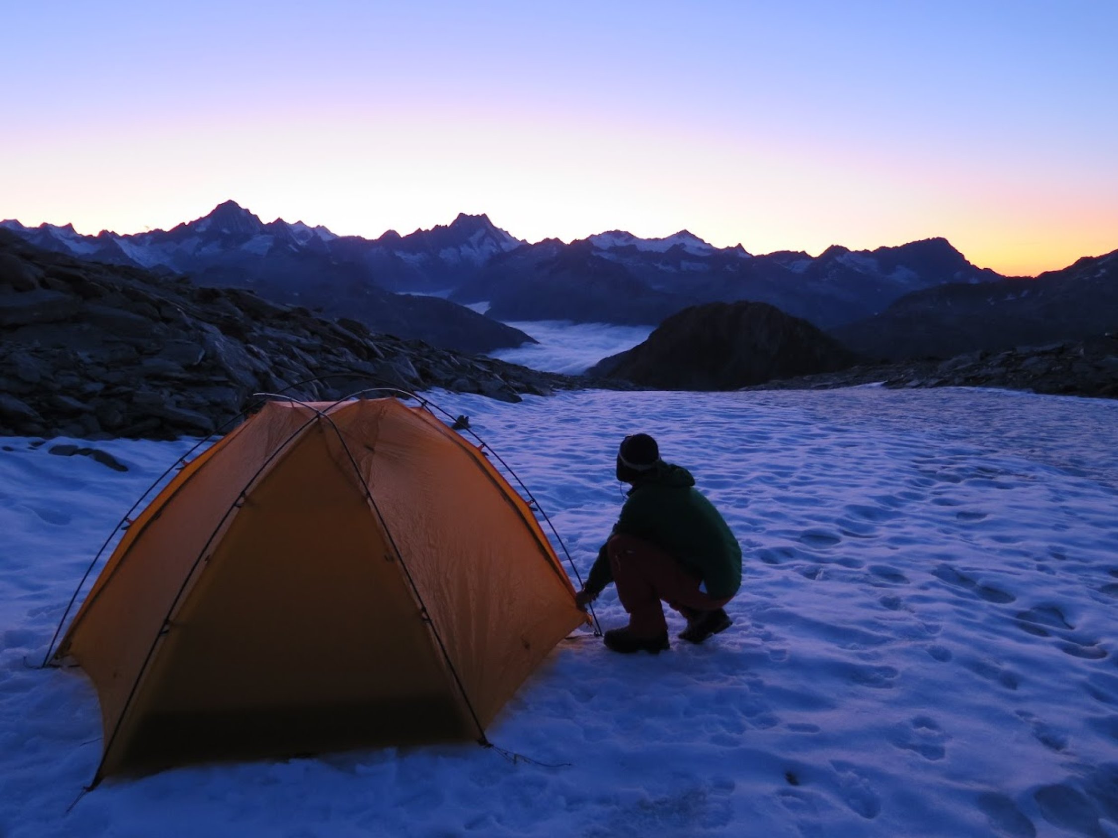 Zum Akklimatisieren am Donnerstag vor dem Stecknadelhorn nach der Fahrt zum Furkapass am Nachmittag über den Wanderweg hoch zum Groß Muttenhorn. Vor dem Gipfel kann man auf 2900m ein schönes Zeltbiwak einlegen, um etwas Höhenluft zu tanken und so einen grandiosen Sonnenuntergang genießen mit Blick auf die hohen Berner Berge und das Rhonetal.