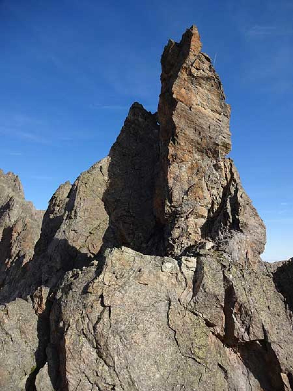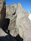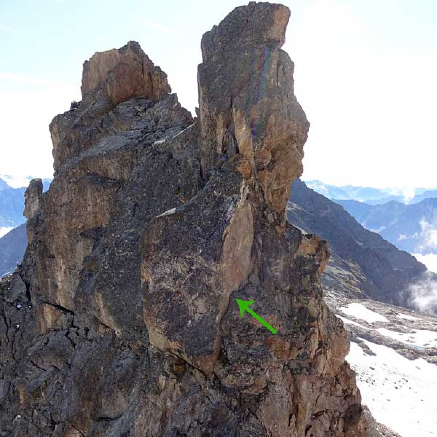 nun beginnt die überschreitung langsam wilder zu werden: die kletterei wird steiler, die wegfindung schwieriger und der fels unzuverlässiger. wenn man vom nun folgenden ersten turm absteigt und nach der nordostseitigen traverse zum nächsten turm gelangt, hofft man, den folgenden steilen zahn duch die spalte ostseitig umgehen zu können (siehe foto). doch hiermit handelt es sich um eine sackgasse. also klettert man linkshaltend zum podest vor dem turm hinauf, wo wiederum kein weiterweg zu finden ist. darum seilten wir an einem block (nicht eingerichtet) 15m nach westen ab, stiegen von hier auf einem offensichtlichen band in die brüchige nordseite und seilten von dort wiederum an einem zacken (ebenfalls nicht eingerichtet) nochmals 12m ab (auch an äusserst losem felsen abkletterbar). (hier könnte der grat wiederum durch eine steile, rutschige rinne verlassen werden). der weiterweg führt zunächst über wenig steiles, brüchiges schrofengelände an den nächsten turm, welcher an äusserst unzuverlässigem fels erklettert wird. auf dem turm angekommen merkt man, dass dieser wiederum nach norden überhängt und eine weitere abseilstelle an mürbem gestein nötig würde. da der weiterweg ebenfalls noch mit vielen, teilweise ebenfalls überhängenden zähnen gespickt ist, entschlossen wir uns hier, den rückzug anzutreten und in die scharte zurückzuklettern - nicht allzu angenehm bei diesem losen gestein. III bis IV, 4h
