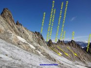 der gesamte grat weist insgesamt knapp 30 türme, nadeln und zacken auf, welche beinahe alle überklettert werden müssten. dies lässt sich auch von einer äusserst schnellen seilschaft kaum in den vom tourenportal angegebenen 4 bis 5 h bewerkstelligen, zumal nirgends eine abseilstelle eingerichtet ist, der fels je länger je brüchiger und auch die wegfindung immer schwieriger wird. der beschrieb aus dem "urner alpen west" (der im tourenportal ein-zu-eins übernommen worden ist) legt die vermutung nahe, dass die damalige seilschaft nach ungefähr einem drittel der tour auf den zu dieser zeit noch bis an den wandfuss reichenden gletscher ausgewichen ist und die letzten, brüchigen zwei drittel umgangen hat. wie anders ist zu erklären, dass die kletterei bis zu diesem punkt ziemlich detailliert beschrieben wird (inclusive einer heiklen stelle bei der umgehung des daumens), anschliessend aber mit keinem wort mehr der weitere verlauf angedeutet wird. zudem wird das gelände deutlich heikler als bei der umgehung des daumens, auch wird die wegfindung immer schwieriger. ferner müssen immer wieder improvisierte abseilstellen eingerichtet werden, teilweise an fraglichem gestein. dies alles wird mit keinem wort erwähnt!