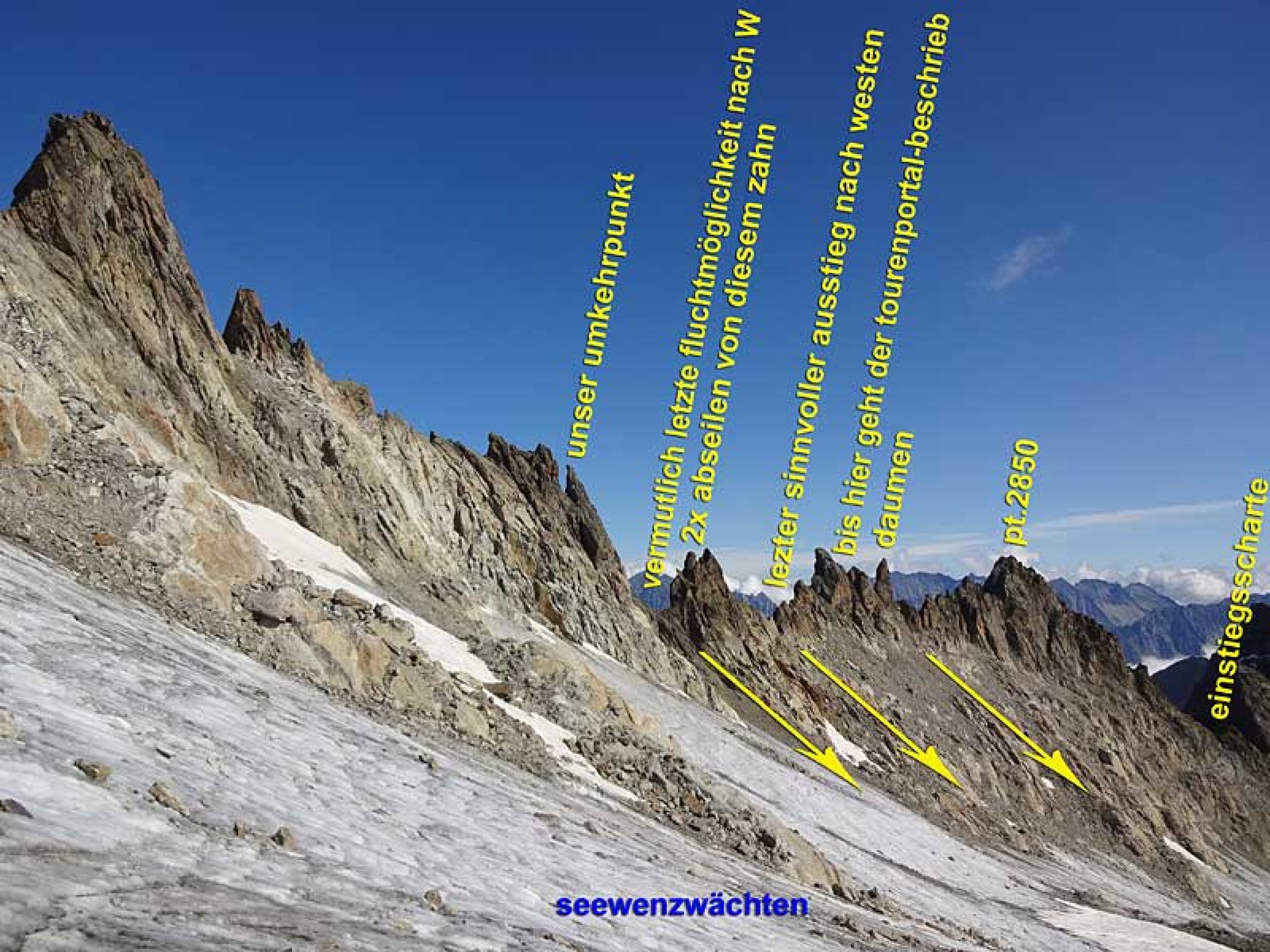 wenn man den pass nördlich des spitzplanggenstockes so wie wir über die felsen auf die südliche scharte erklimmt, muss zunächst ein einfacher kleiner turm überklettert werden. hier wird angeseilt. nun gehts in vergnüglicher, nicht allzu schwieriger kletterei auf den ersten markanten turm (2850m). nach dem abstieg von diesem turm folgt ein erstes auf und ab über mehrere türmchen und zacken. die zwei letzten zähne vor dem markanten daumen können auf der westseite umgangen werden (hier befindet sich die erste fluchtmöglichkeit nach westen zum seewenzwächten). der senkrecht aufragende daumen selber wird nicht überklettert, sondern auf einem absteigenden band richtung osten umgangen. kurz muss nun ein felsausbruch traversiert werden, der im text als heikel beschreiben wird. verglichen mit dem, was später kommt, ist diese stelle allerdings ziemlich harmlos. durch einen riss gelangt man zurück an den grat und erklettert den nächsten kleineren turm auf einer nach links führenden rampe. für den abstieg auf dieser rampe wieder ein paar meter zurück, dann östlich absteigen. der nächste, höhere turm bietet wieder genussvolle kletterei. beim abstieg von diesem turm werden nochmals drei oder vier zähne überklettert. hier hört der beschrieb sowohl aus dem alten führer wie aus dem tourenportal auf. tatsächlich kann hier gut nach westen zum seewenzwächten abgestiegen werden, was wir allen bergsteigern auch empfehlen würden. das tourenportal vermittelt zudem fälschlicherweise den eindruck, dass sich gleich in der nähe dieser scharte der einstieg zum SE-sporn befinden würde.