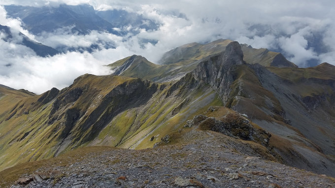 Die heikelsten Stellen sind die Umgehung des Foostöcklis und der Abstieg über das steile Schrofengelände nach P.2310. Den Einstieg zur Foostöckli-Umgehung ist etwas schwierig zu finden, da es eine deutliche Wegspur gibt, die von der Einstiegsstelle wegführt. Ich stieg zu weit ab (bis auf 2460 m) und musste dann eine steile Runse wieder hoch, um die Umgehungspfadspur zu erreichen. Von dort sah ich dann rechts oben von meinem Standort aus das Drahtseil, welches über die ziemlich exponierte (und rutschige) Passage führt. Der Abstieg von P.2310 ist exponiert und rutschig (Erde vermischt mit feinem Schiefergeröll, oft sind grössere Schieferplatten von einer dünnen Dreckschicht bedeckt, was ein Sondieren mit dem Wanderstock nötig machte). Steinschlägiges Gelände, Vorsicht ist geboten, wenn andere Wanderer oder Tiere unterwegs sind. Wahrscheinlich haben Starkniederschläge den auf der Landeskarte eingetragenen Weg zerstört. Bei Nässe ist dieser Abstieg im Moment sehr heikel.
